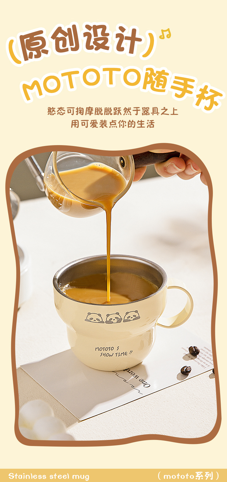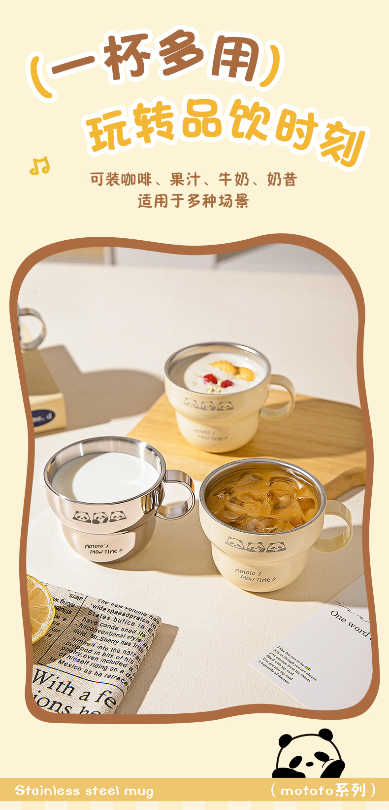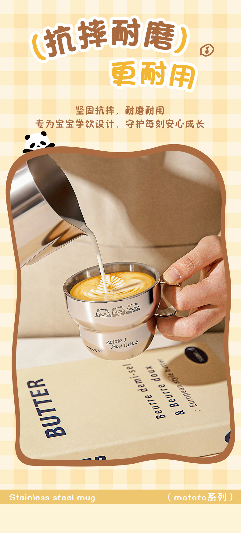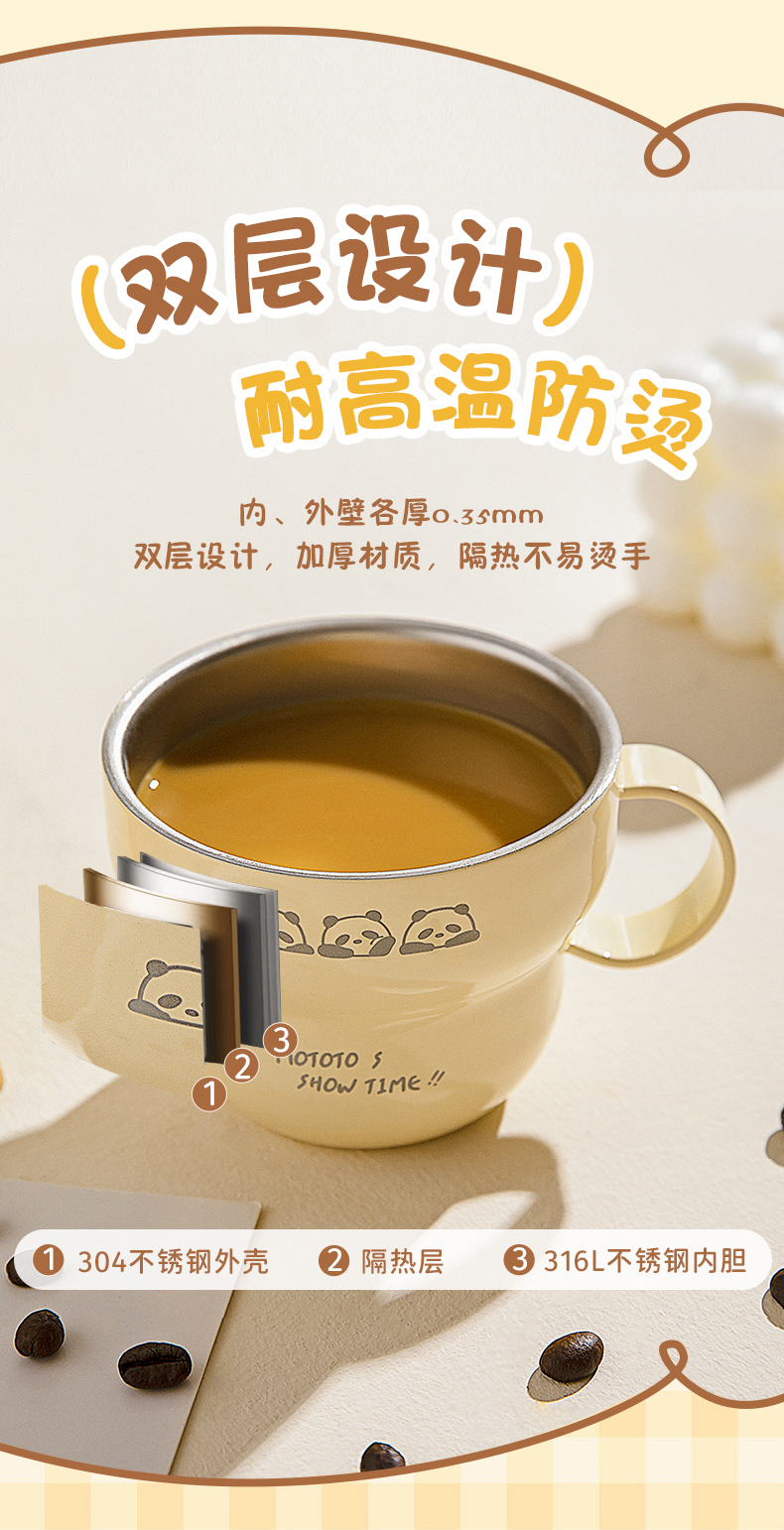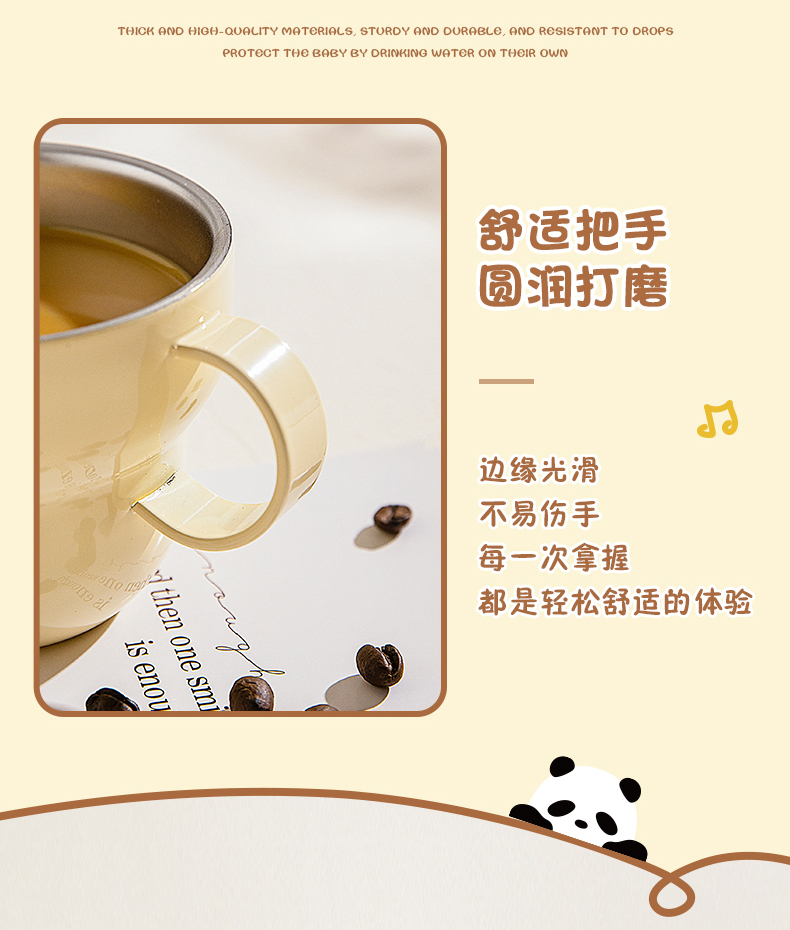 摩登主妇mototo熊猫316L不锈钢杯子儿童水杯家用防摔拉花杯咖啡杯