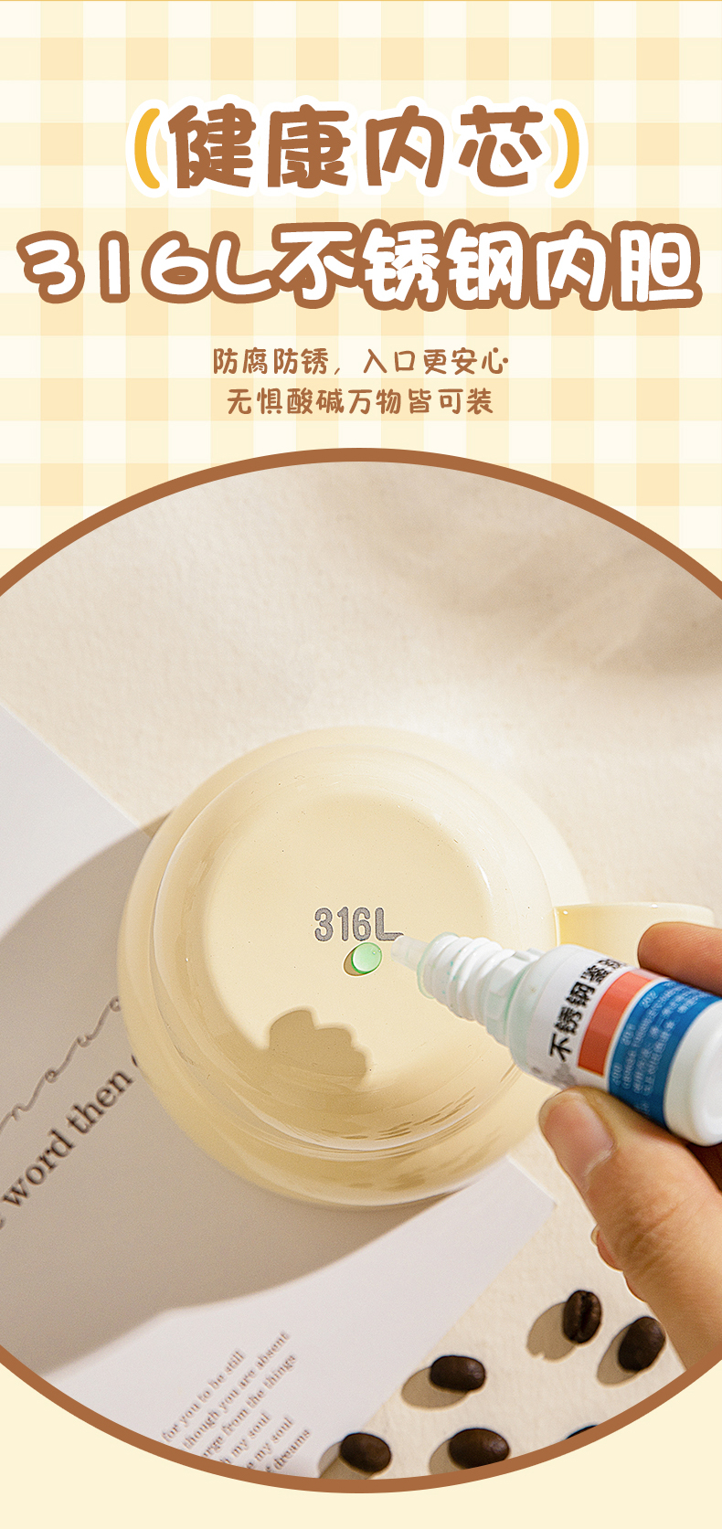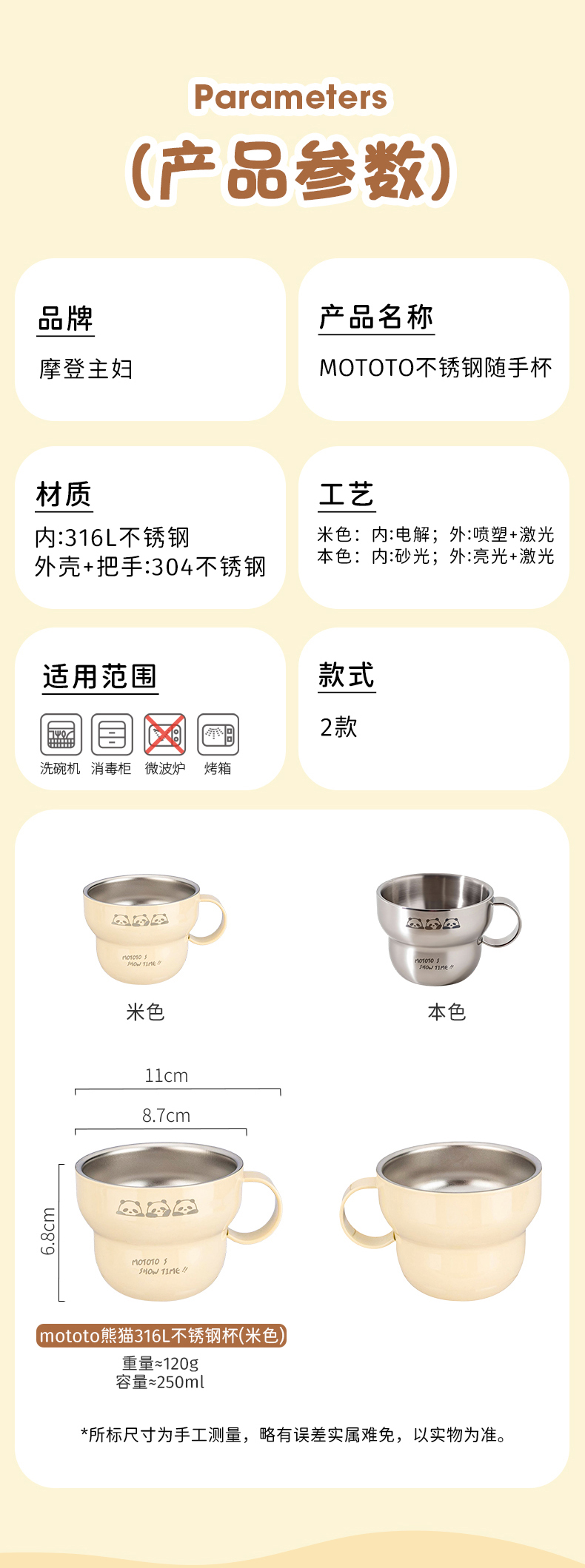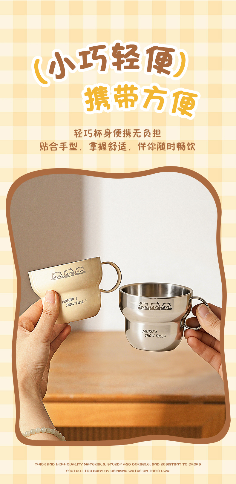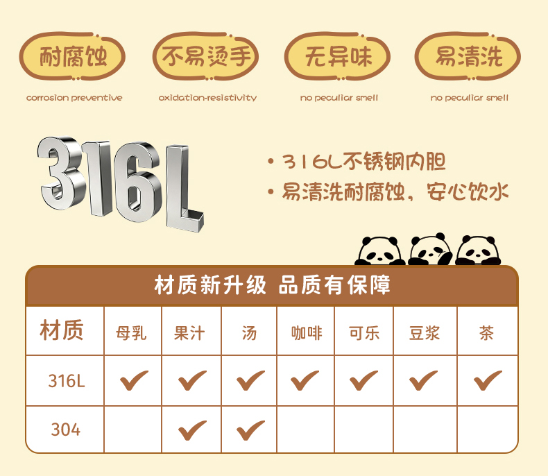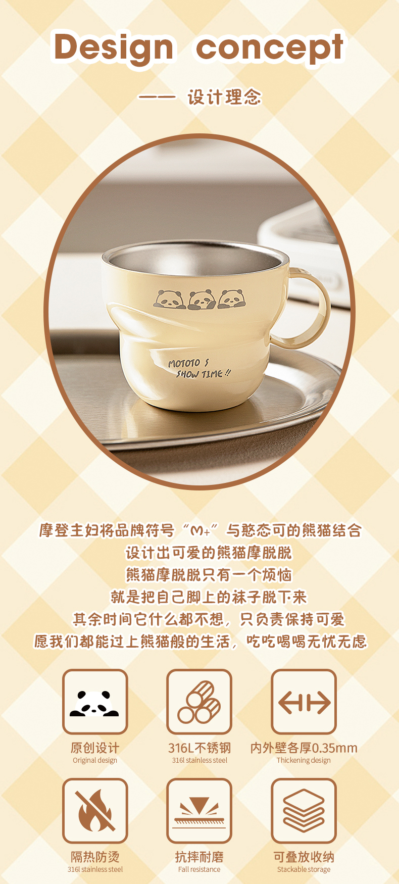 摩登主妇mototo熊猫316L不锈钢杯子儿童水杯家用防摔拉花杯咖啡杯