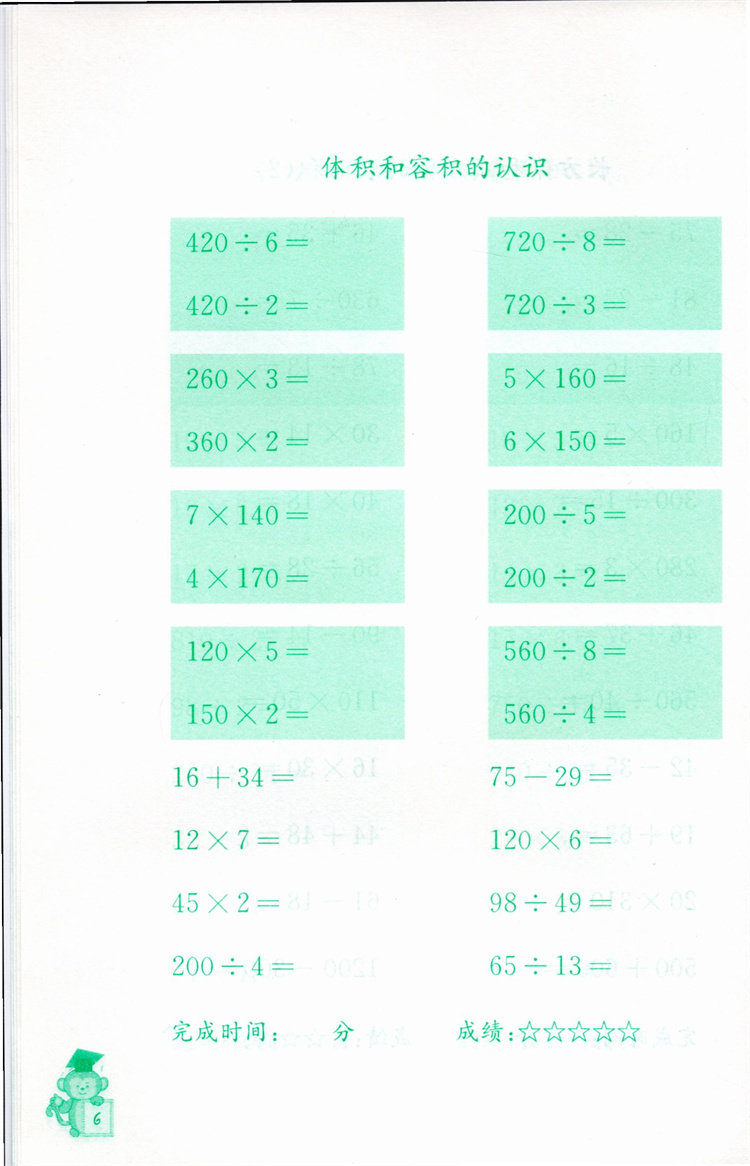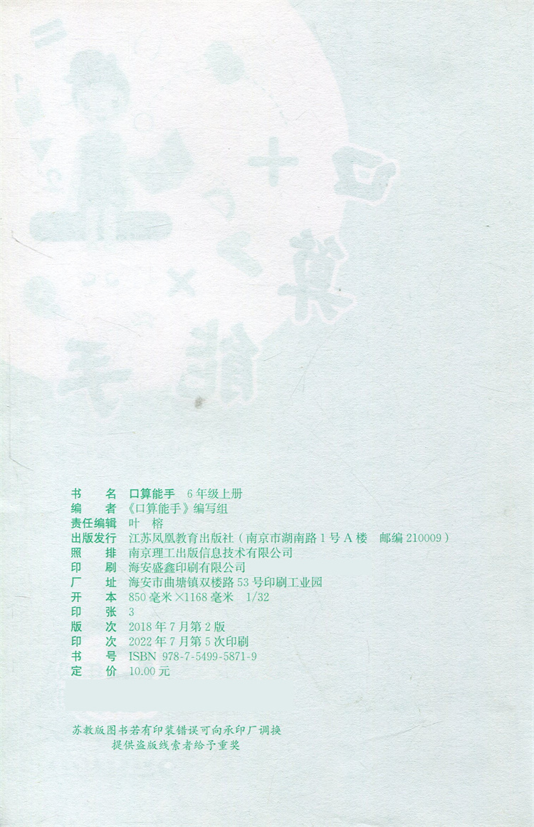 2022秋 口算能手 六年级上册 6上 小学数学 计算口算速算天天练 江苏凤凰教育出版社