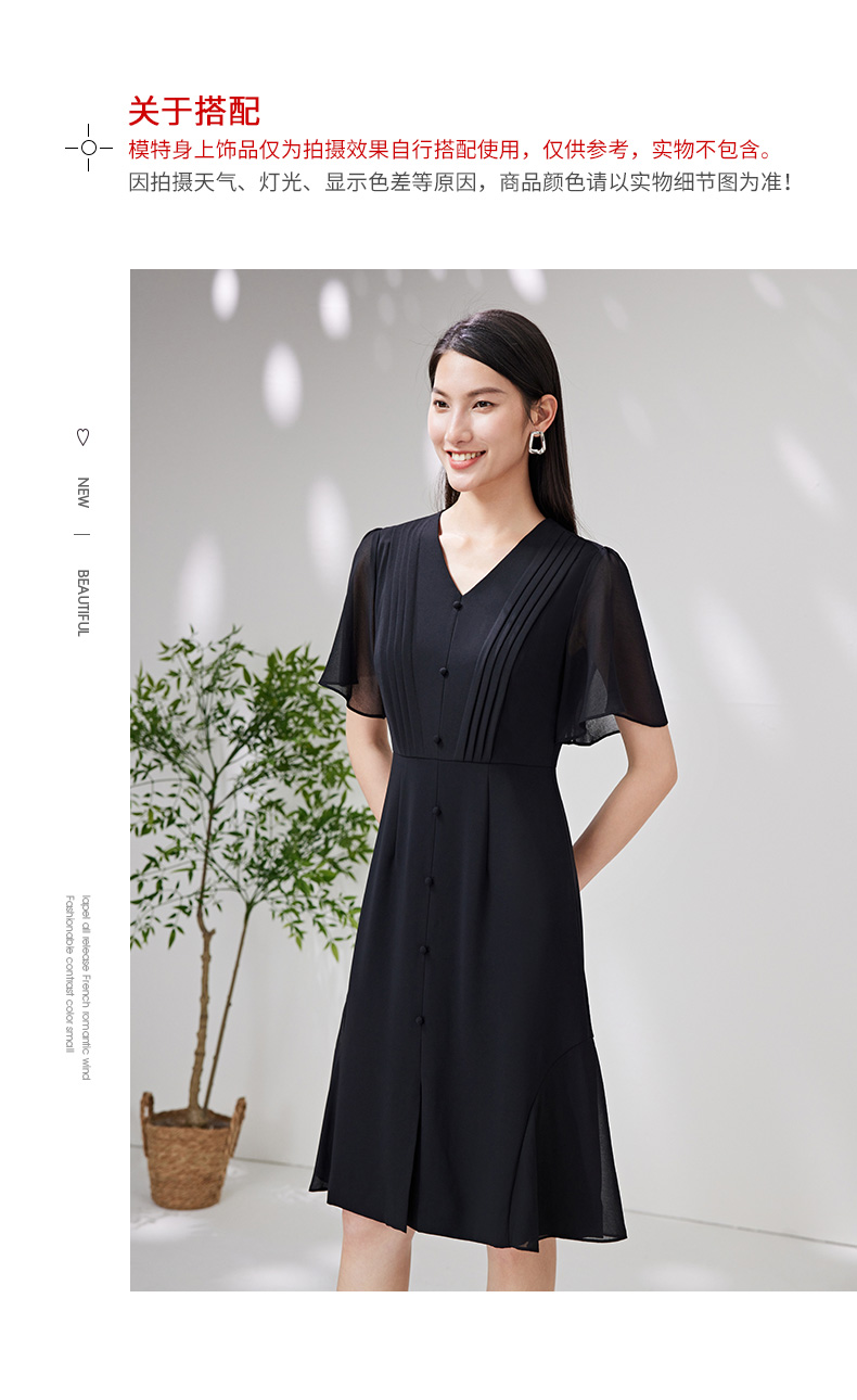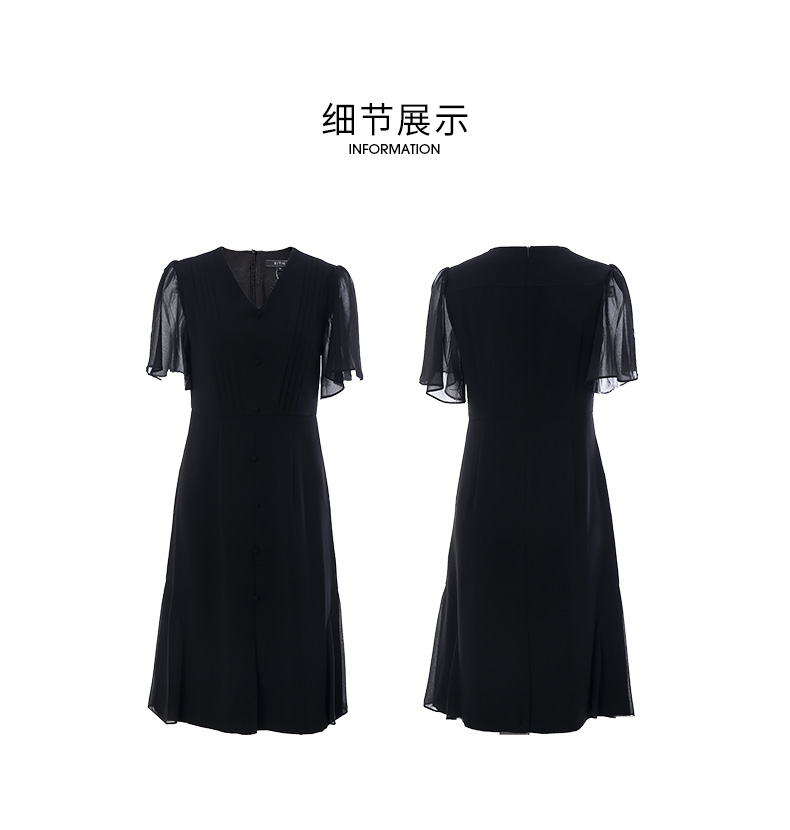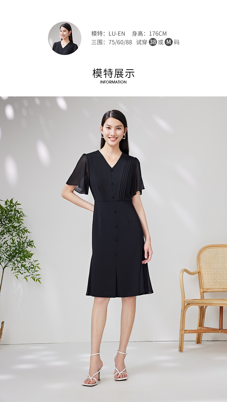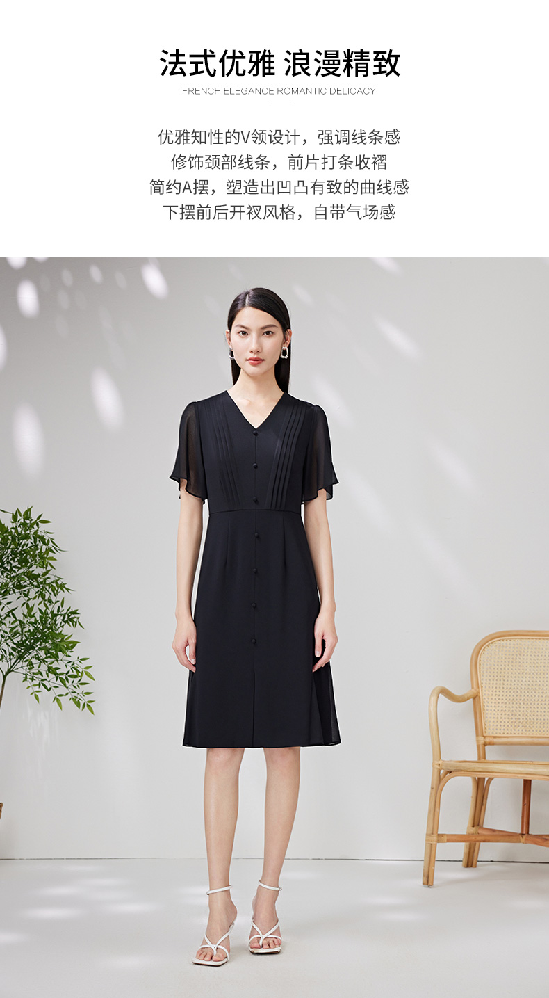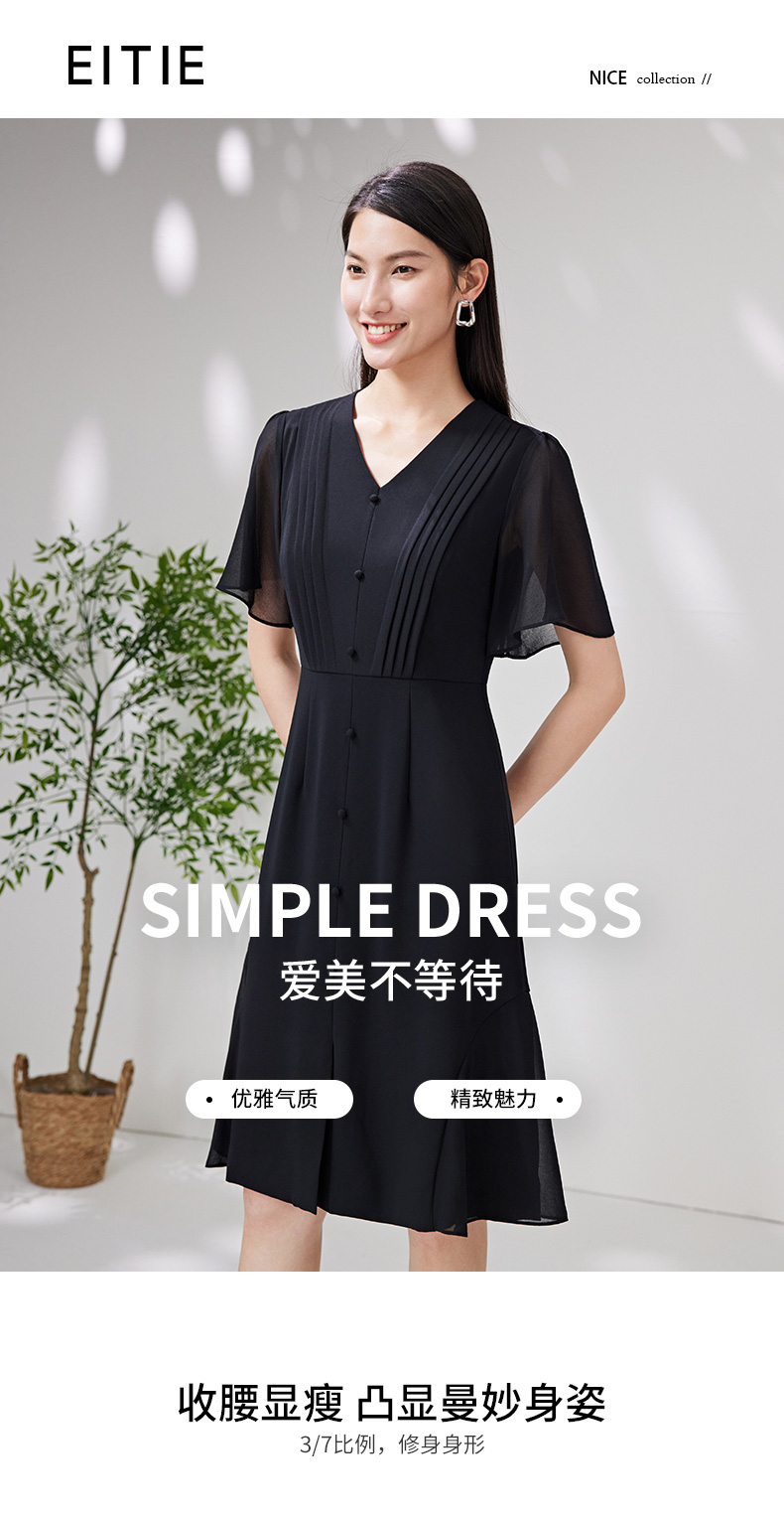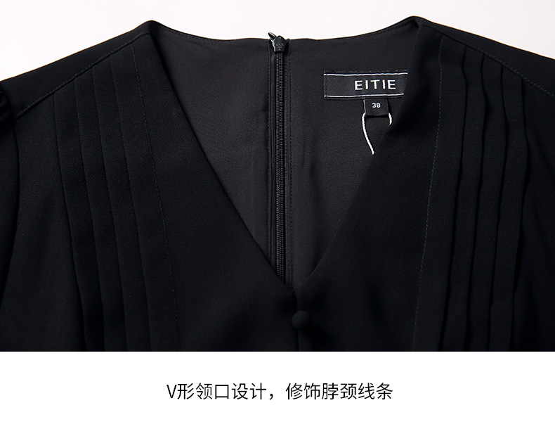 EITIE爱特爱夏季新款复古V领波点收腰抽褶五分袖显瘦连衣裙B2207914