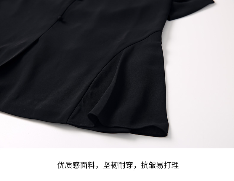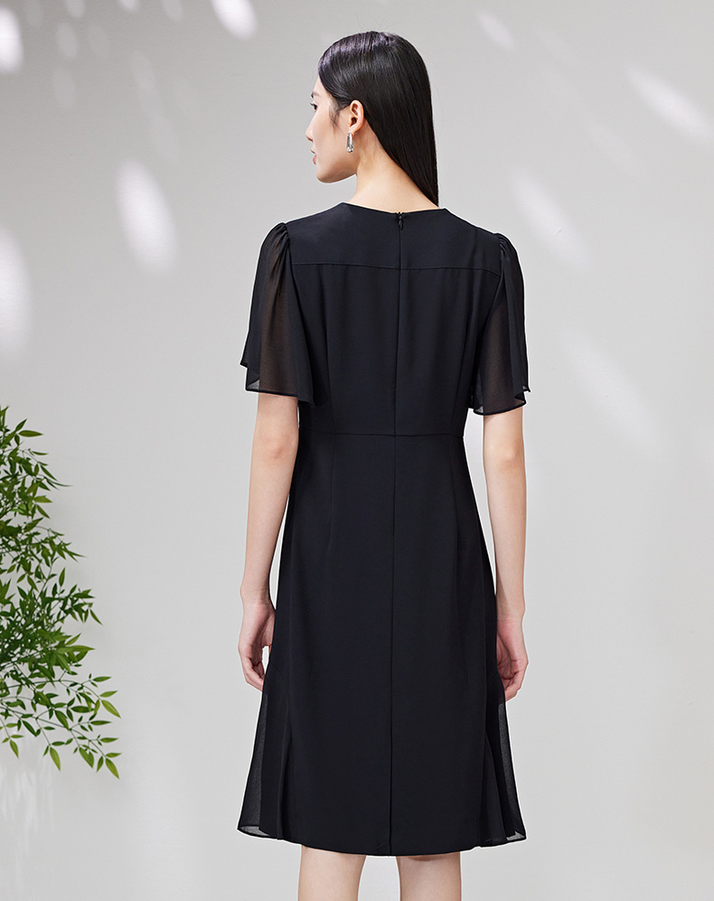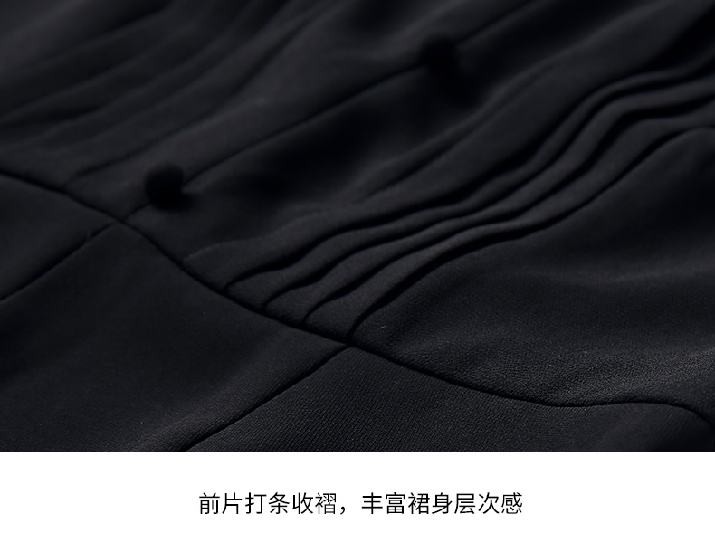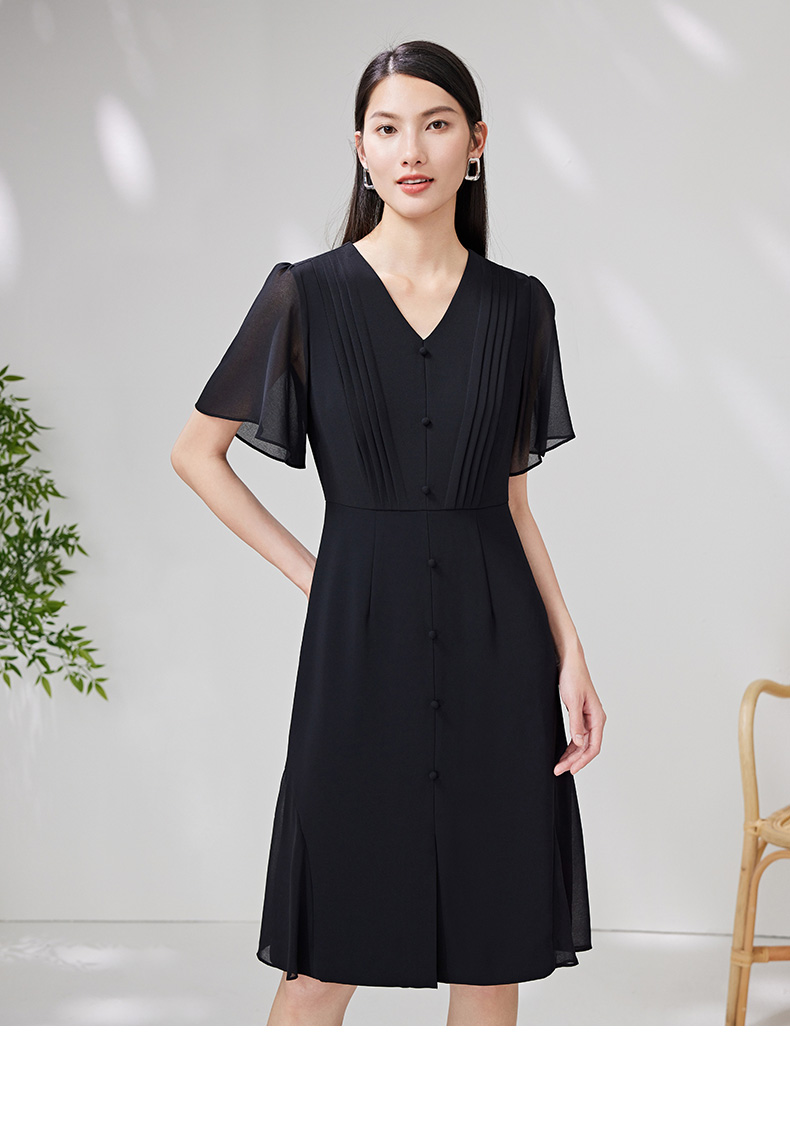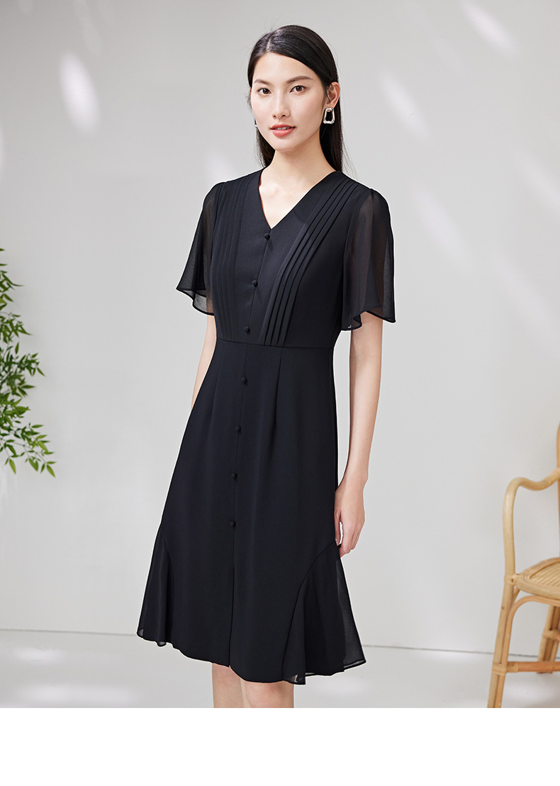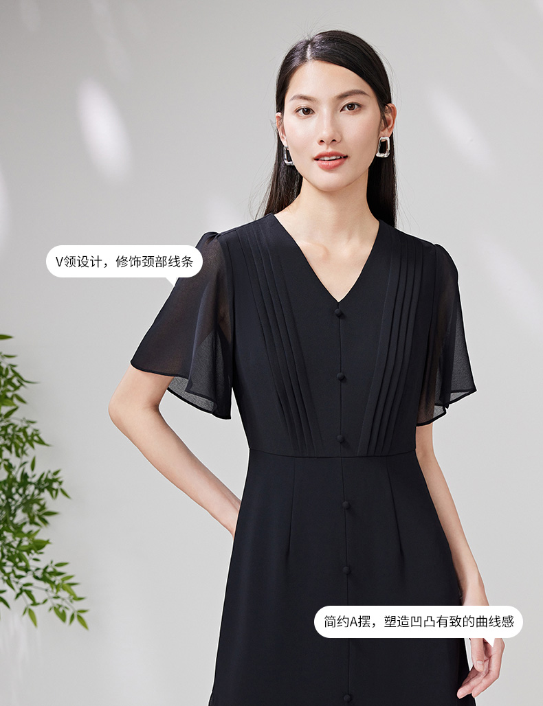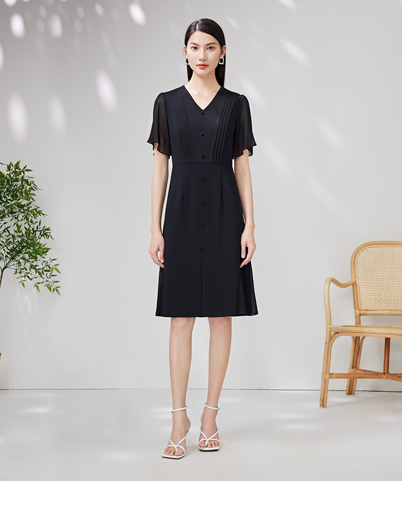 EITIE爱特爱夏季新款复古V领波点收腰抽褶五分袖显瘦连衣裙B2207914