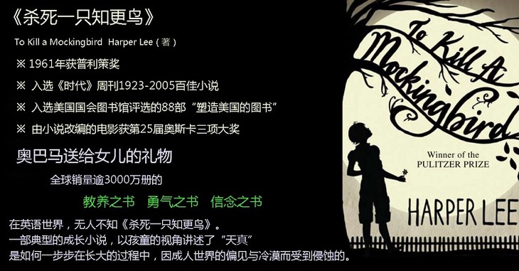 《杀死一只知更鸟》To Kill a Mockingbird从小女孩斯考特的视角,通过叙述她的律师父亲阿提克斯为遭到诬陷的黑人青年辩护的故事,揭露了美国大萧条时期南方各州存在的种族歧视问题。该书刚一出版便广受赞誉,于1961年获得普利策文学奖,此后一直都被列为美国学生必读经典文学作品。