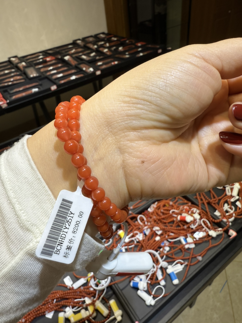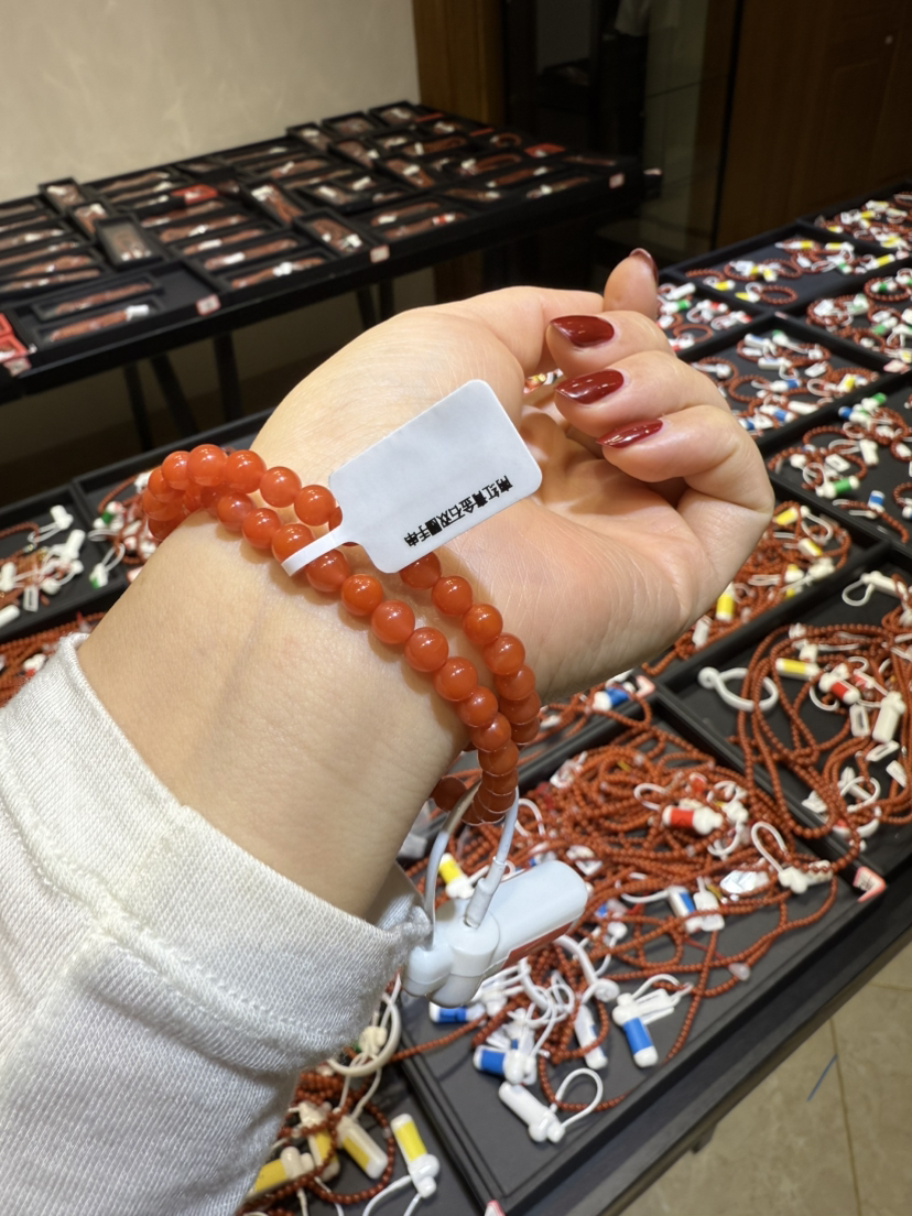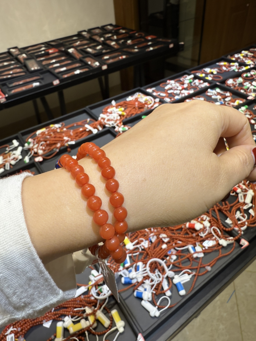 我们一直都卖固定的单圈,这种设计款的,我也囤了几条。南红柿子红,有色有肉哈,不是外面的冰红,所以是炒鸡有性价比的弹力双圈。柿子红的点位5.8咪左右,叠带相当和谐。
