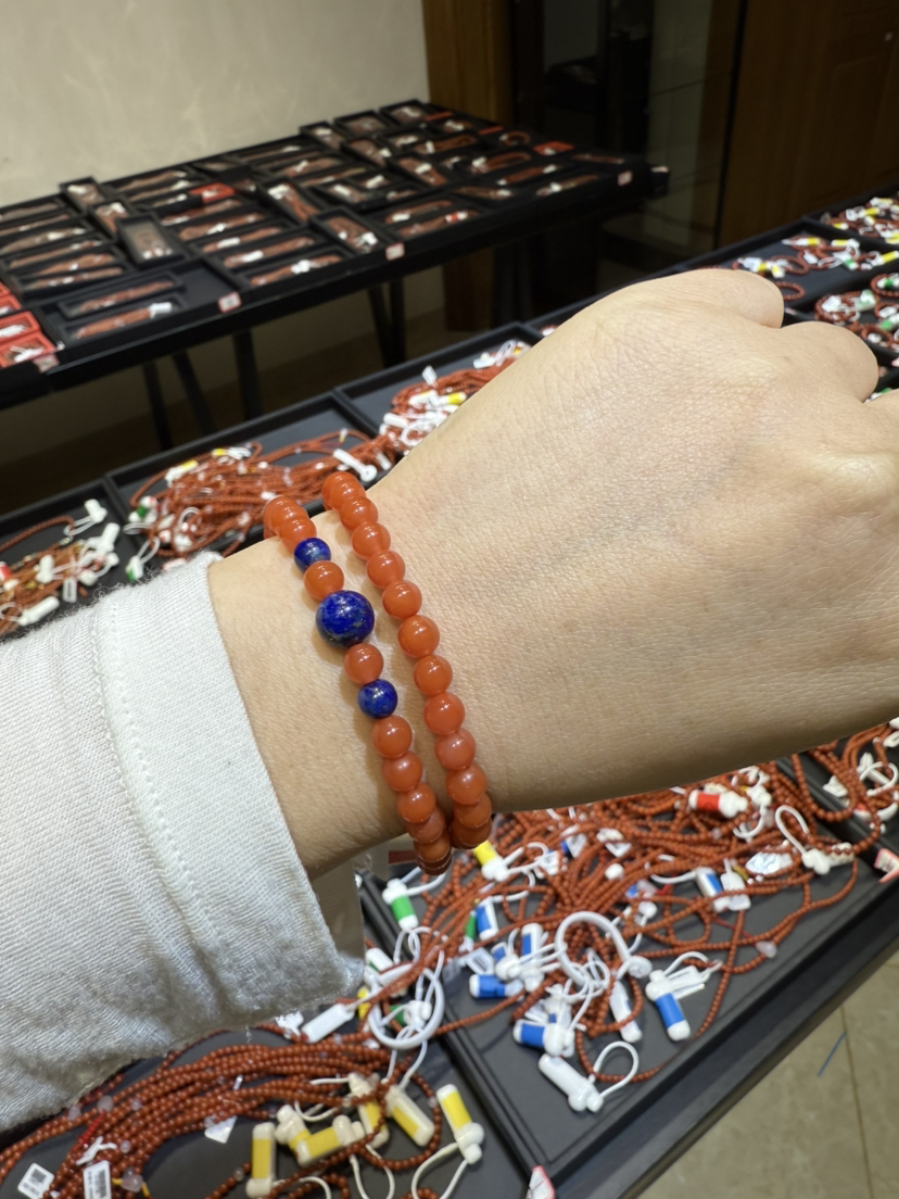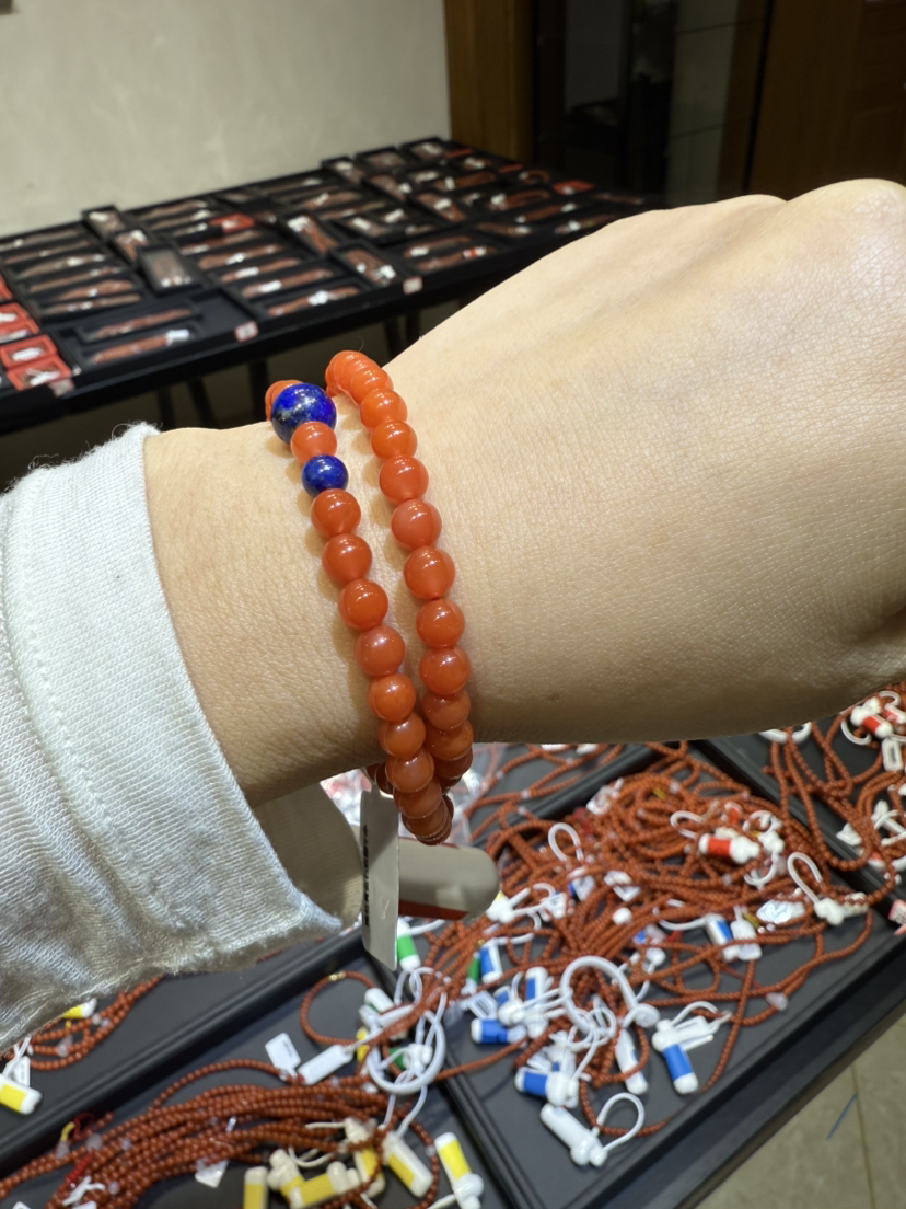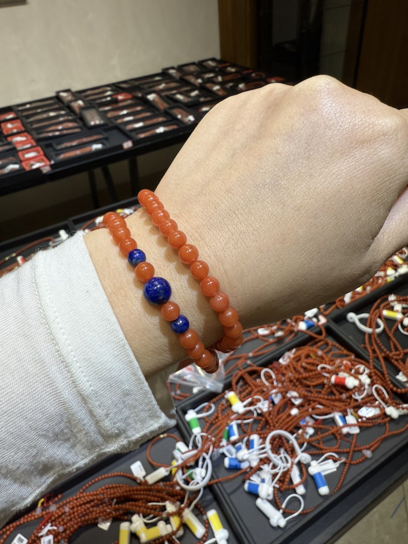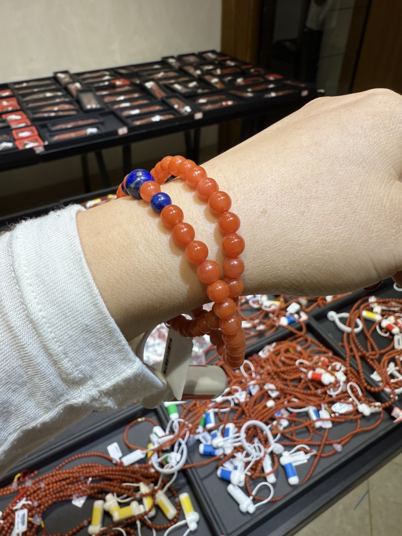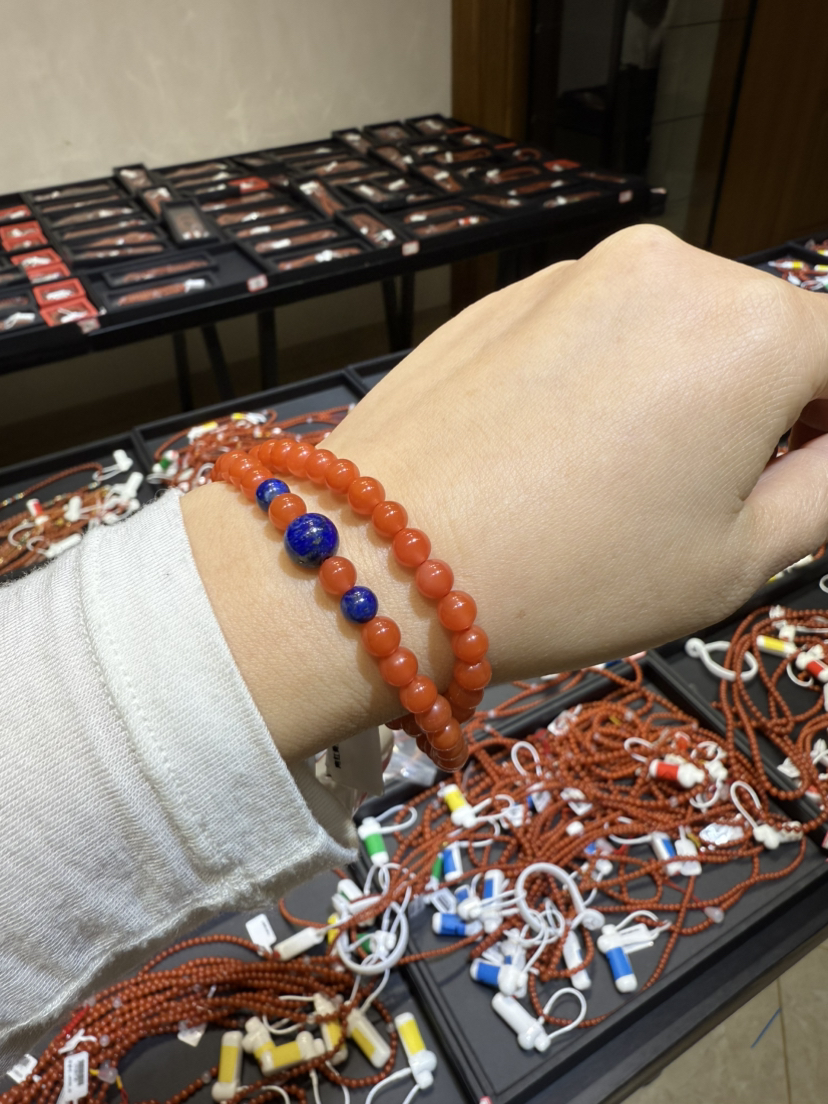双圈设计,西山路柿子红,比较润,七分肉,颜色属于七分红三分黄的柿子红。设计款中的跑量款,起码是原矿原切,不是外头乱七八糟的珠子。搭配三颗青金石,就多了一丝丝设计感,自古红蓝出CP,能量平衡艺术
