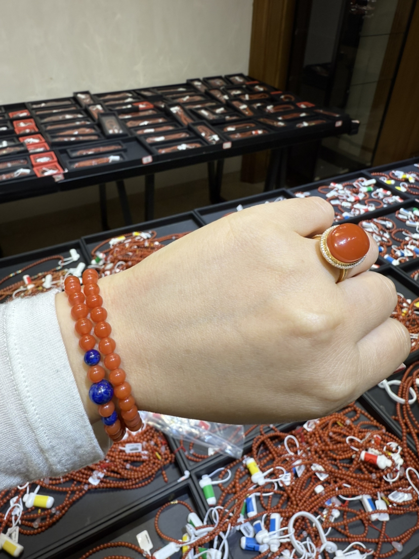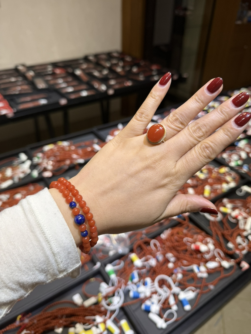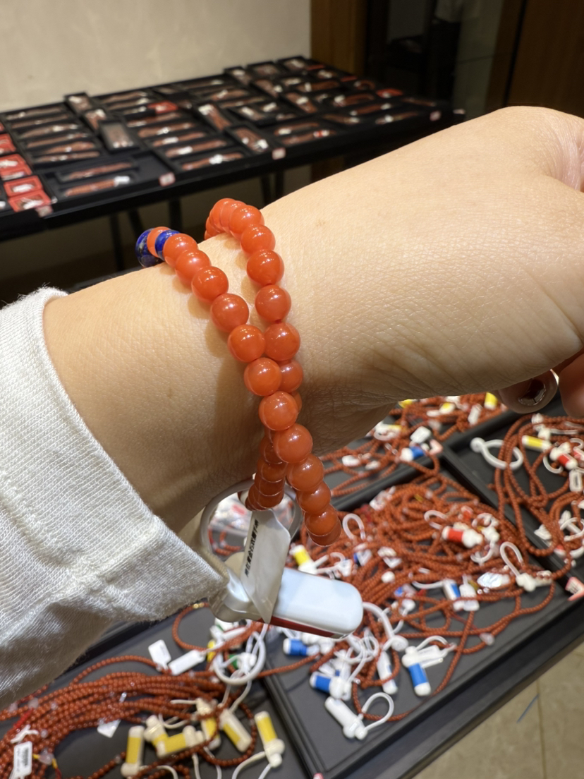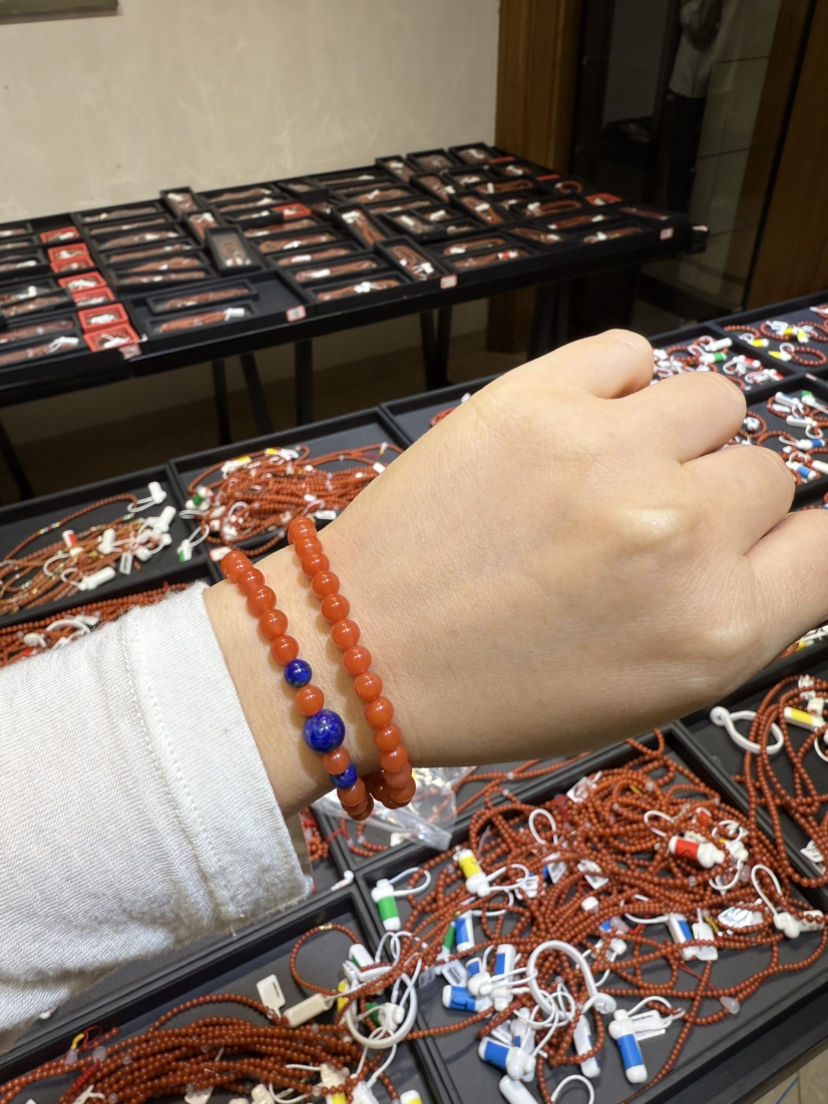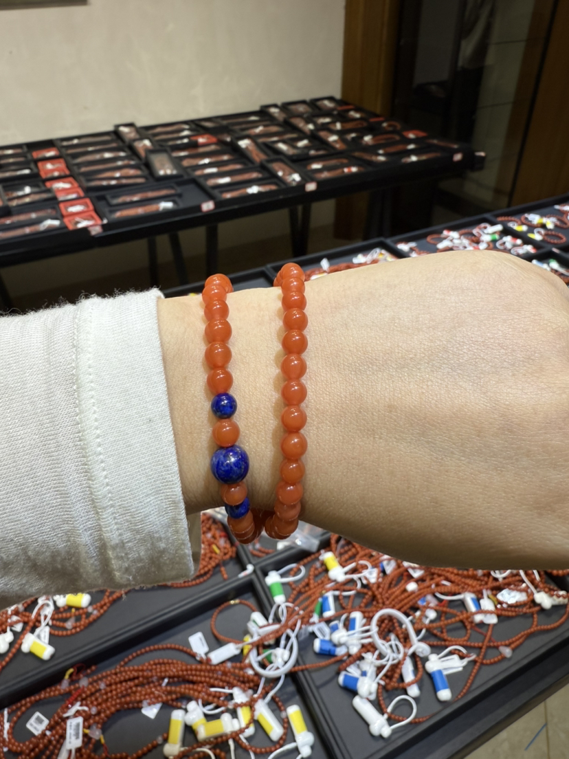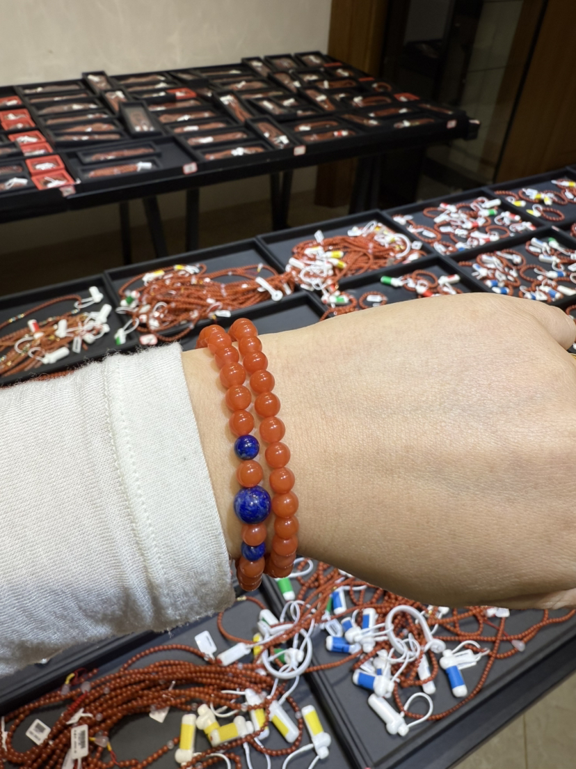 双圈设计,西山路柿子红,比较润,七分肉,颜色属于七分红三分黄的柿子红。设计款中的跑量款,起码是原矿原切,不是外头乱七八糟的珠子。搭配三颗青金石,就多了一丝丝设计感,自古红蓝出CP,能量平衡艺术