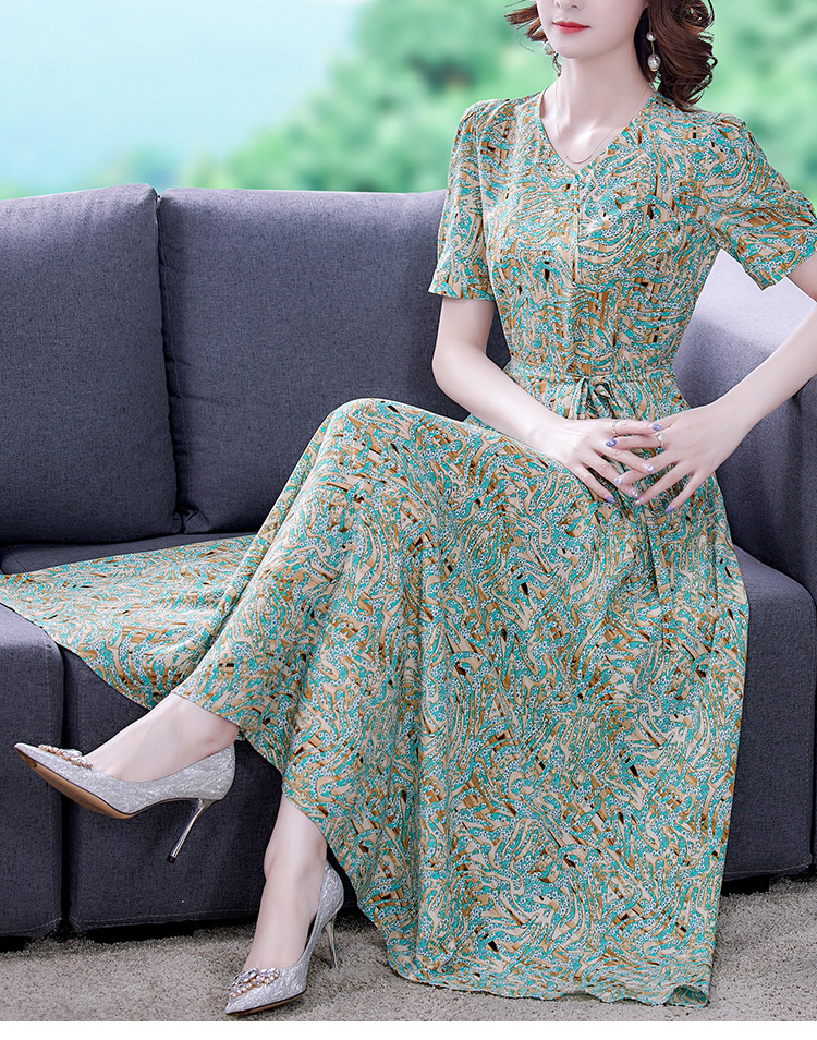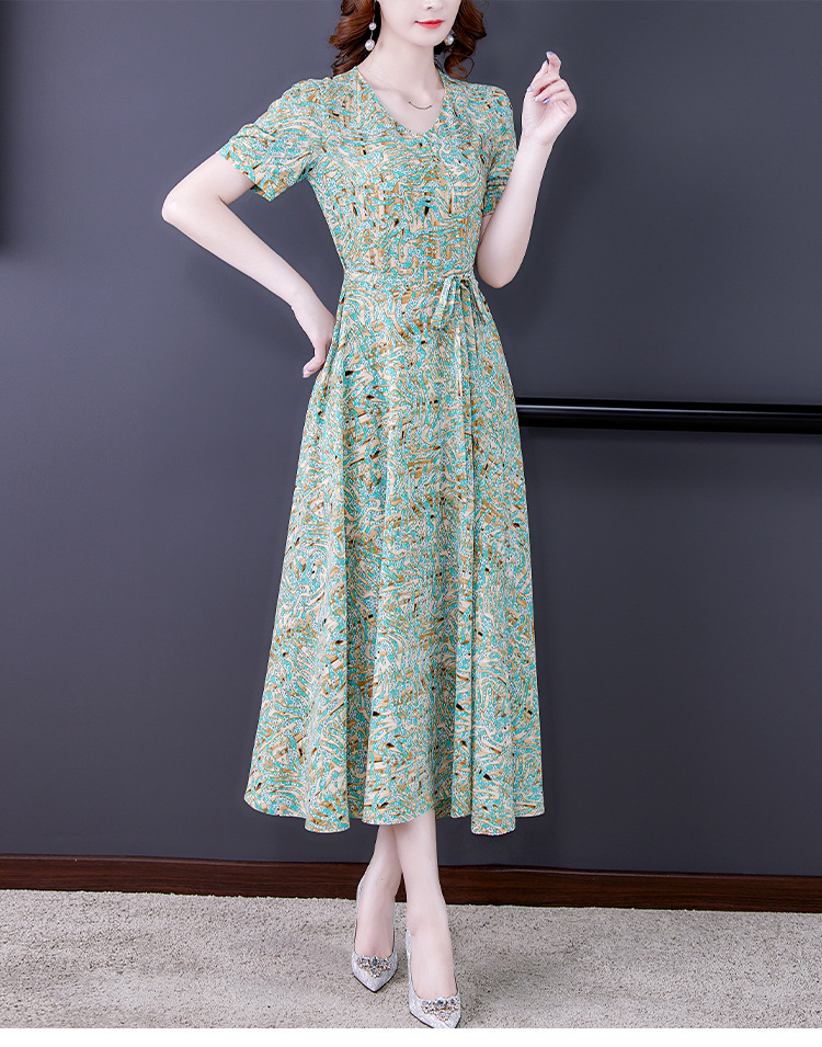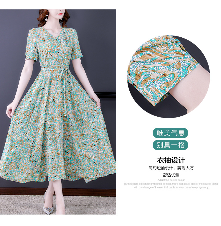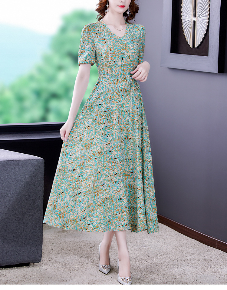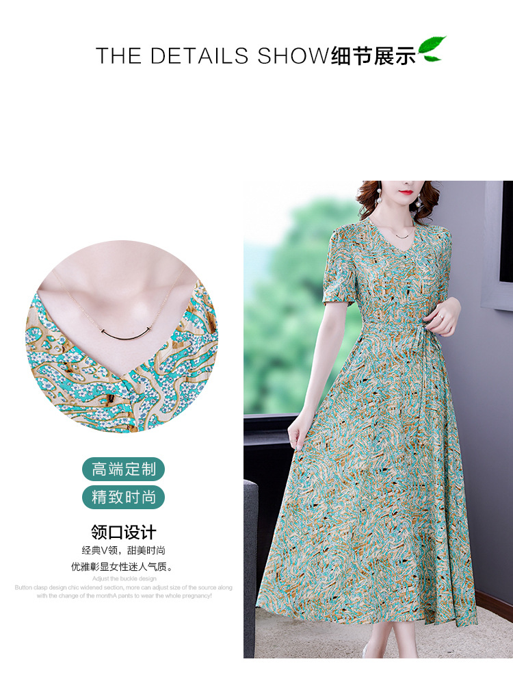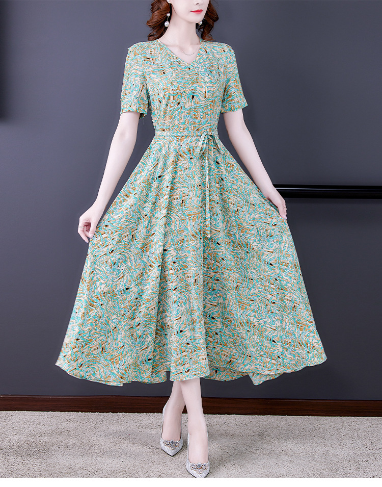 时尚女神范V领收腰显瘦大摆印花雪纺连衣裙AHM-mmjp8267