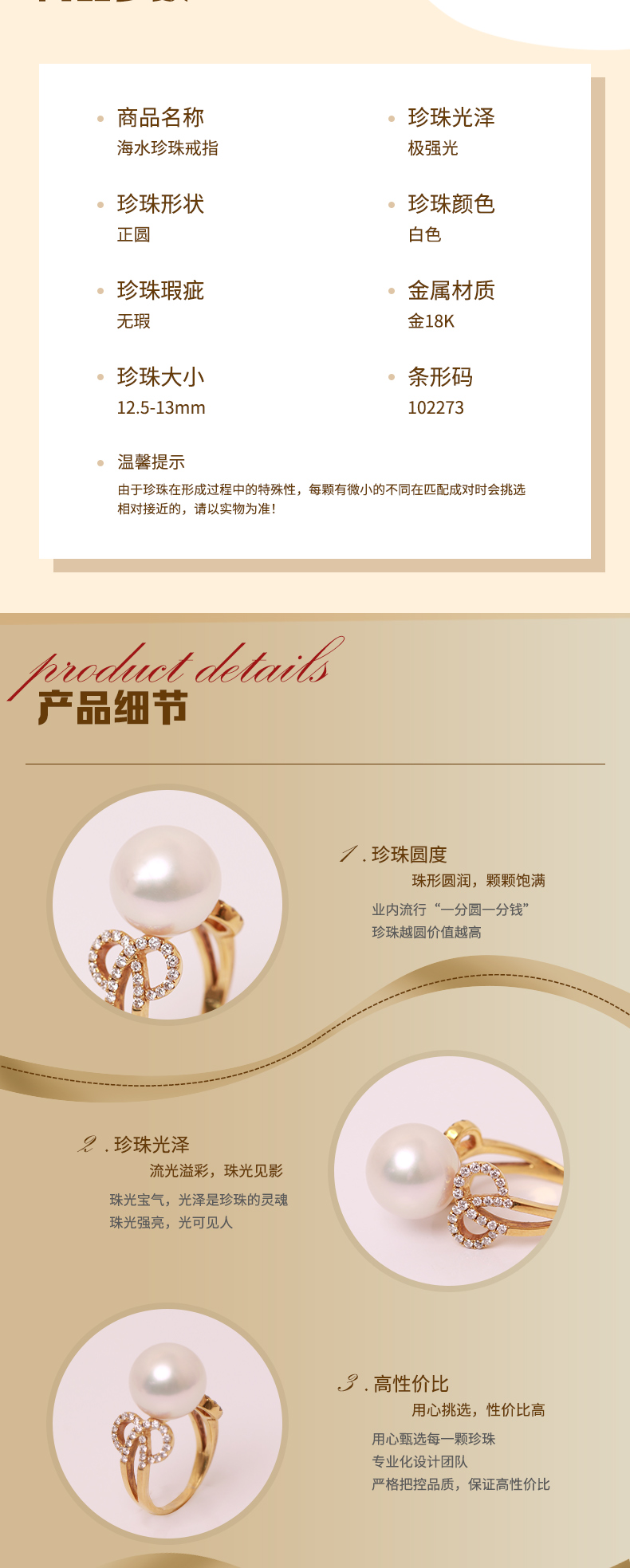 金18K海水珍珠戒指 12.5-13mm白,0.5ct 58粒 102273