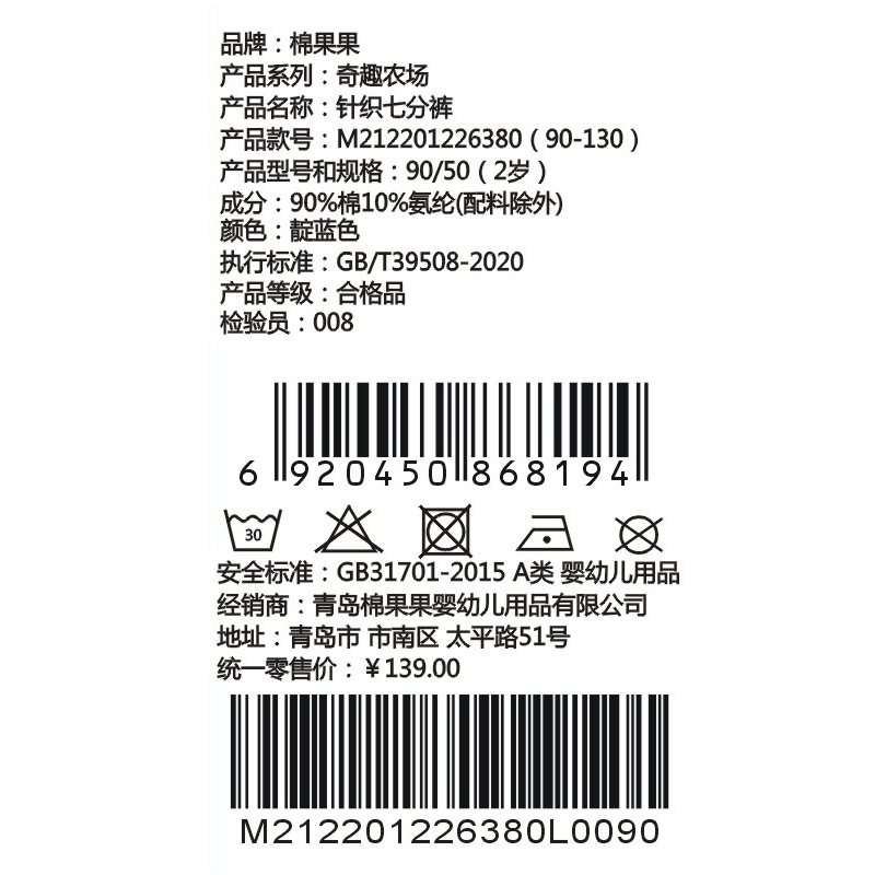 棉果果夏季新品男童纯棉凉感针织七分裤M212201226380