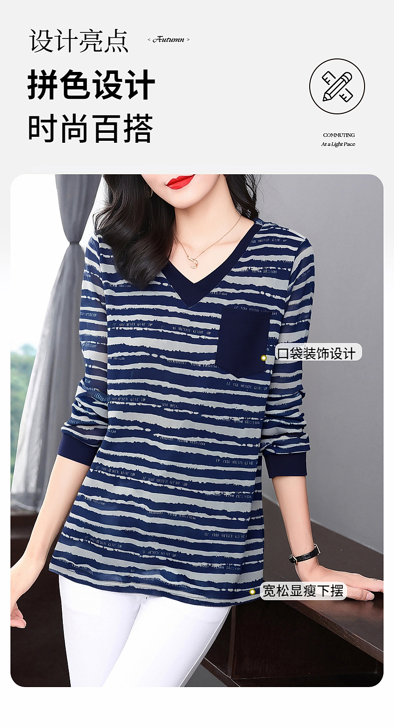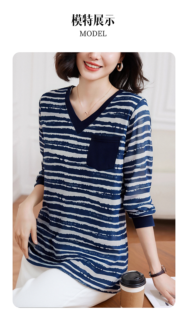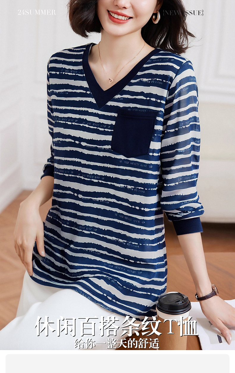 芳妮诗春夏新款条纹长袖打底衫女中长款大码V领上衣宽松显瘦t恤女