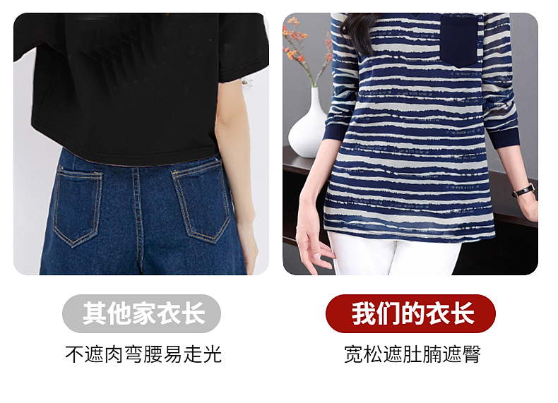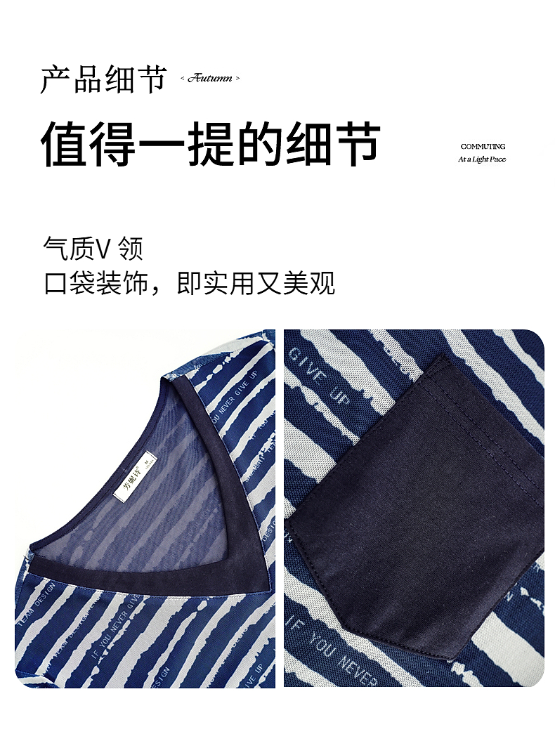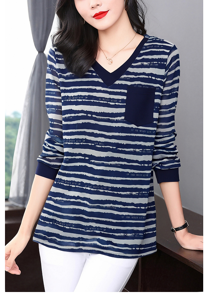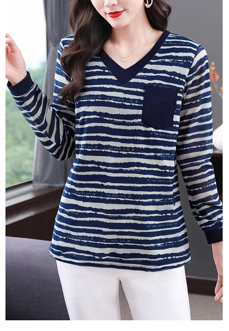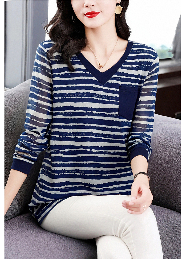 芳妮诗春夏新款条纹长袖打底衫女中长款大码V领上衣宽松显瘦t恤女