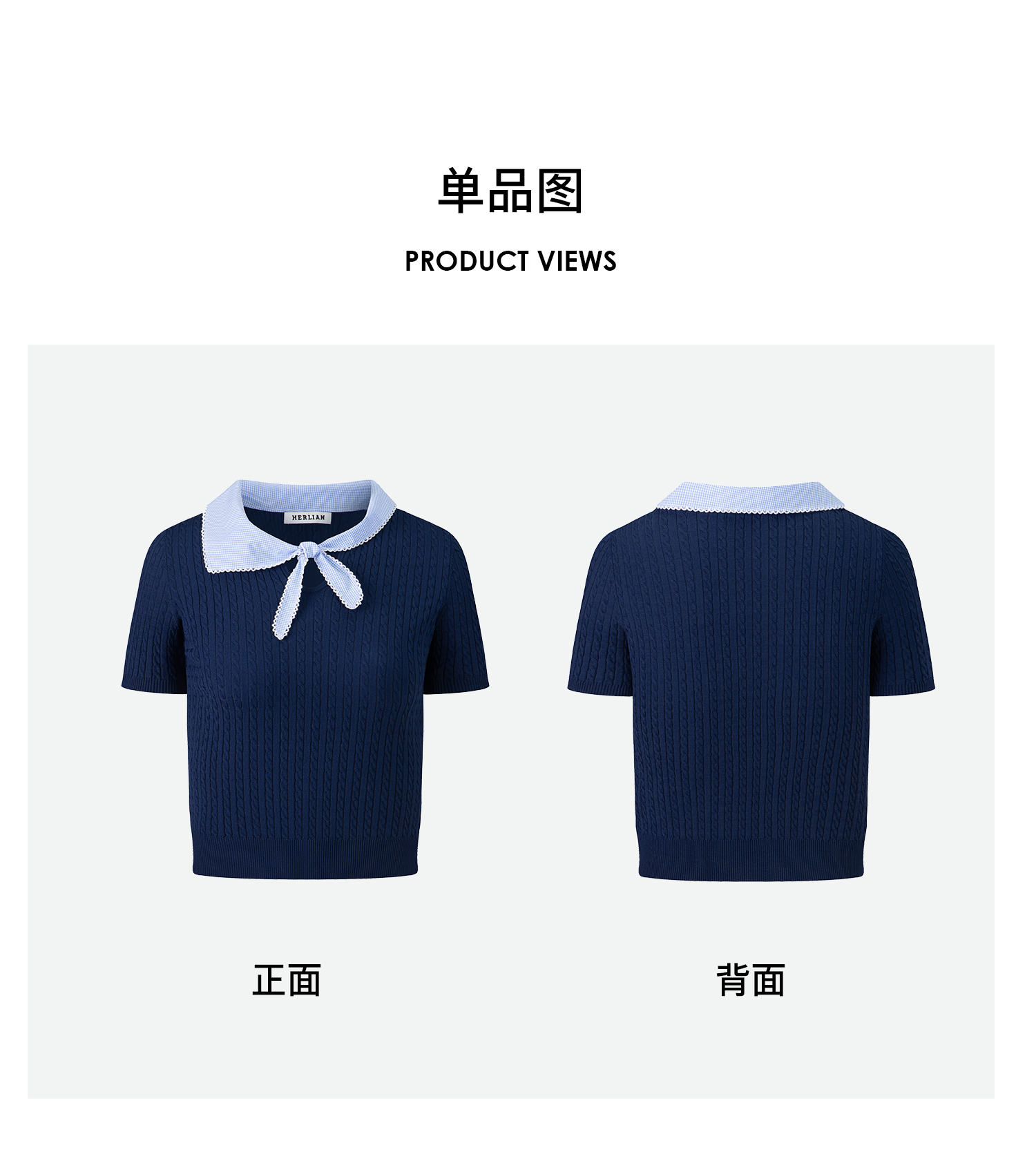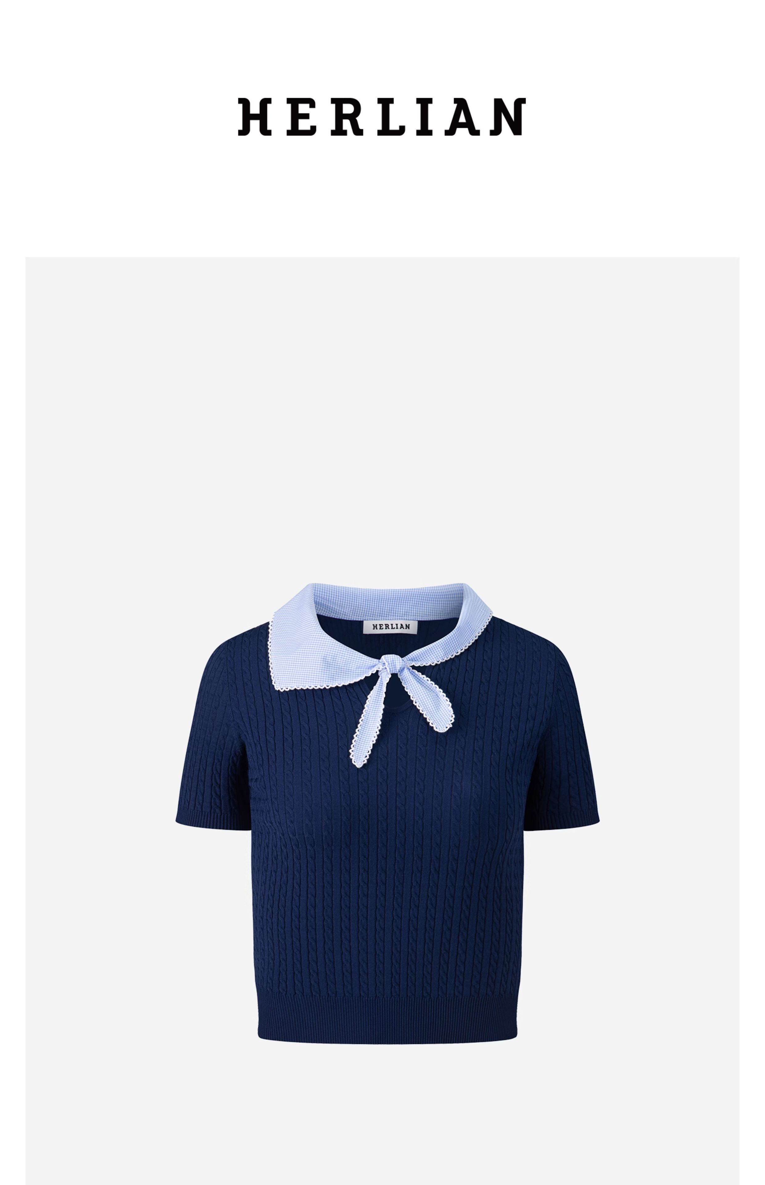 HERLIAN 2025夏季新品女士领口系带蝴蝶结拼色设计针织衫