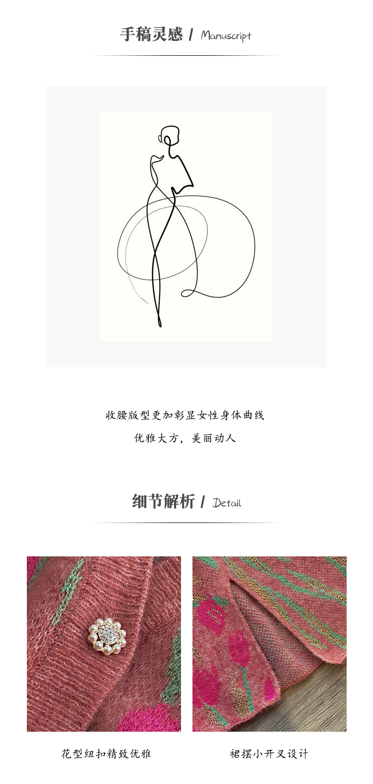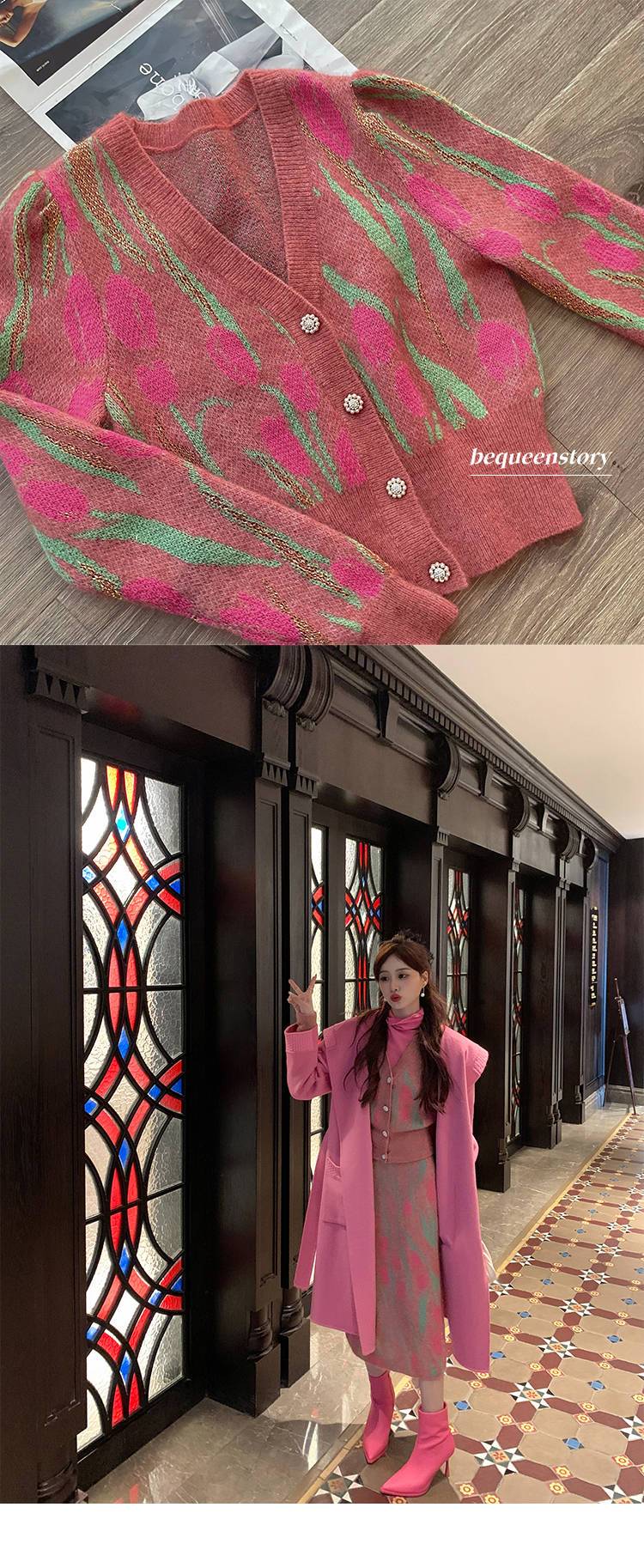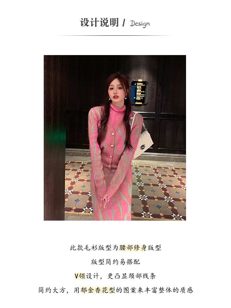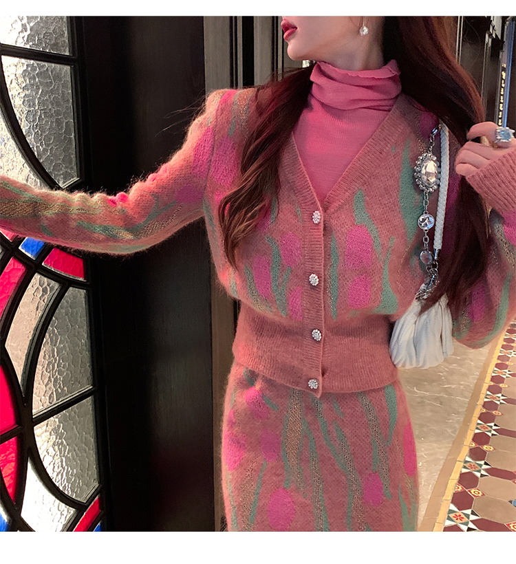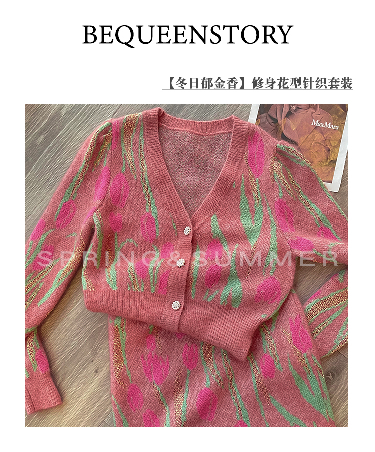 BeQueenStory【冬日郁金香】修身V领简约花型收腰针织套装