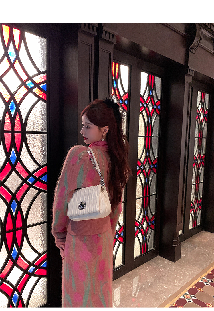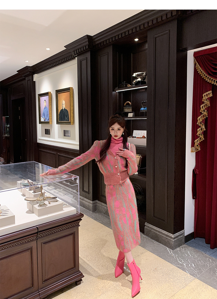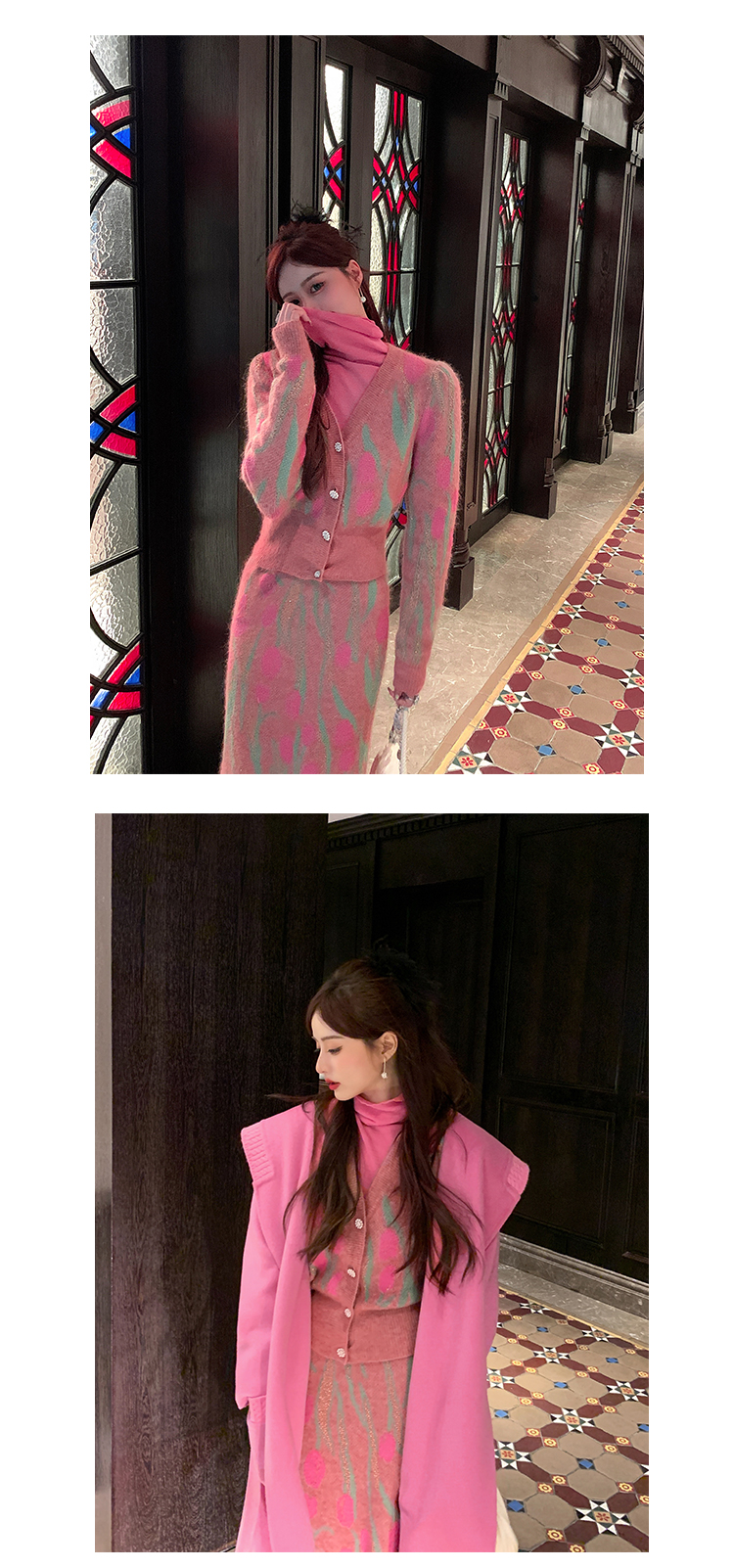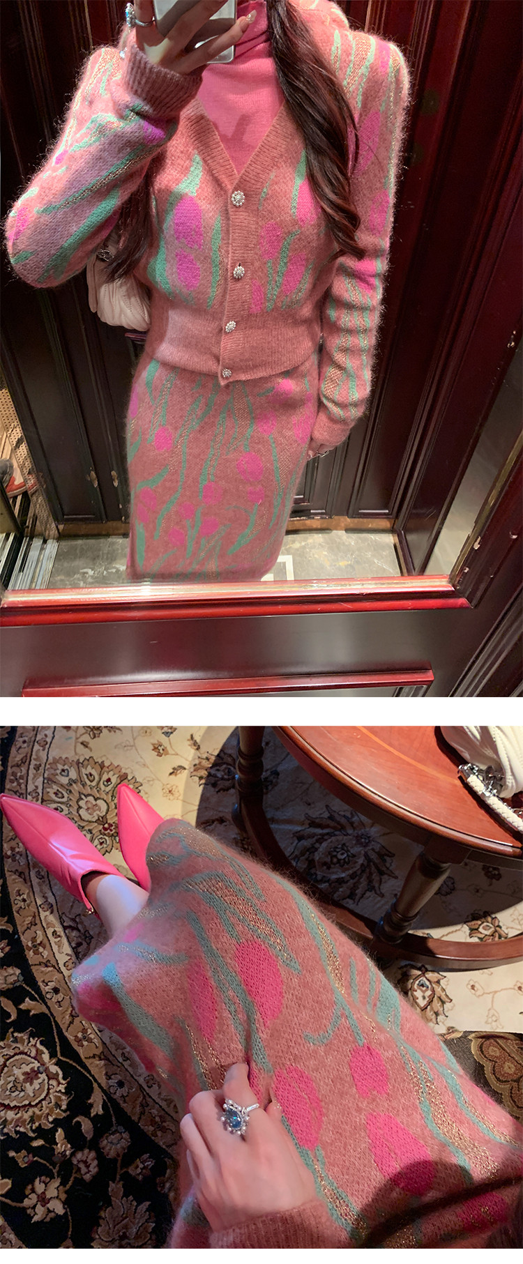 BeQueenStory【冬日郁金香】修身V领简约花型收腰针织套装