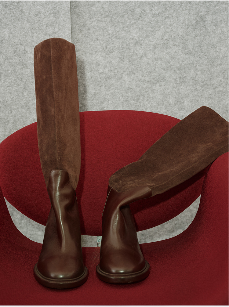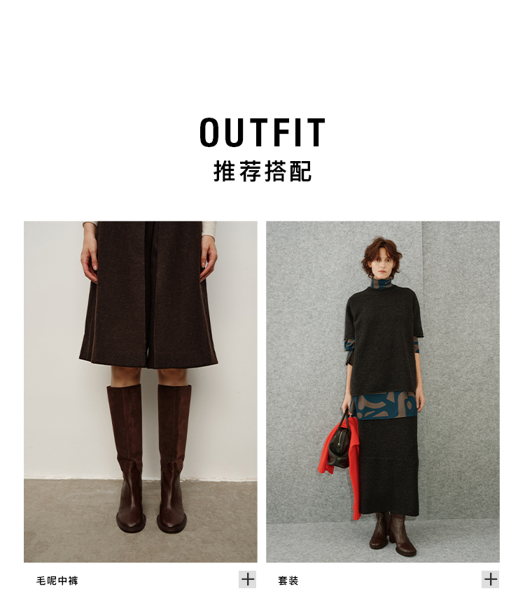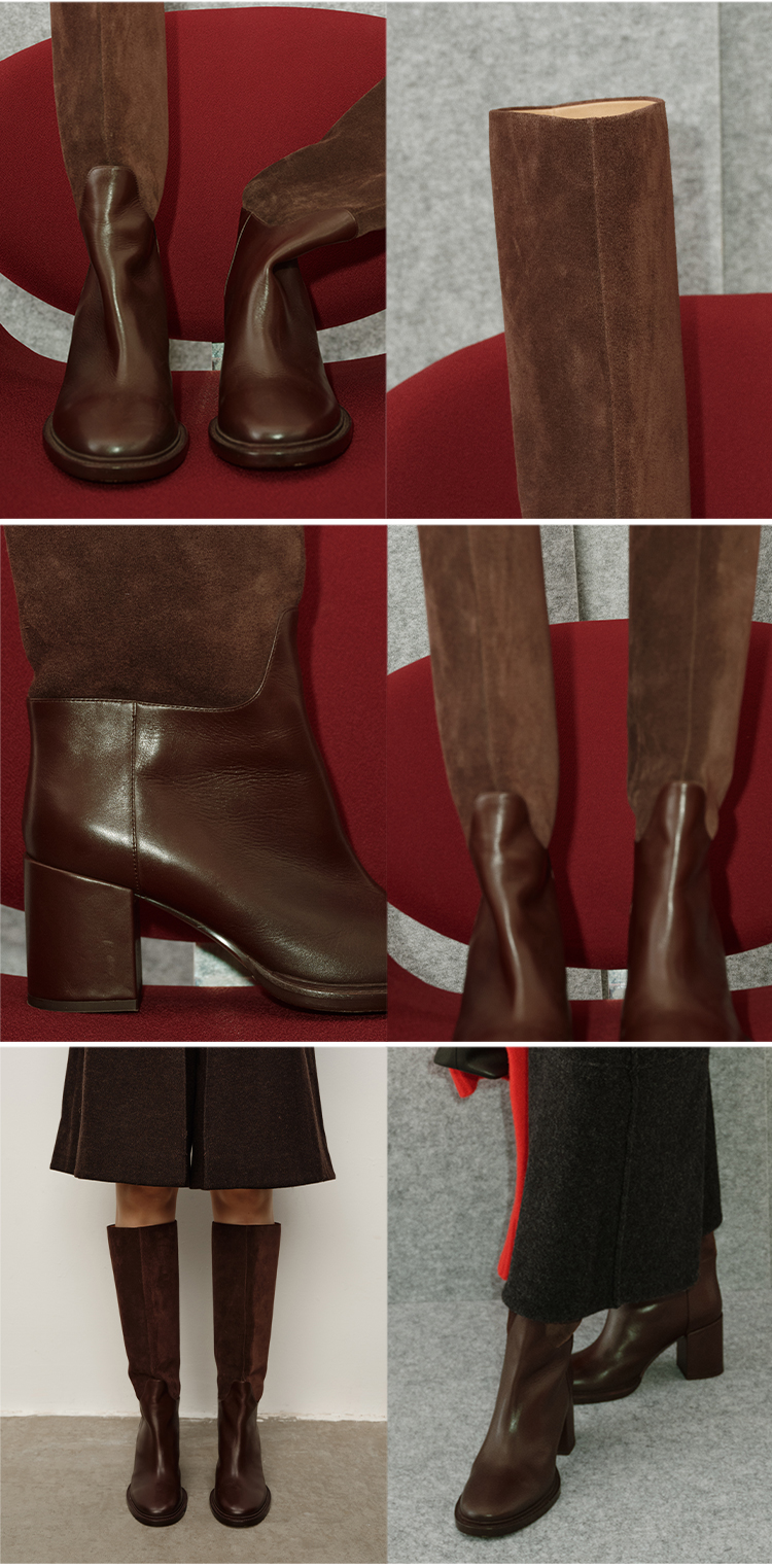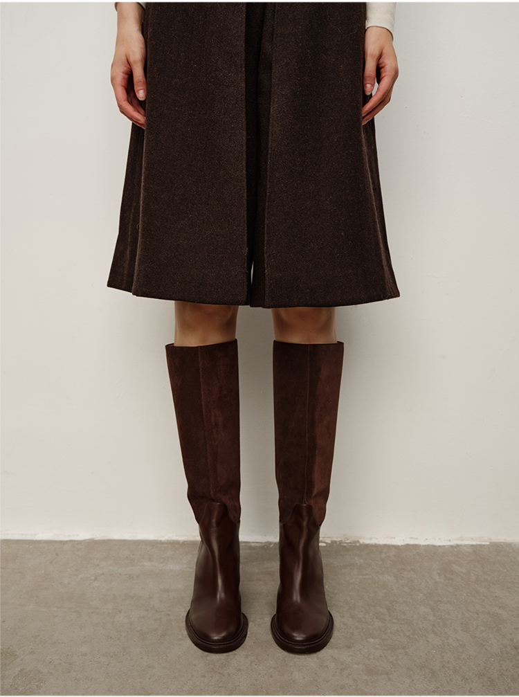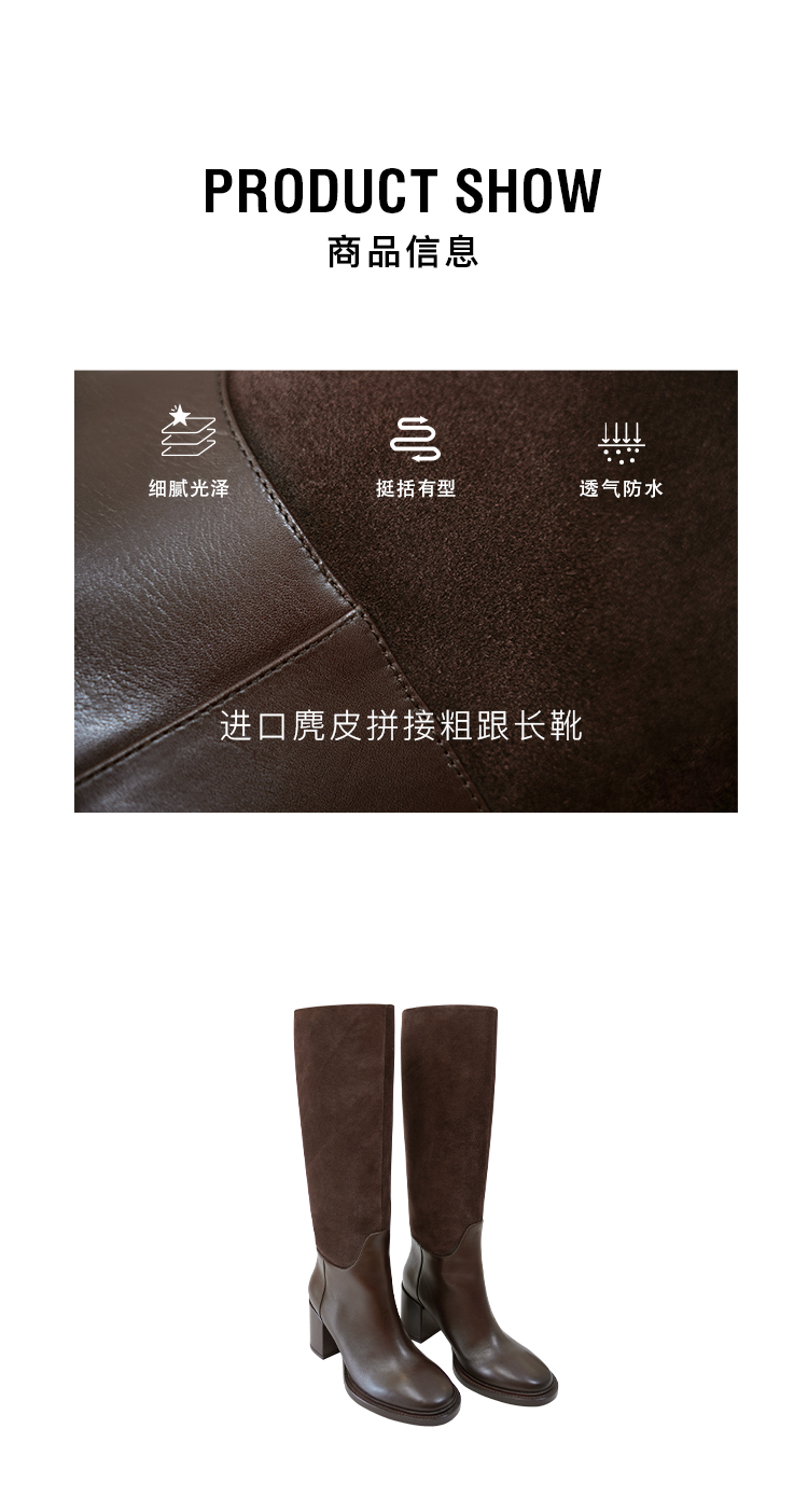HIDEMI 进口麂皮拼接圆头粗跟7CM长靴宽筒骑士靴 乌木棕