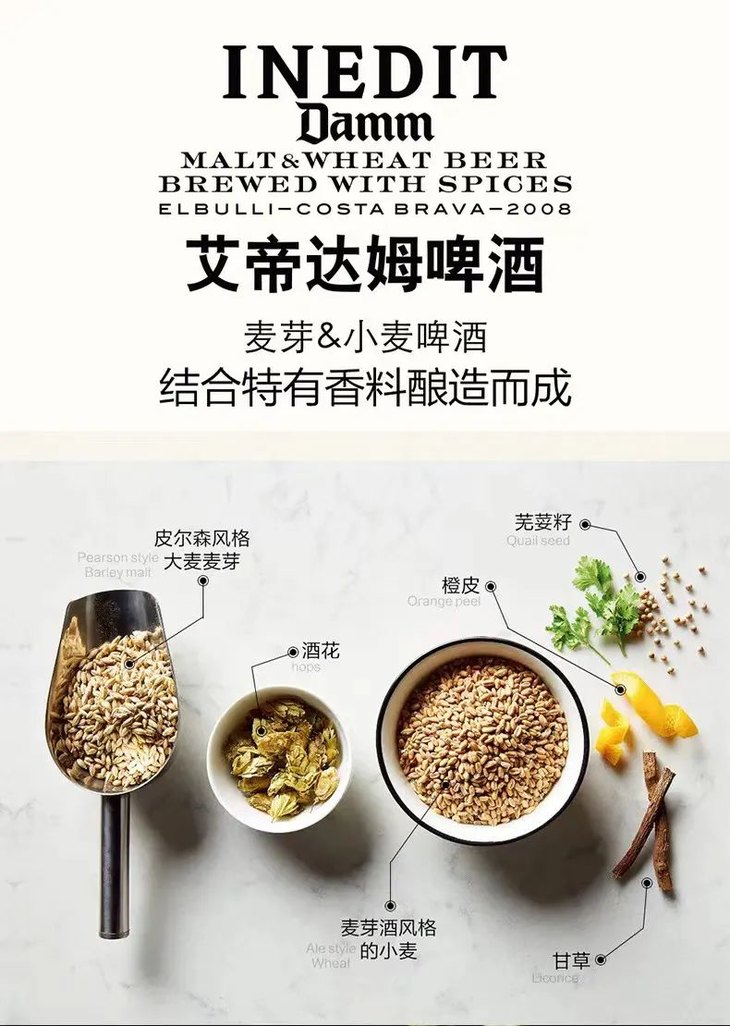 而Ferran Adrià就像创作分子料理一样,给这款畅销西班牙百年的白啤添加了4种香料,让这款酒彻底的得到了革新,所以取名为“Inedit Damm”(翻译为从未有过的Damm啤酒体验)