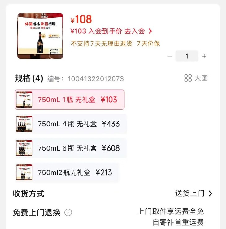 我们新先聚品带来独家特惠!单瓶官方价103元,我们8折89元!2瓶213,我们75折168、6瓶官方价608,我们7折468、整箱12瓶京东价1236元,我们65折799元!相当于一瓶才66!