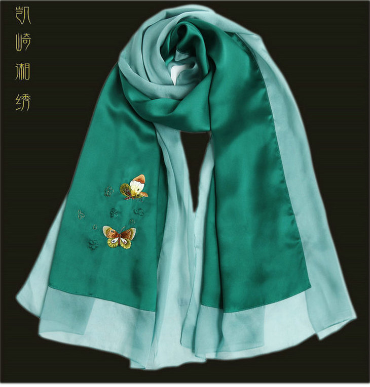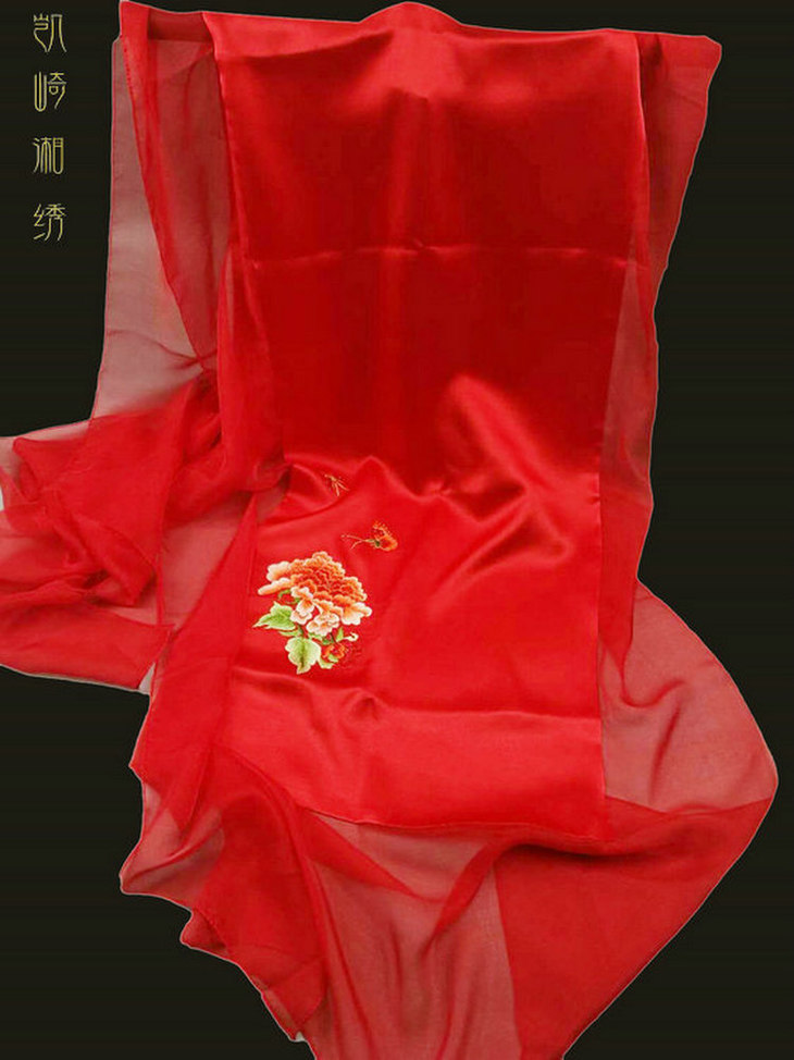 凯崎湘绣 围巾女 春夏款古典绣花披肩 拼接真丝丝巾 绸缎 纯手工披风刺绣 错针绣 送妈妈款
