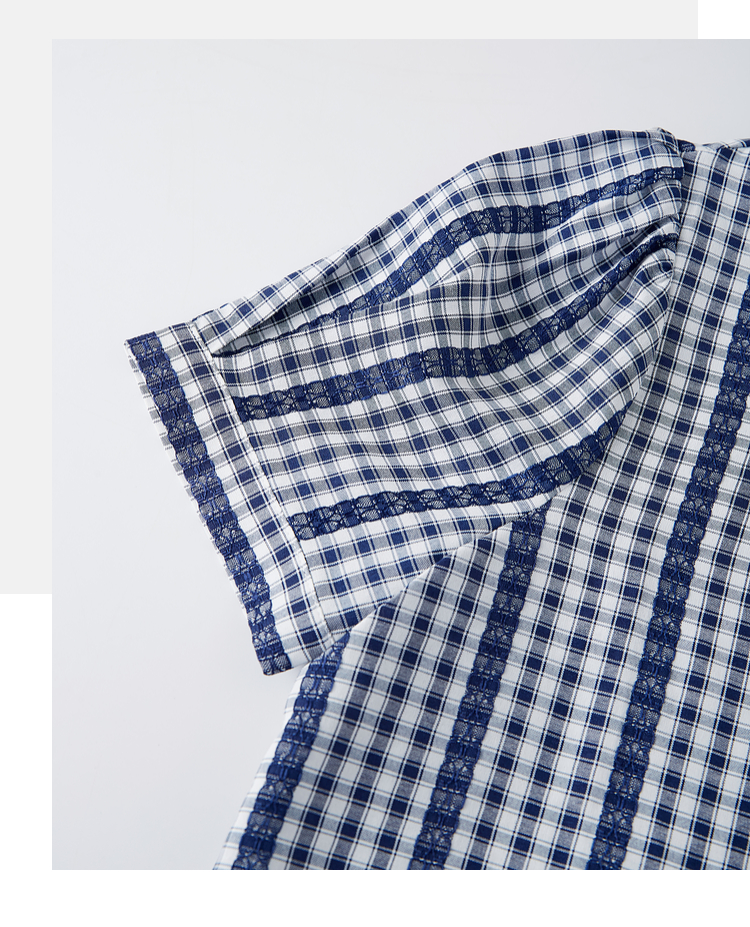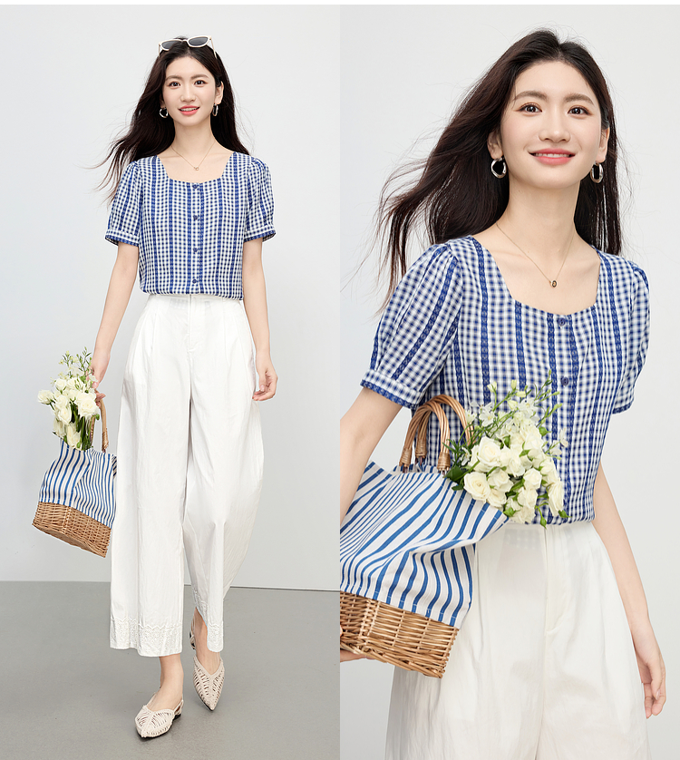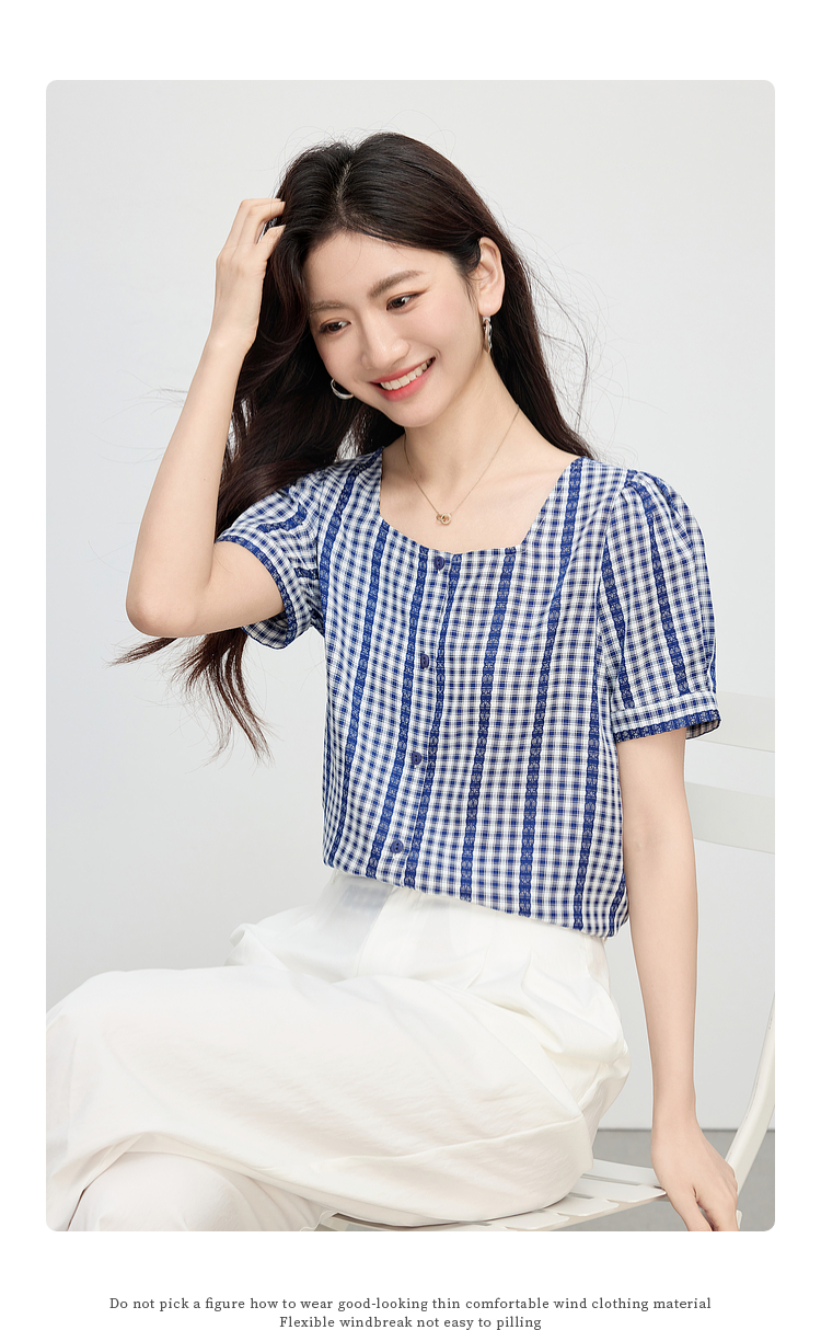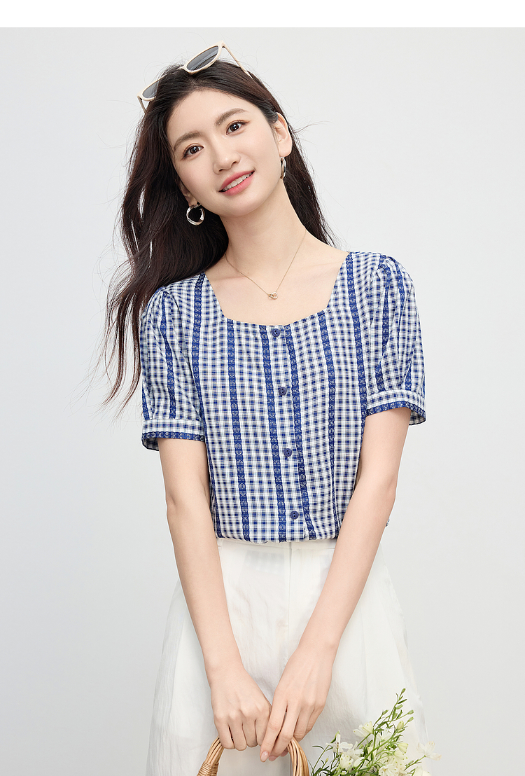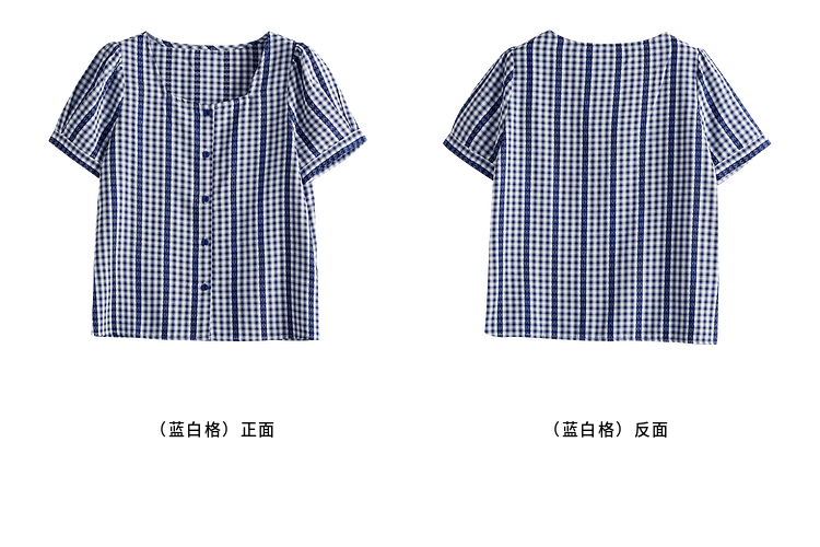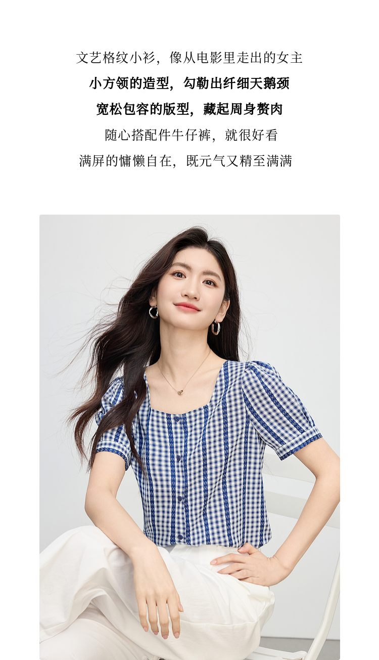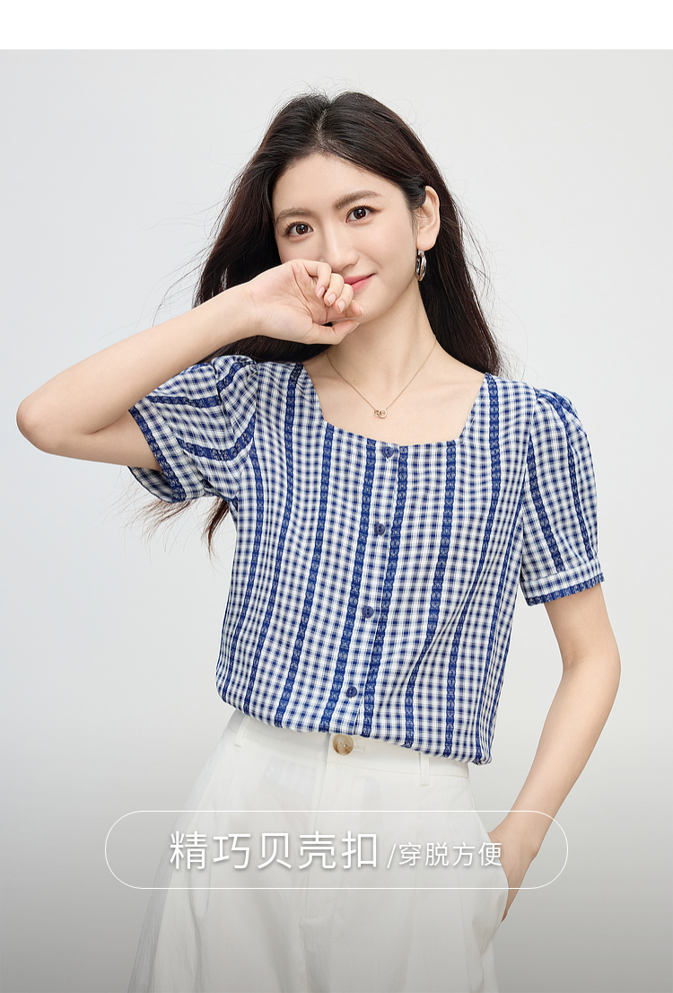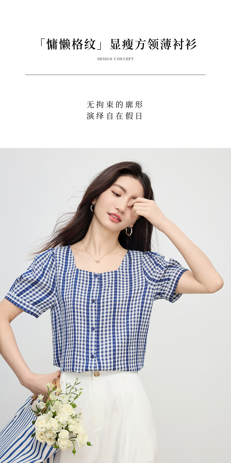 【07/16新品】熙世界法式蓝白格纹方领衬衫女夏季慵懒文艺复古短袖上衣2025新款