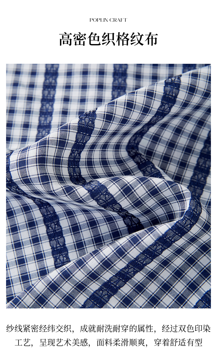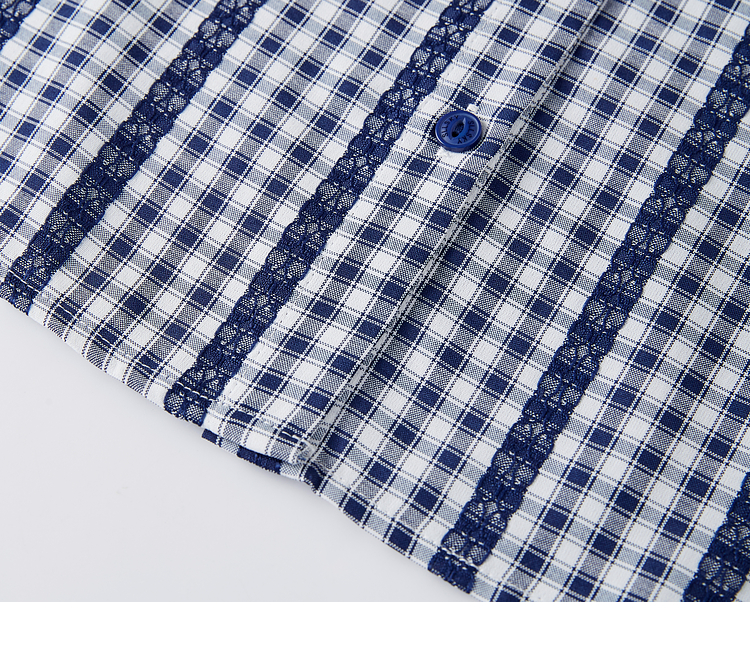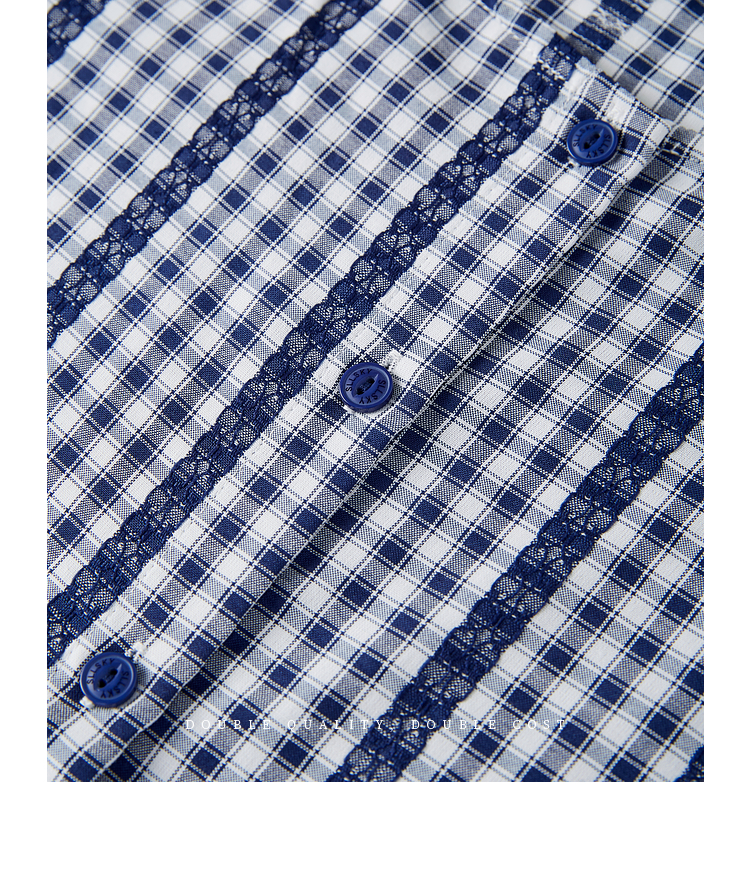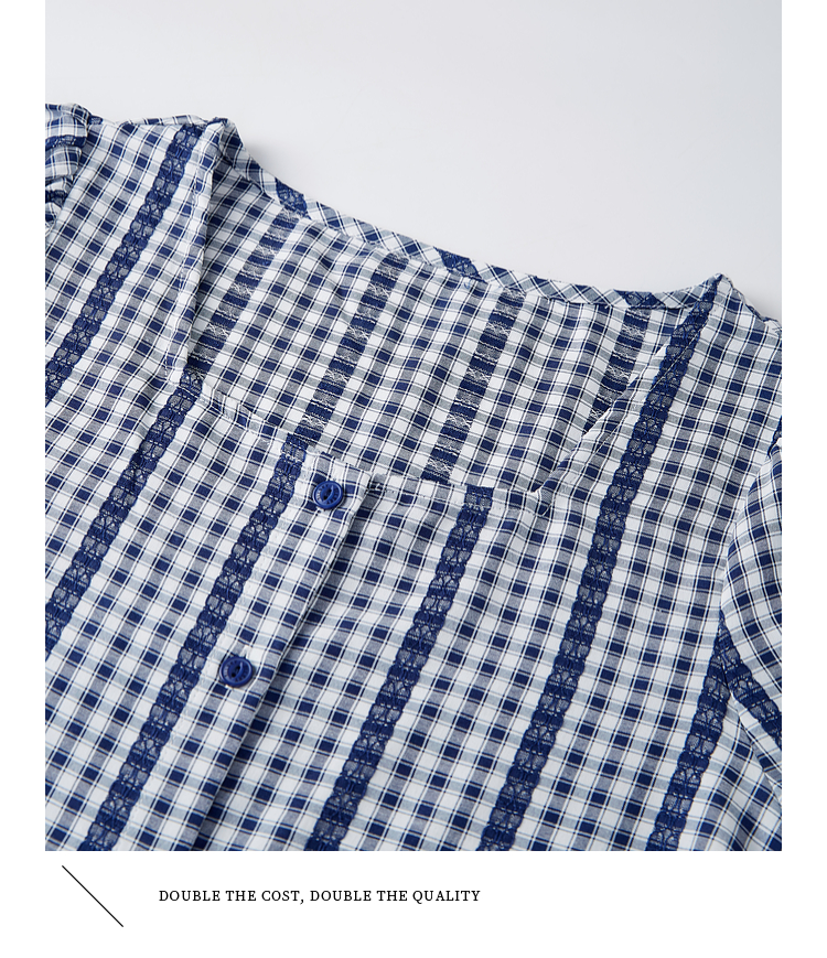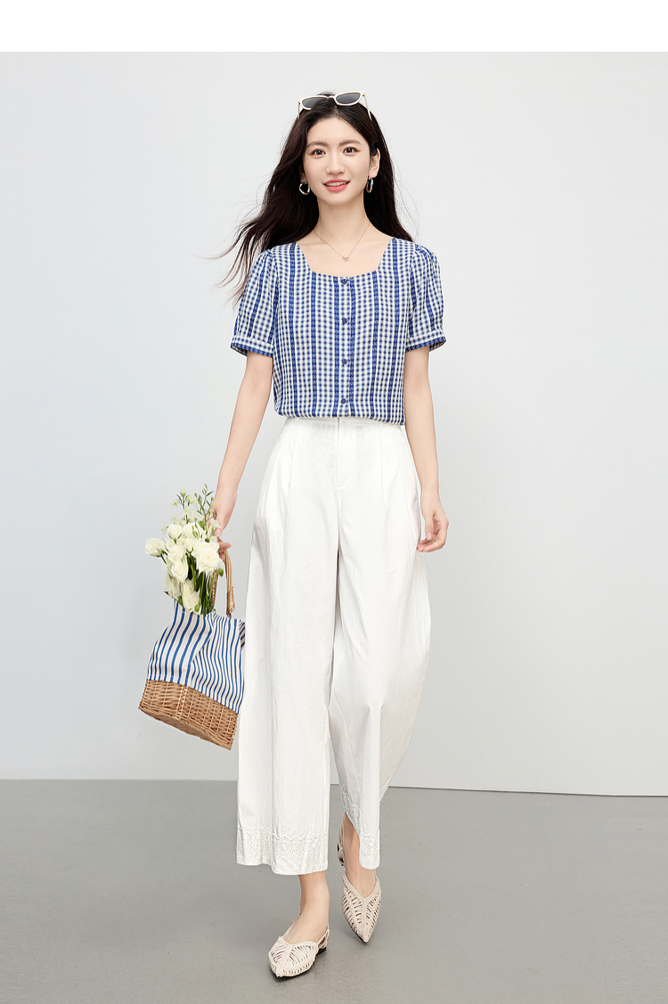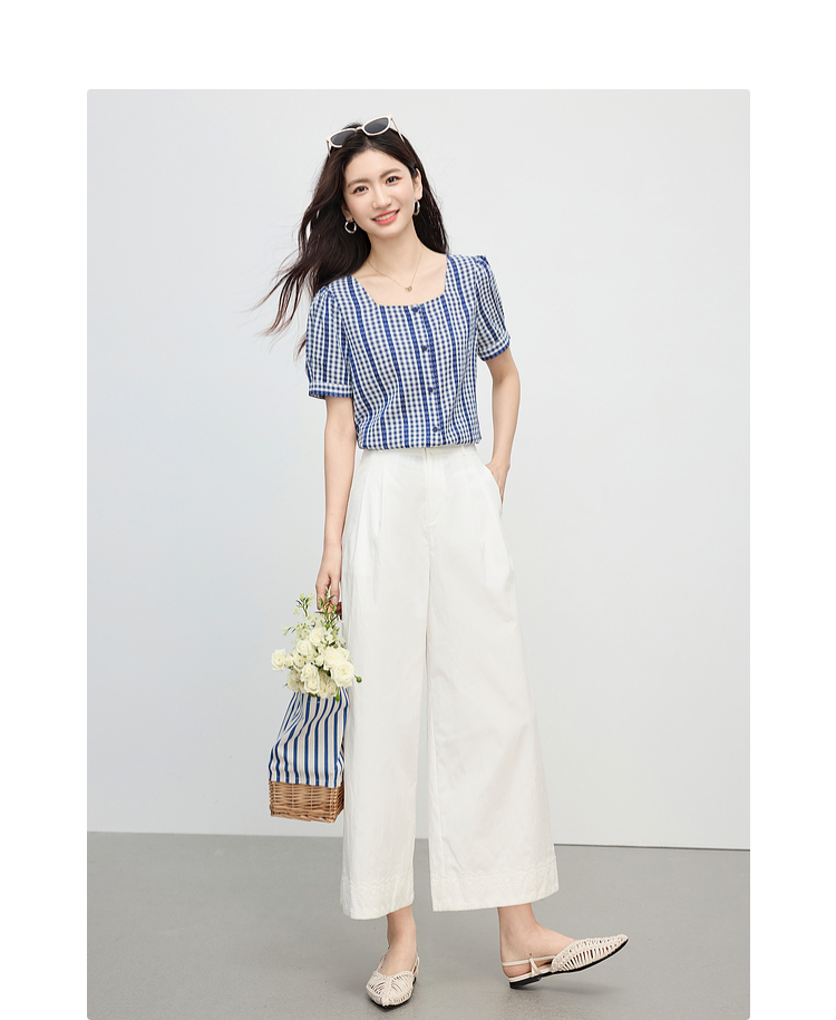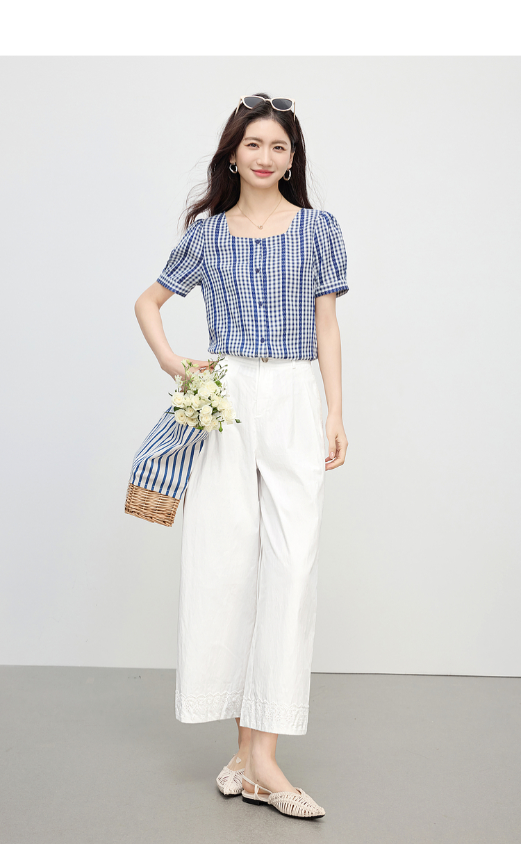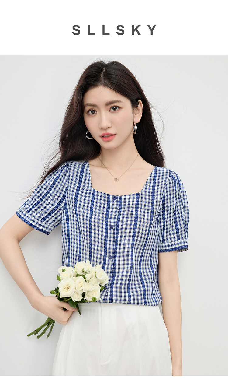 【07/16新品】熙世界法式蓝白格纹方领衬衫女夏季慵懒文艺复古短袖上衣2025新款