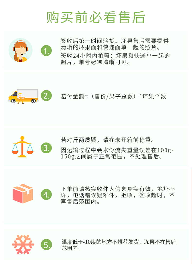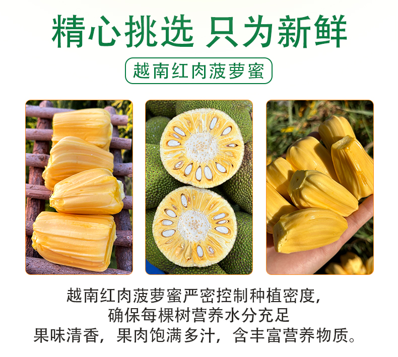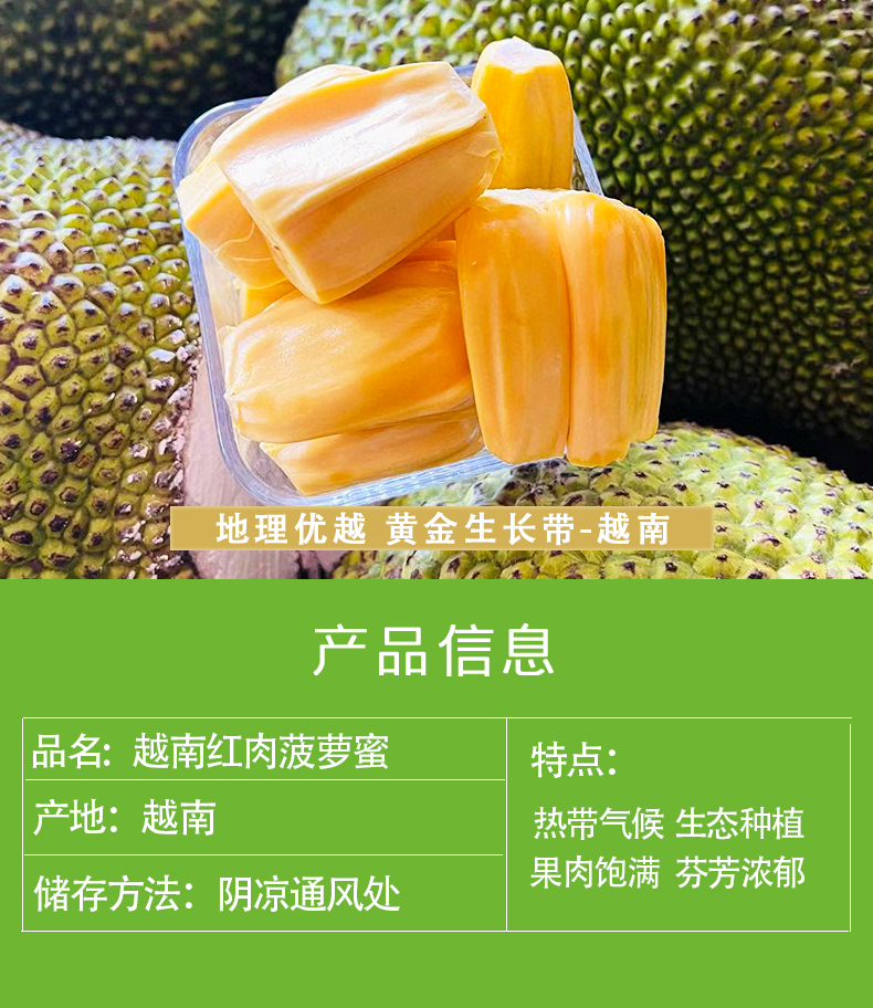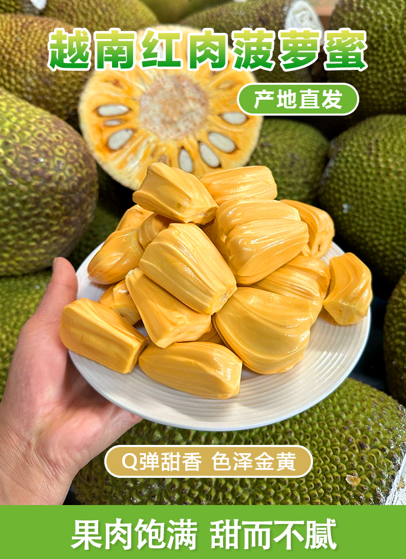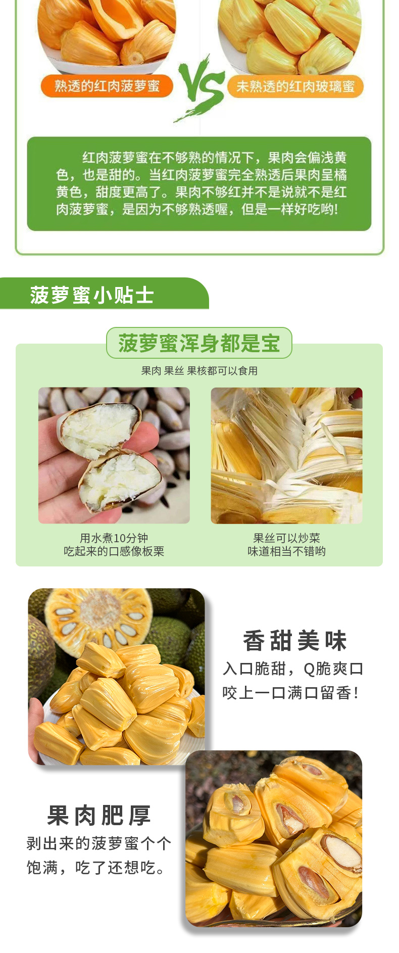 【温馨提示】菠萝蜜8-9成熟,收到用手按软了,有香味发出才熟哦,不熟别切开,按菠萝蜜的行规,生果切开不售后,售后时是按坏的比例赔付(拒绝坏一部分就说整个坏了不能吃了或者果子已经扔了的买家)。到件24小时内务必签收验货,如有问题请将果子和快递面单合拍(不要分开拍,无面单不受理)发给我们备案和跟进,否则超时坏果不售后