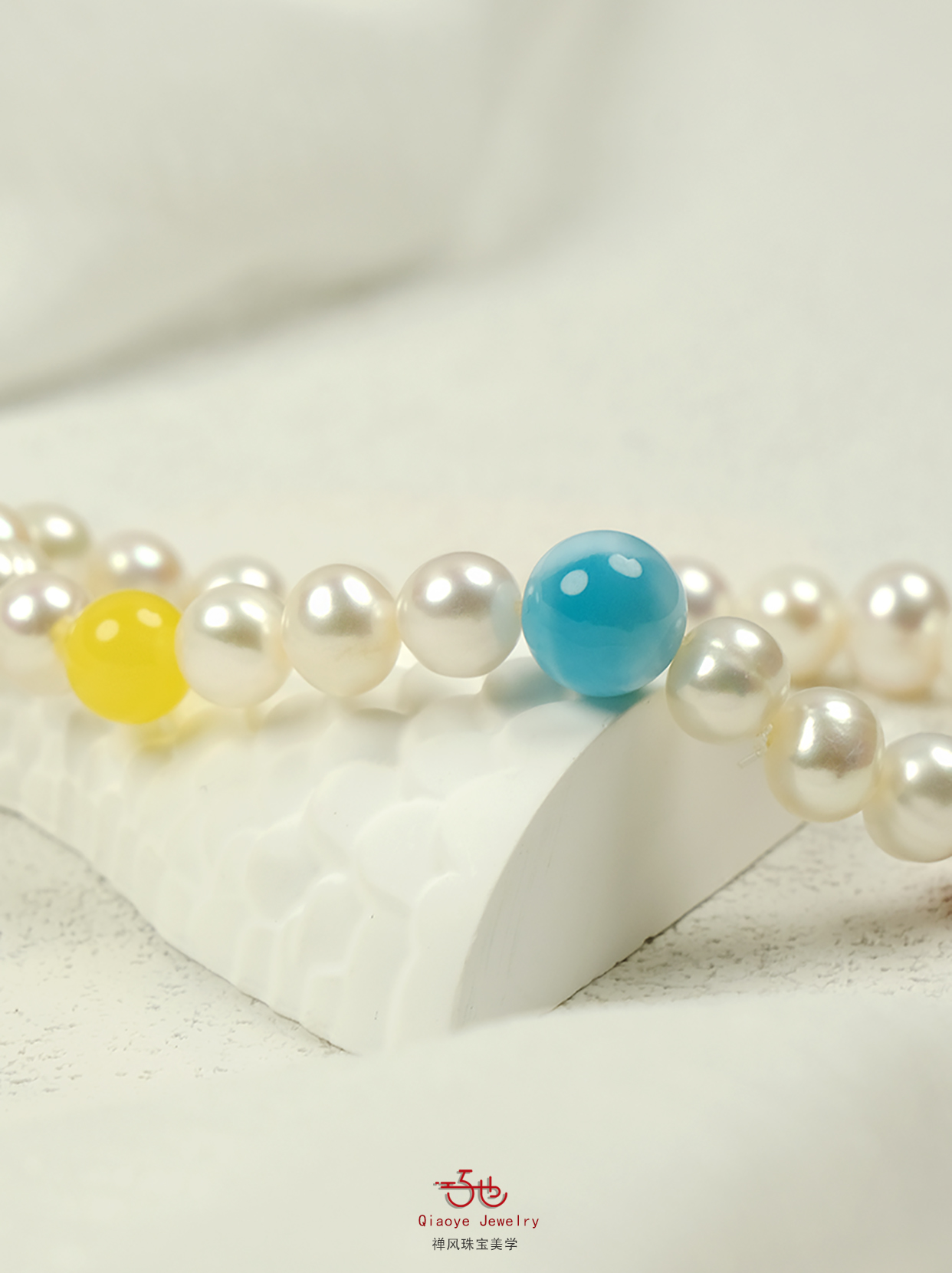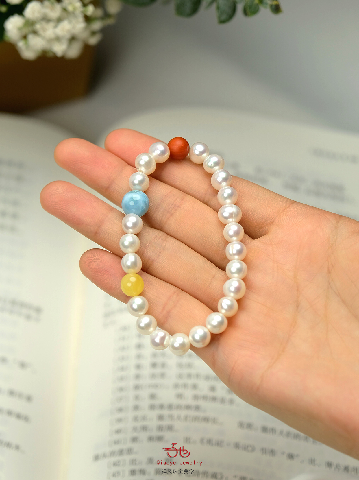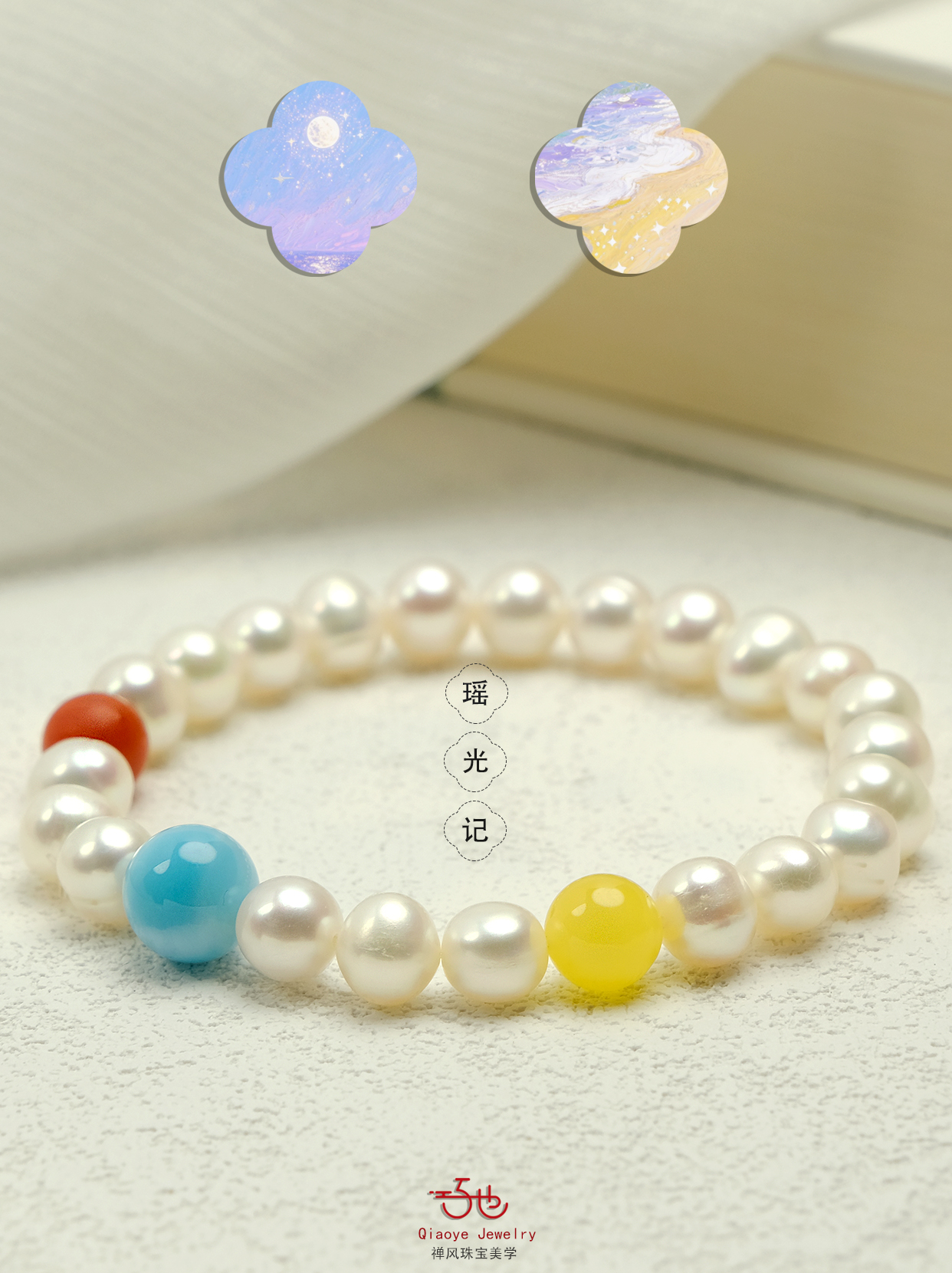 “瑶光记”手珠以天然珍珠为经,其光如《淮南子》所载“随侯之珠”;海纹石为纬,蓝白相涌似《海内十洲记》描摹的瀛洲烟波;佐以波罗地海蜜蜡的千年松脂香,点染保山南红玛瑙的朱砂艳色。佩之则闻涛声隐隐,恍见屈子《九歌》中“乘水车兮荷盖”的湘君,正拾取你腕间散落的星芒。
