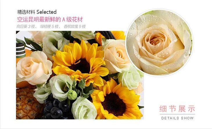 清新的爱 向日葵3枝、绿桔梗5枝、香槟玫瑰9枝。橙子3个、菠萝1个葡萄1串。 黑色果篮1个(1214