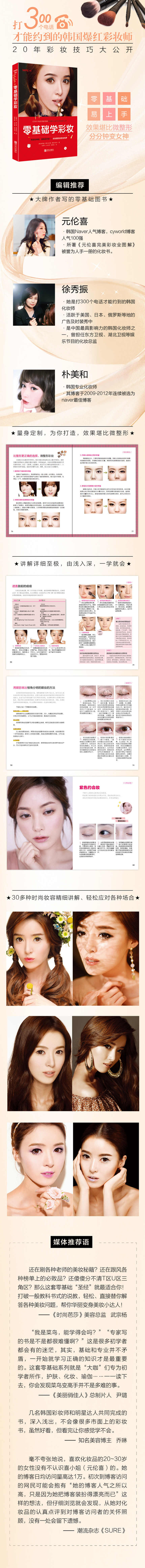 讲解详细至极,由浅入深,一学就会:本书一开始有个基础彩妆的版块,分遮瑕、打底、修眉、画眼影、画眼线、涂睫毛膏和粘贴假睫毛、画腮红、画唇等小细节仔细介绍,初学者也能学会。 30多种时尚妆容精细讲解、轻松应对各种场合: 本书作者系韩国著名的化妆师,化妆技术高超,本书包含当下各种时尚妆容,日常彩妆、场合彩妆、四季彩妆、色彩彩妆、时尚彩妆等32款妆容,让你轻松应对各种场合。