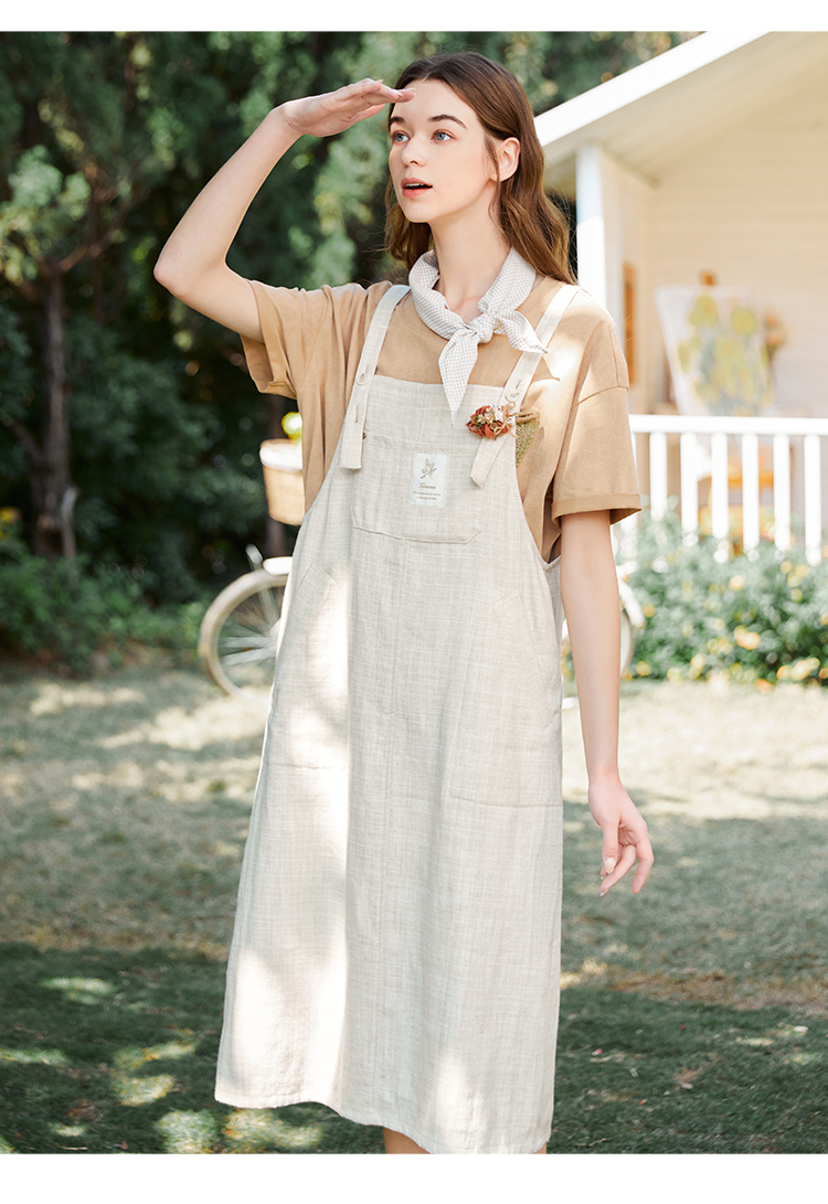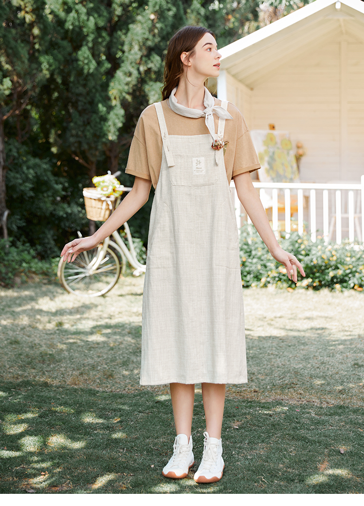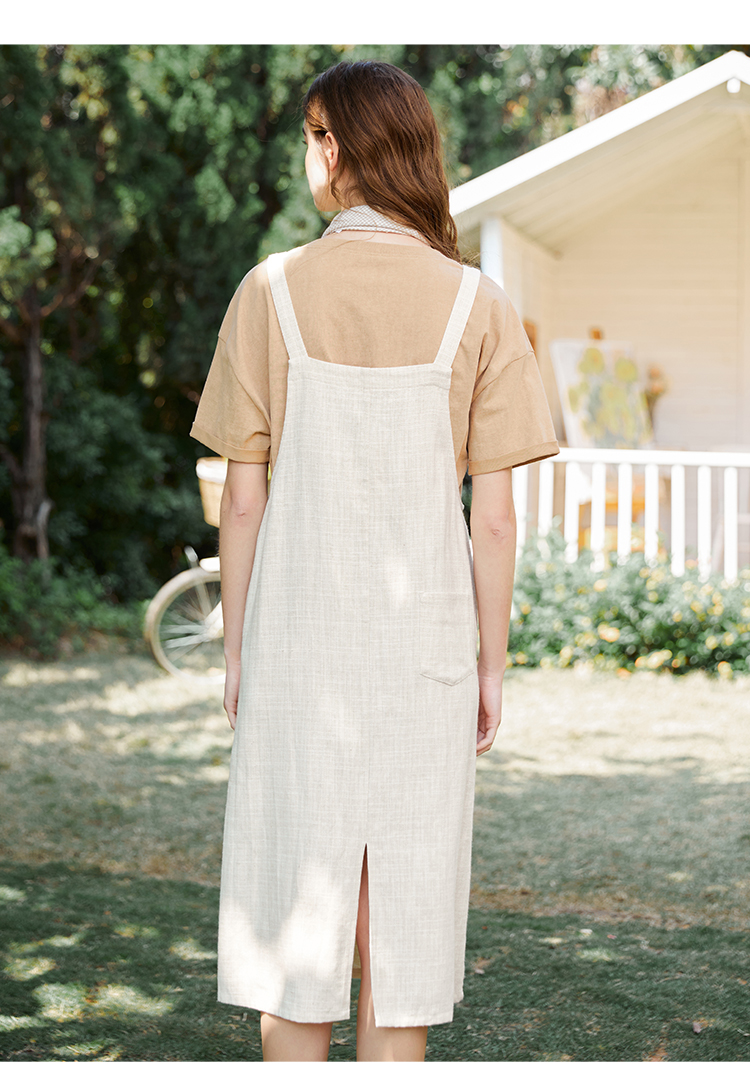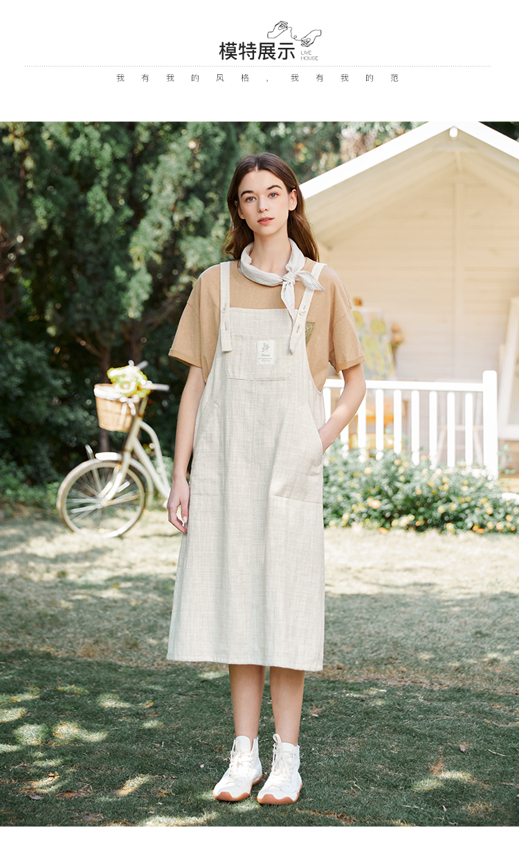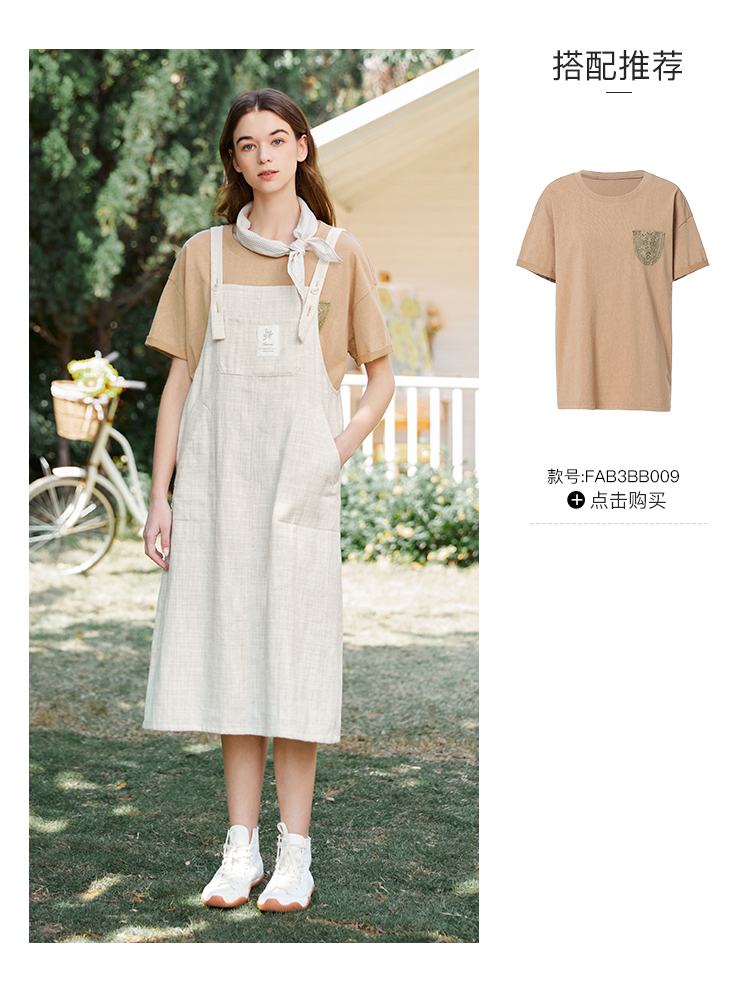 Famecoco范可儿宽松背带裙女森系夏季棉麻方领文艺连衣裙FAB3FE006