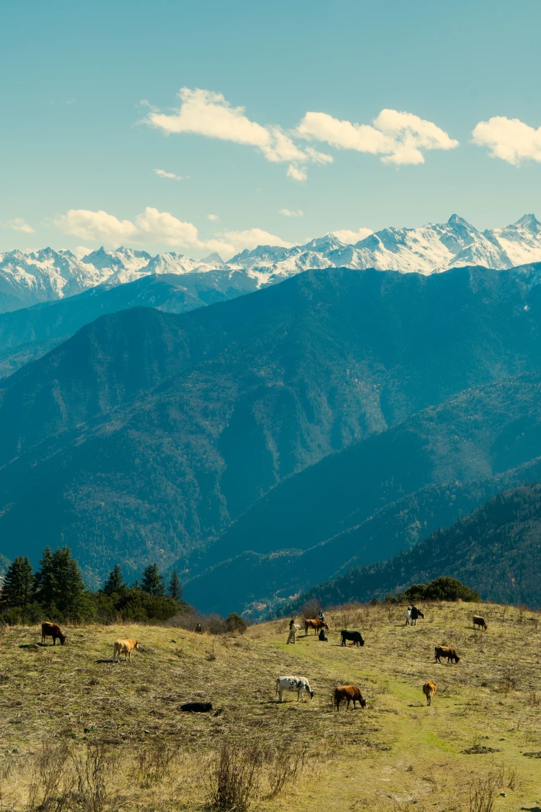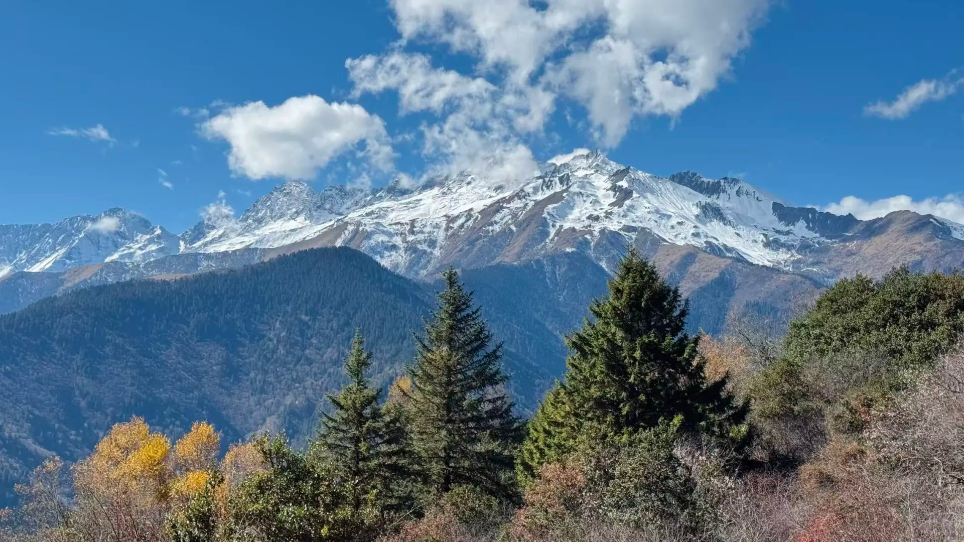 越往上,风越清冽,可视野也越敞亮 —— 对面的雪山突然露了脸!不是春夏的朦胧,秋冬的雪山顶裹着厚 “糖霜”,在蓝天下白得晃眼