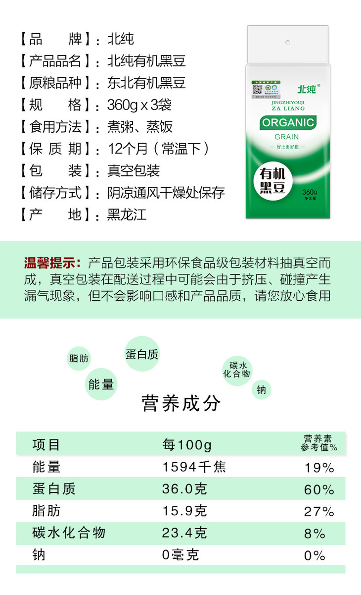 丨有机丨黑豆 360g*3袋 北纯 豆浆 杂粮粗粮收到记得冰箱冷藏
