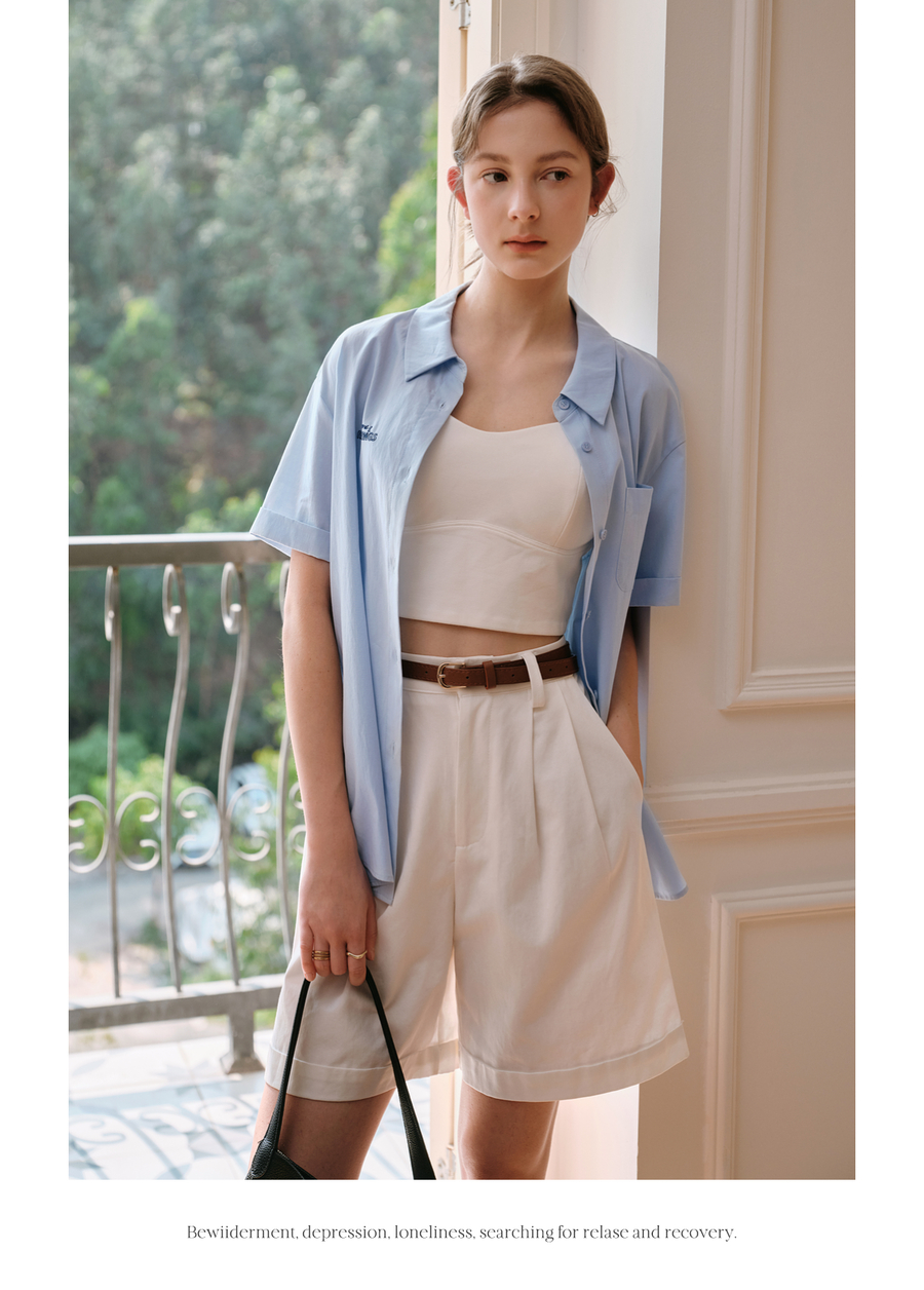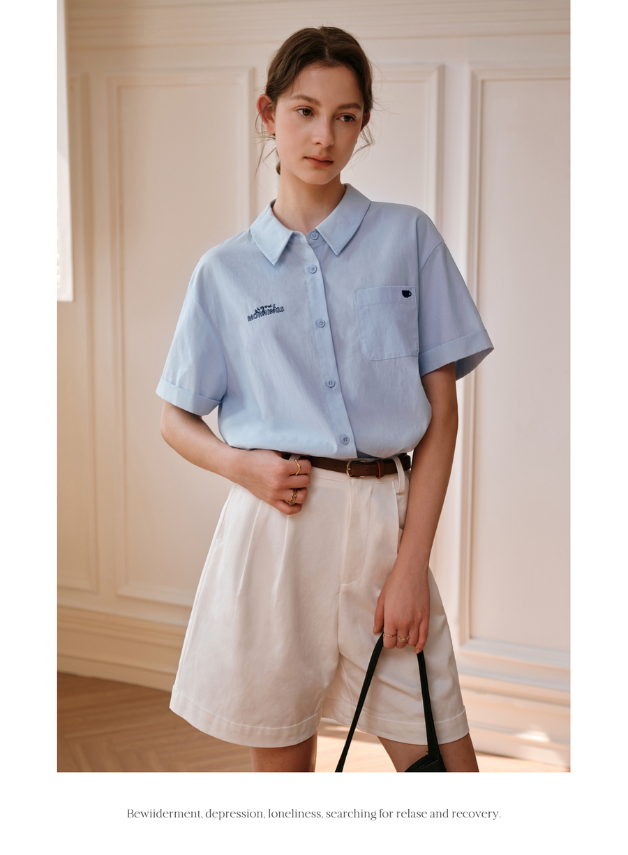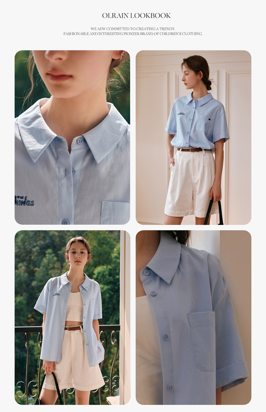 OLrain欧芮儿蓝色休闲短袖衬衫女夏季2025年新款宽松字母刺绣上衣