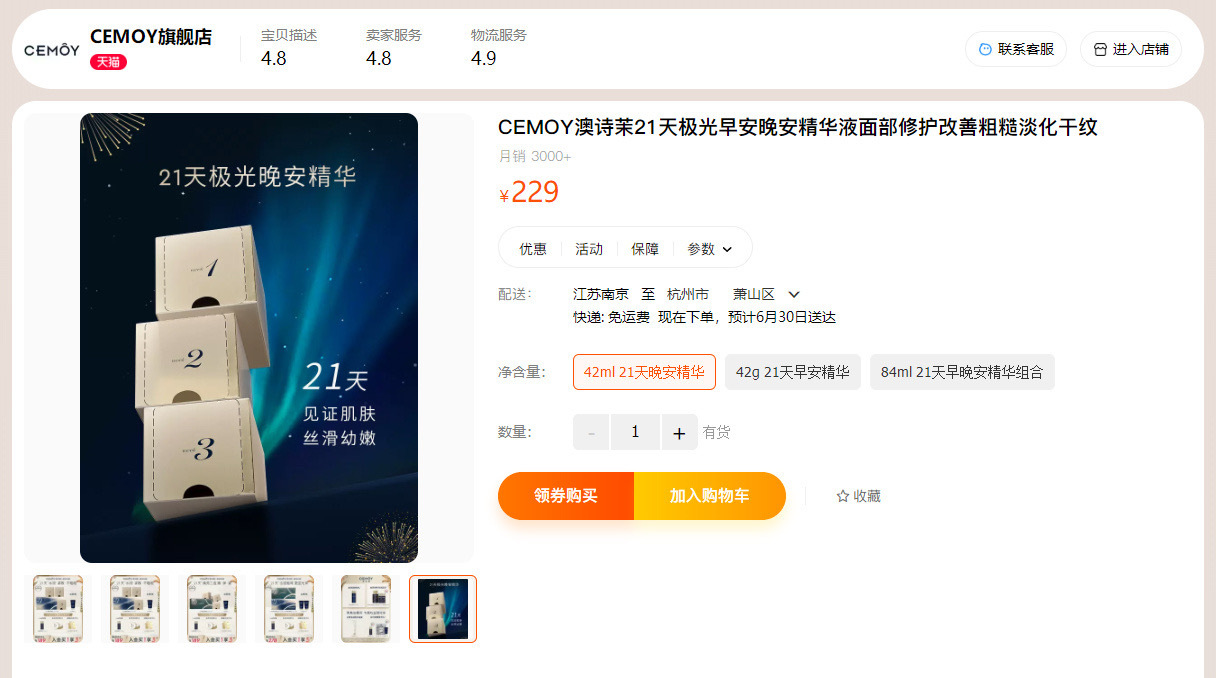 CEMOY 21天极光晚安精华,旗舰店💰229元