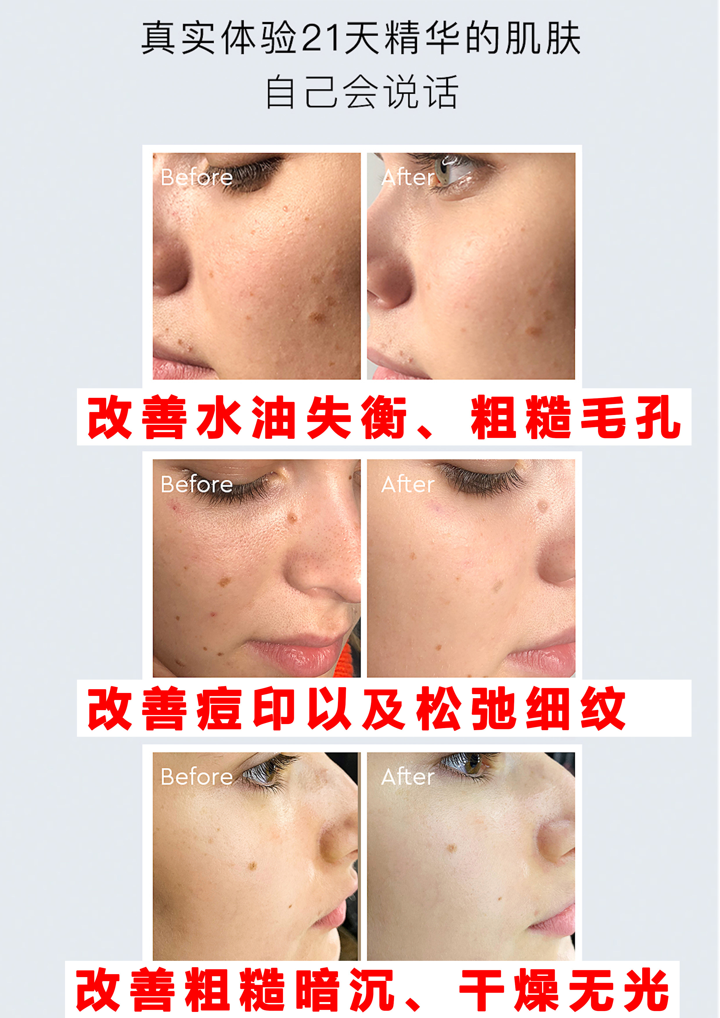 角质屏障被修复,干燥,泛红,痘痘,及干纹细纹,暗沉色着通通不见,皮肤通透呈现健康光泽