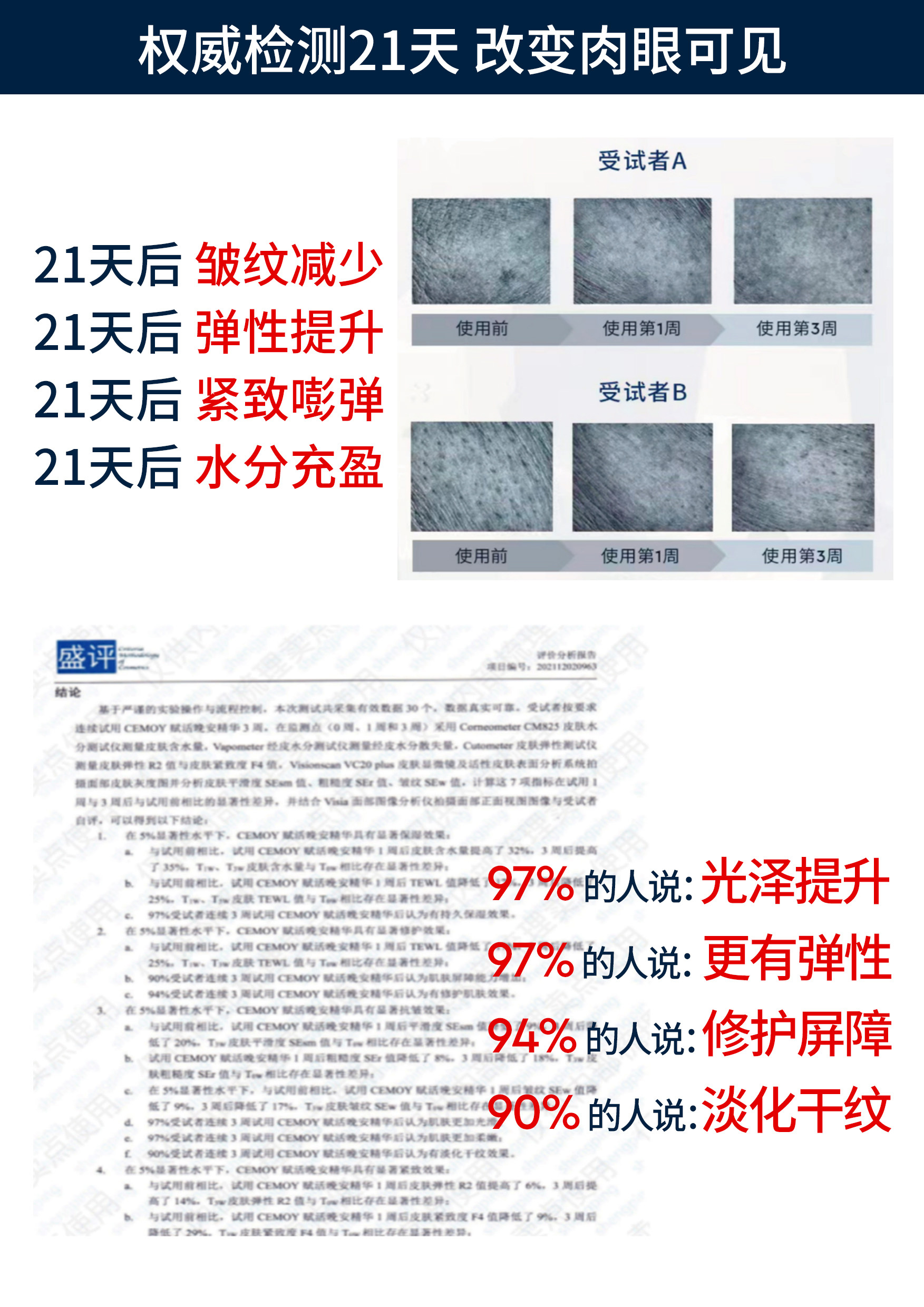 3. 刺激细胞代谢平衡——持续平衡细胞代谢更新,加速细胞周期循坏,21天完成肌理重塑,细胞吸收力全面开启,肌肤呈现由内而外的饱满、通透、焕白;