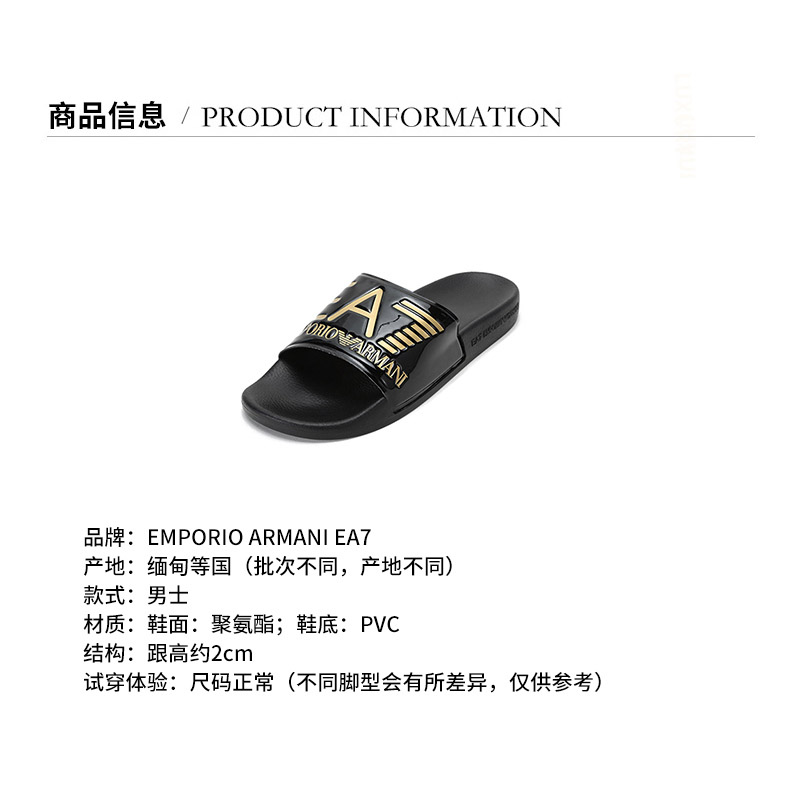 品牌:EA7/EA7产地:缅甸等国(批次不同,产地不同)款式:男士颜色:黑色LOGO图案材质:聚氨酯