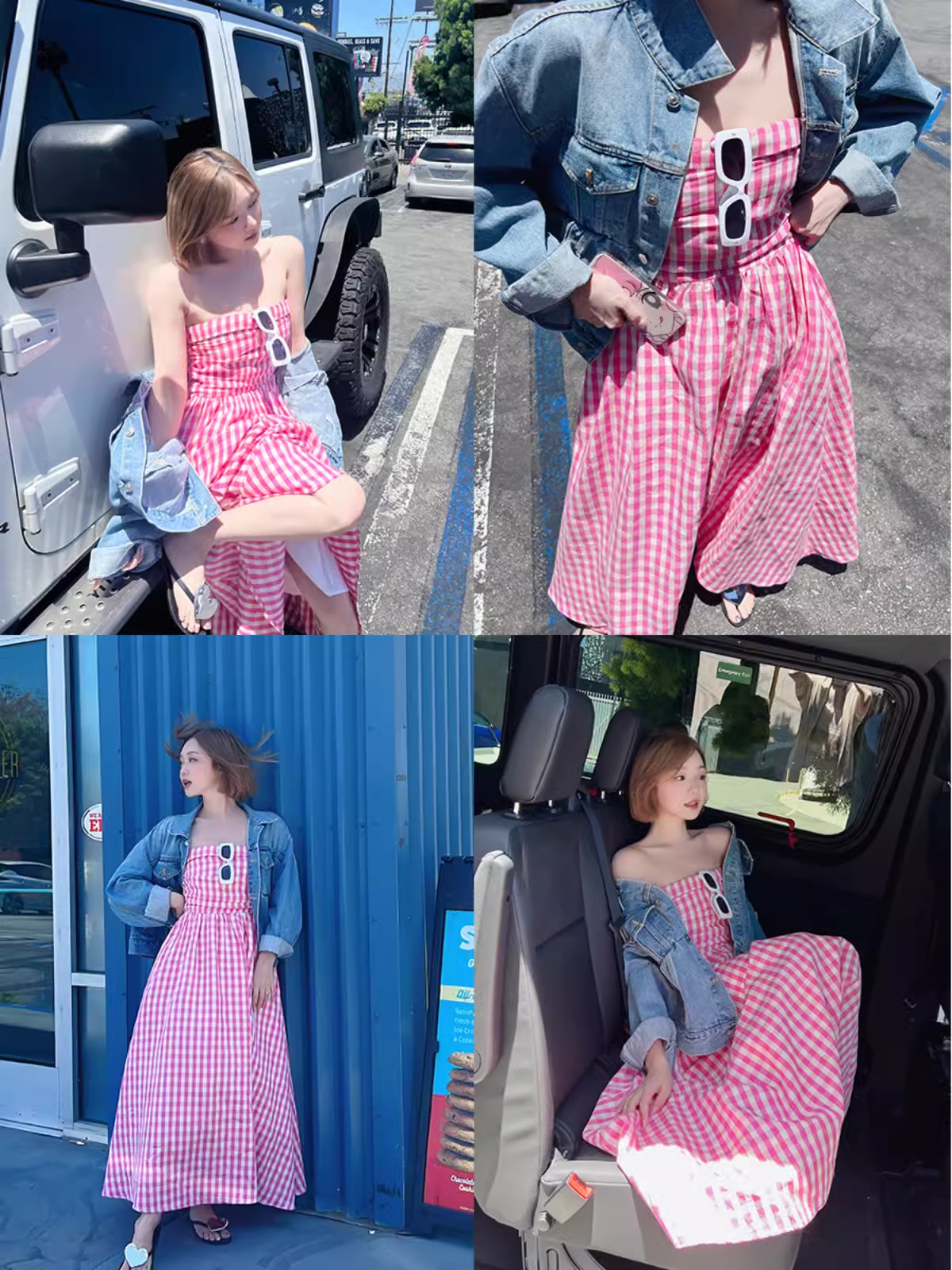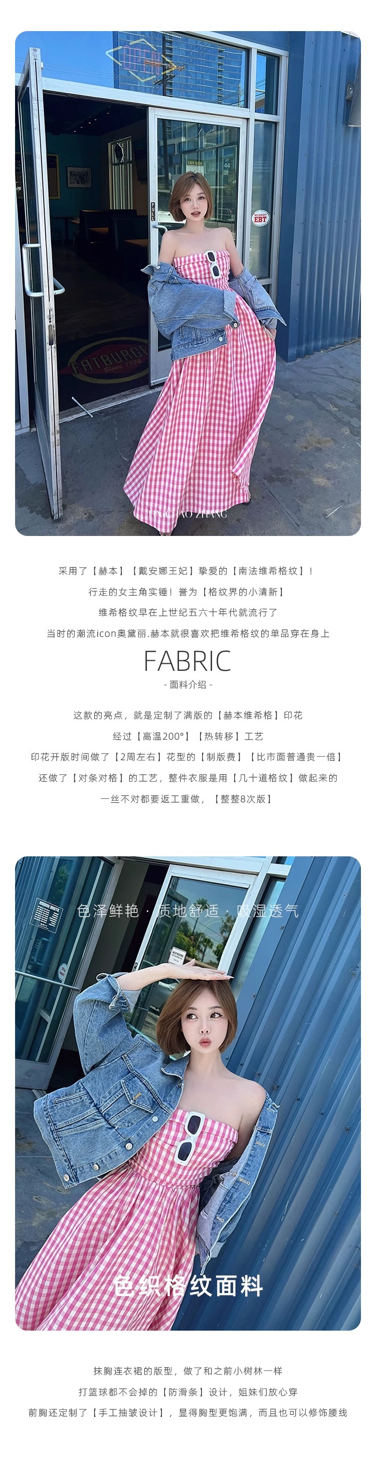清仓捡漏 LINCHAOZHANG 格子抹胸连衣裙女新款夏季复古粉色收腰气质无袖a字裙LL240508