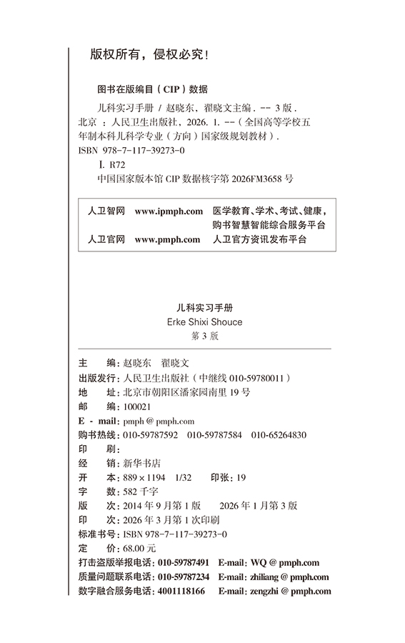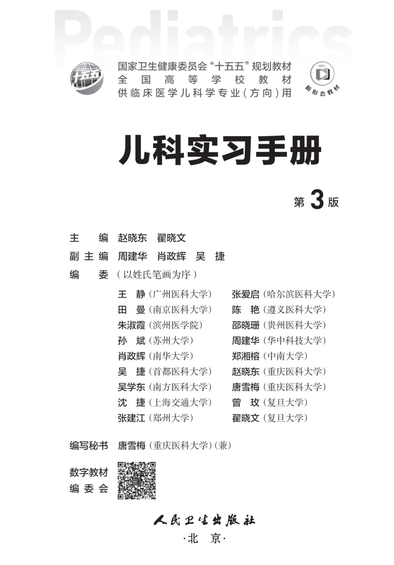 儿科实习手册 第3三版 赵晓东 翟晓文 十五五规划教材 全国高学等学专校教材 供临床儿科学业(方向)用 本科儿科学 人民卫生出版社