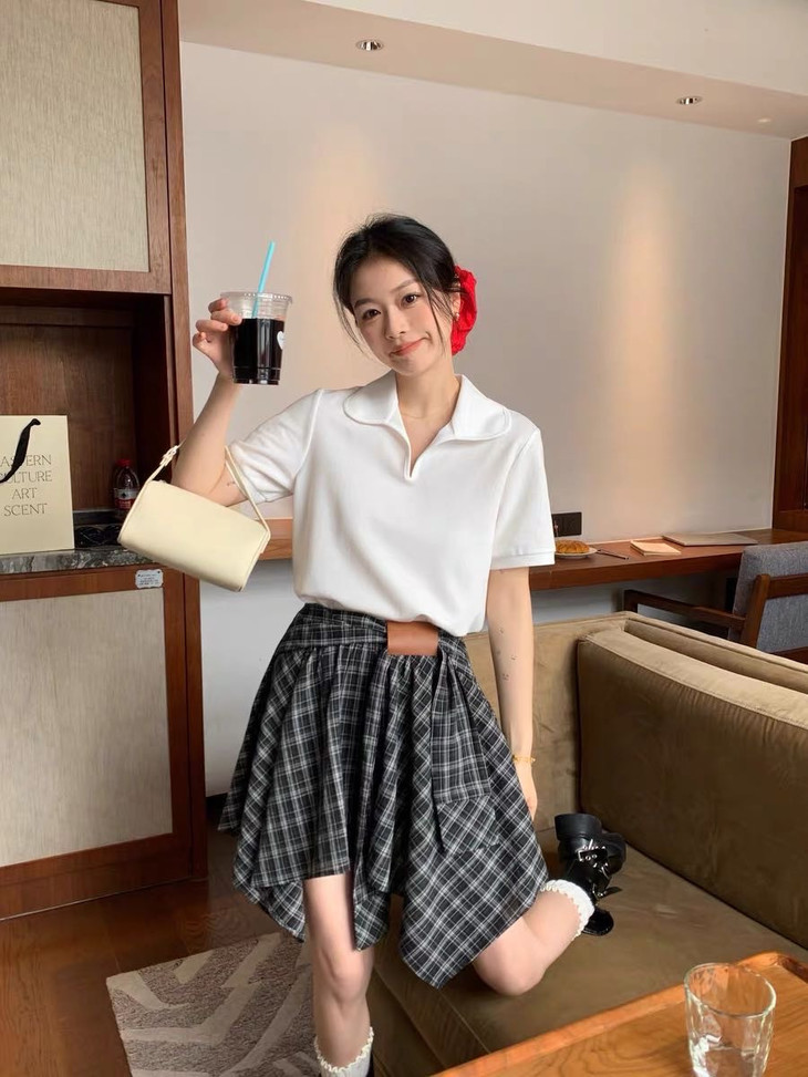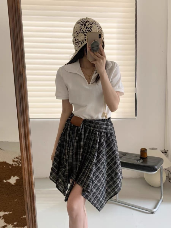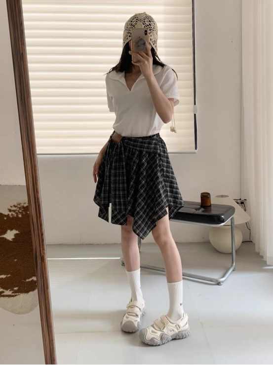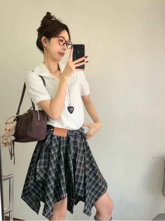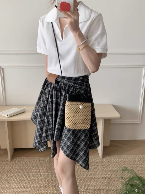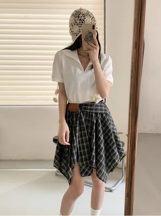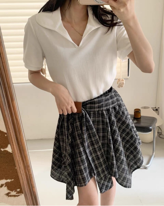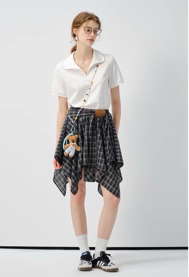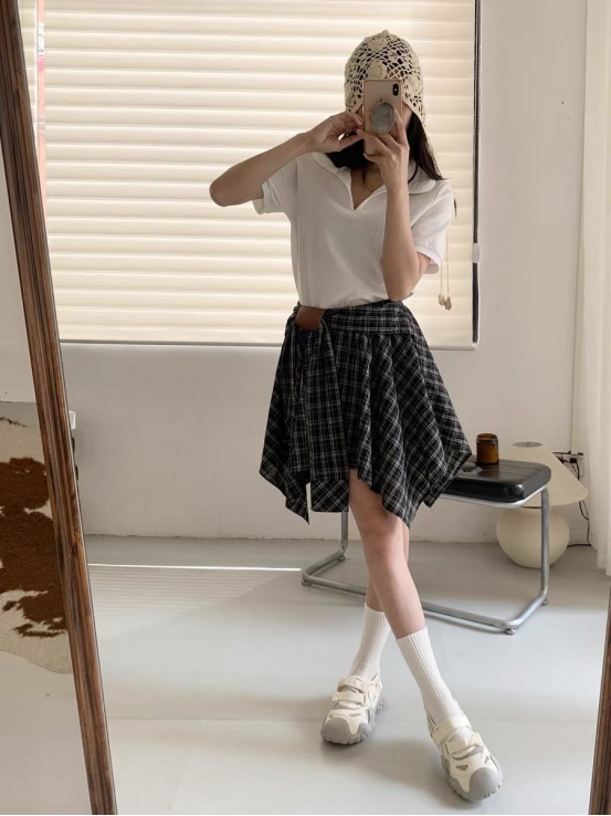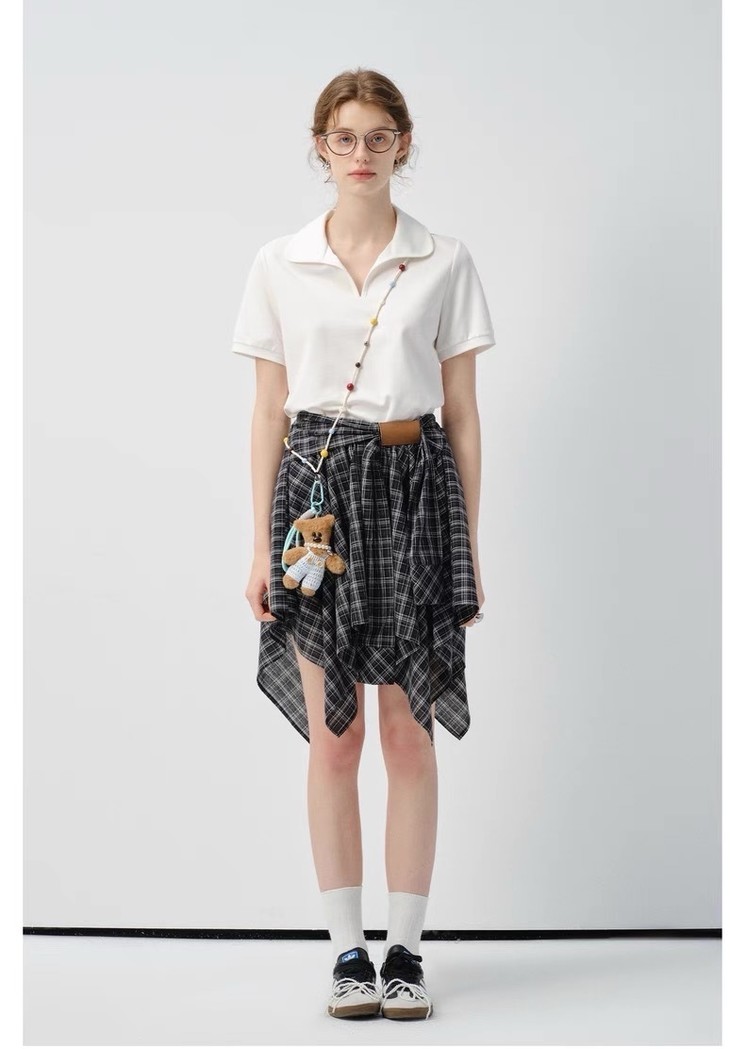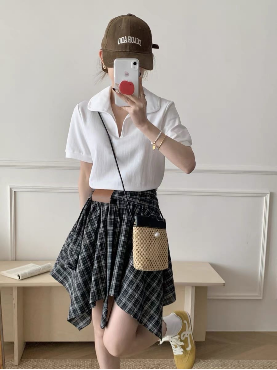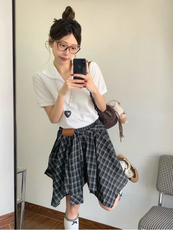 🌸春夏限定💰【苏格兰格子不规则半身裙&娃娃领正肩T恤】甜酷风造型,简约韩系氛围感穿搭!☀️翻领设计展现颈部线条,日常百搭又通勤