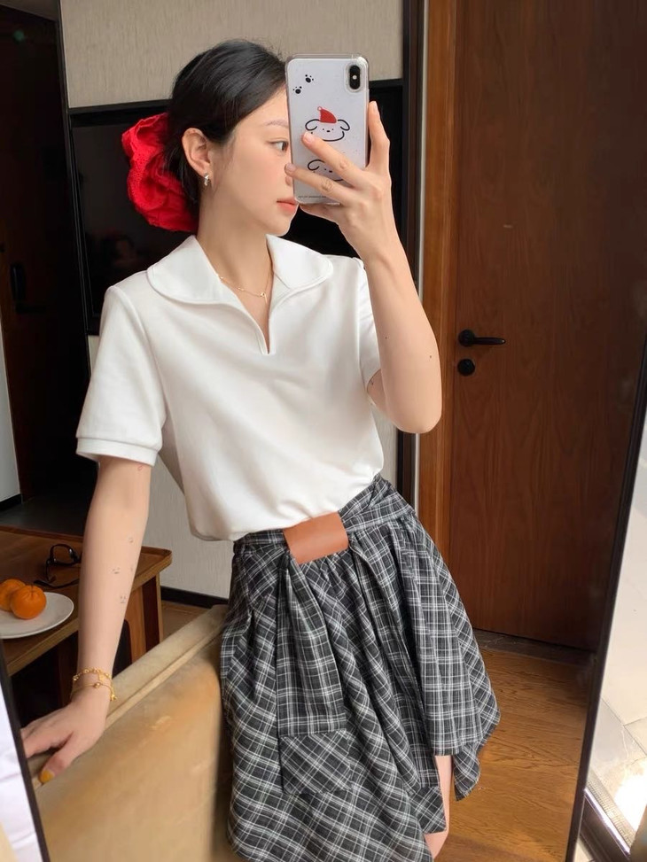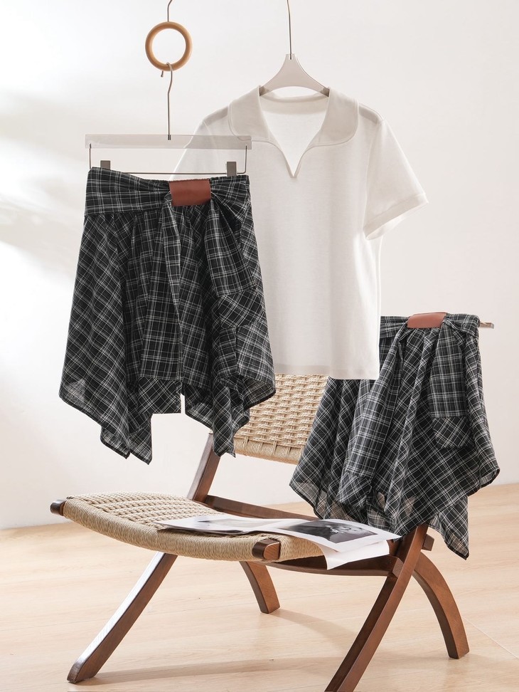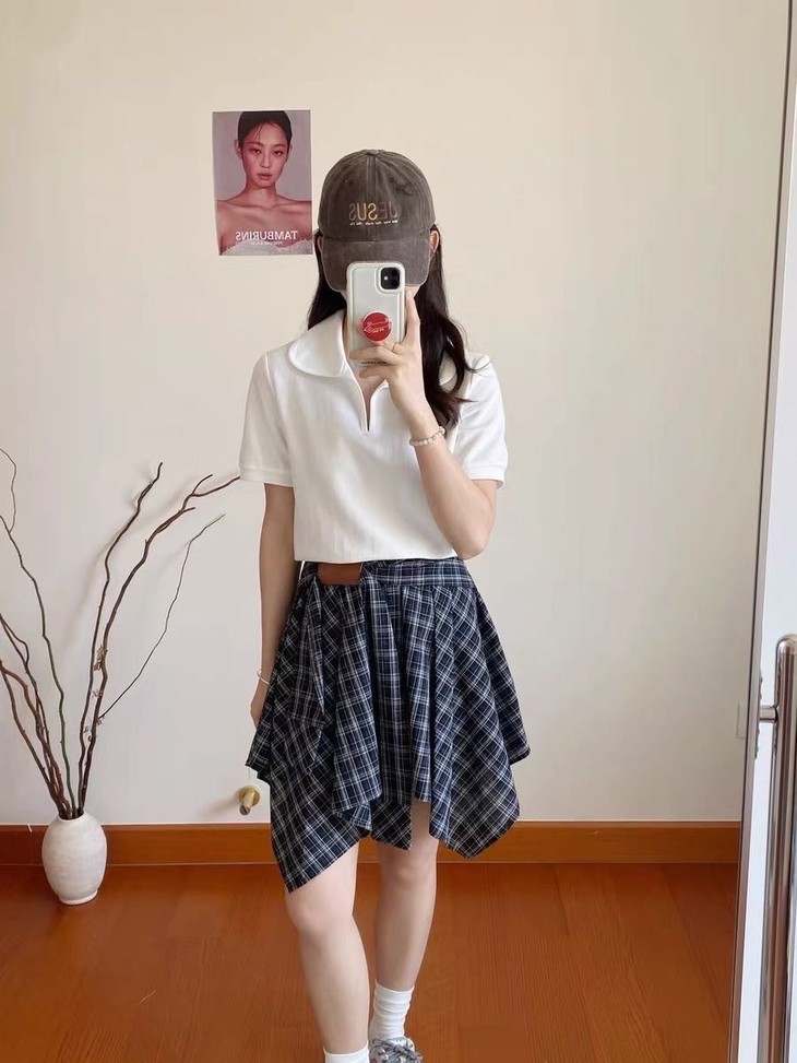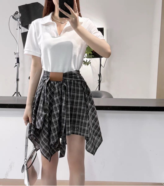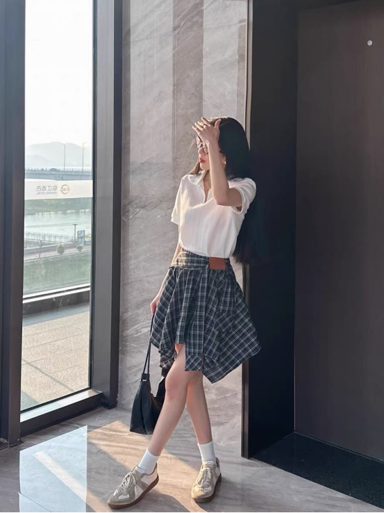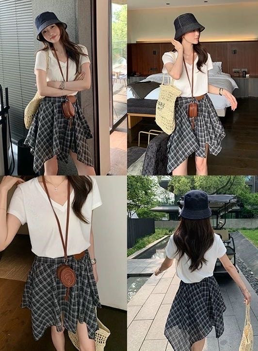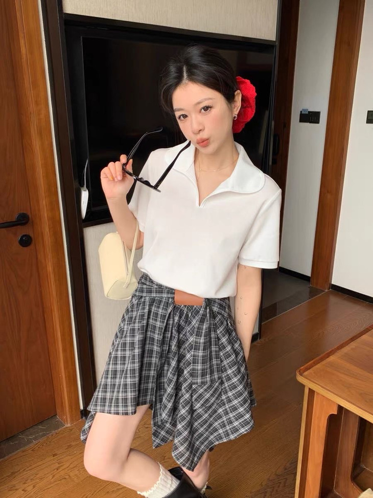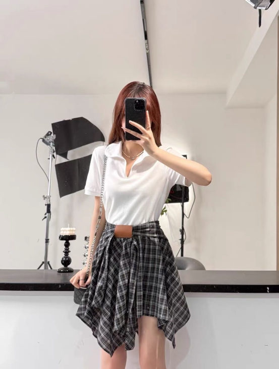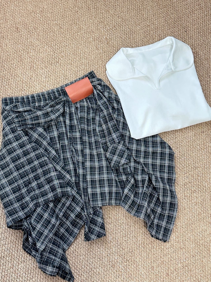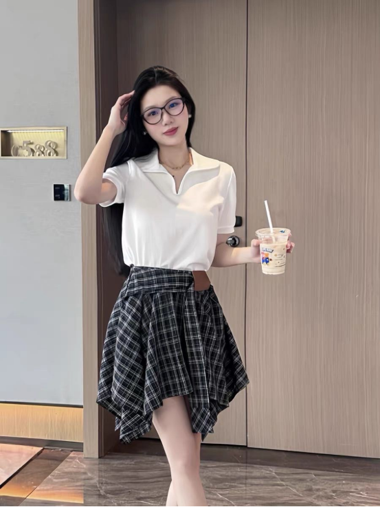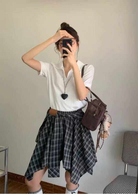 🌸春夏限定💰【苏格兰格子不规则半身裙&娃娃领正肩T恤】甜酷风造型,简约韩系氛围感穿搭!☀️翻领设计展现颈部线条,日常百搭又通勤