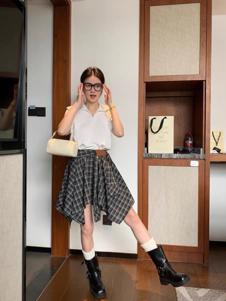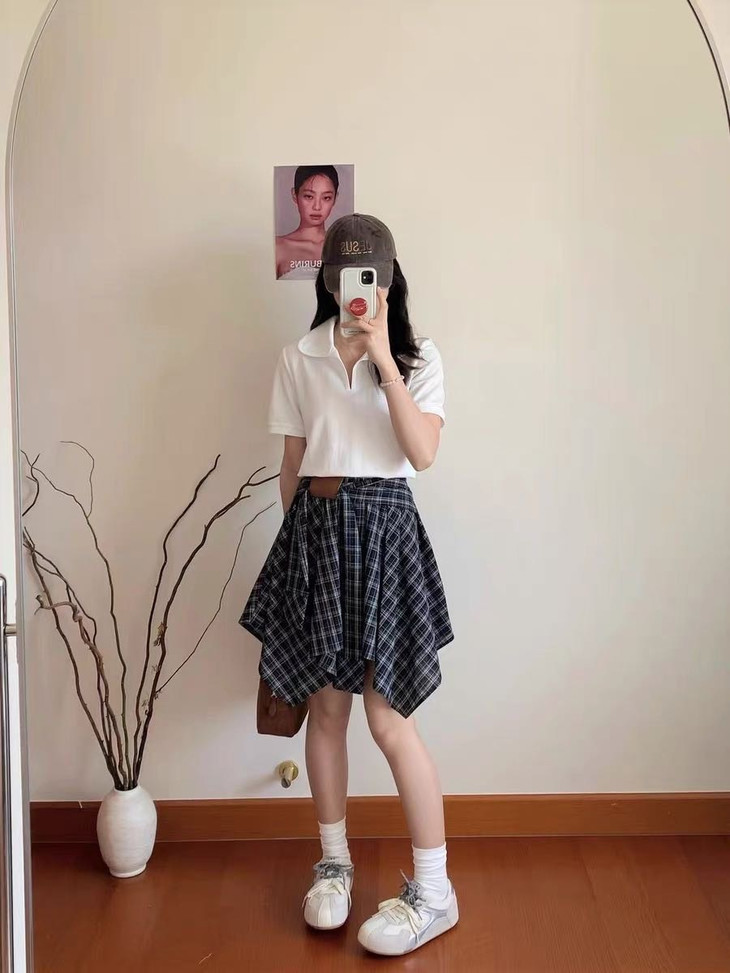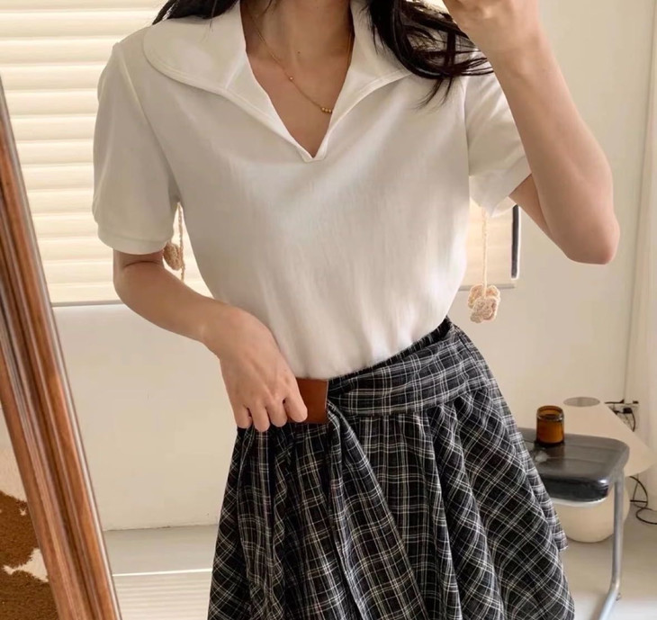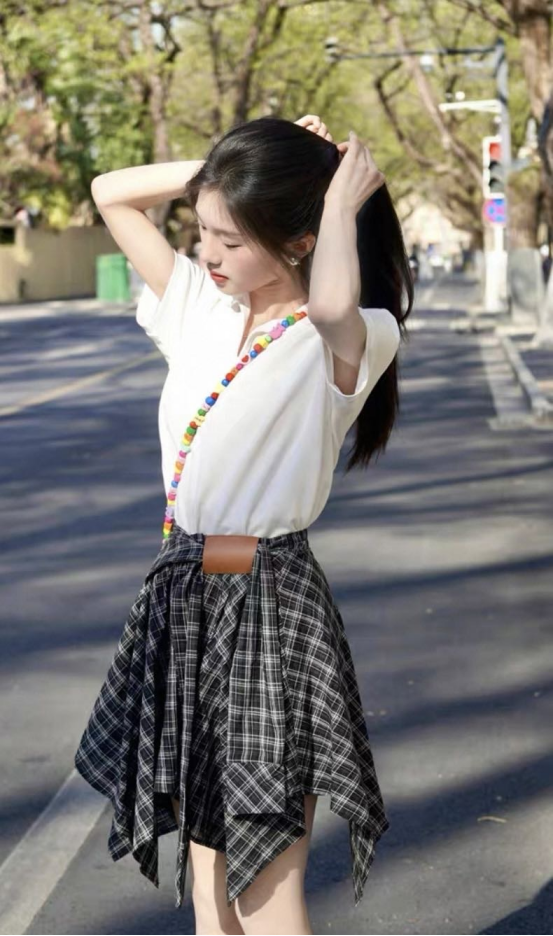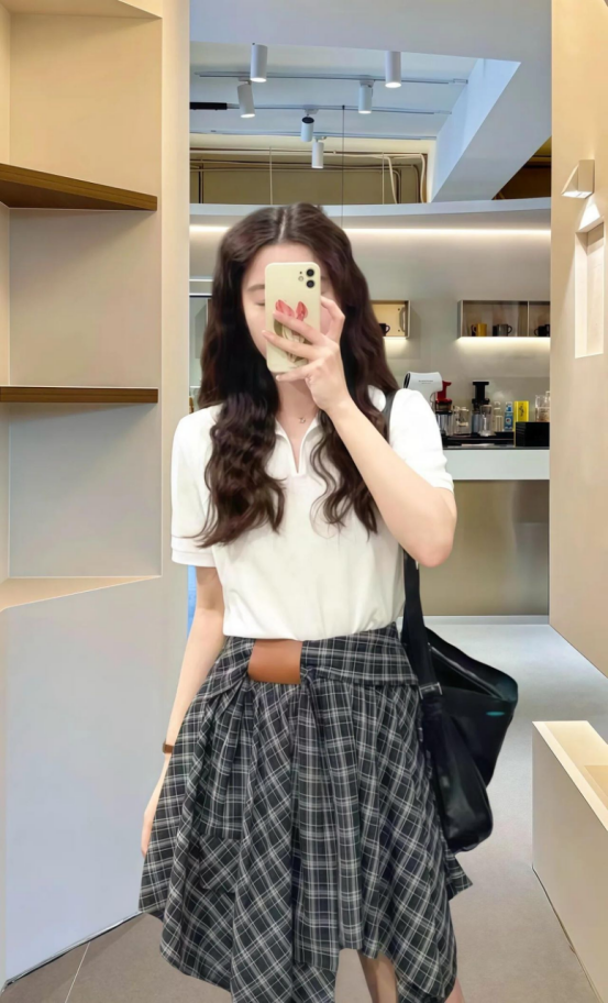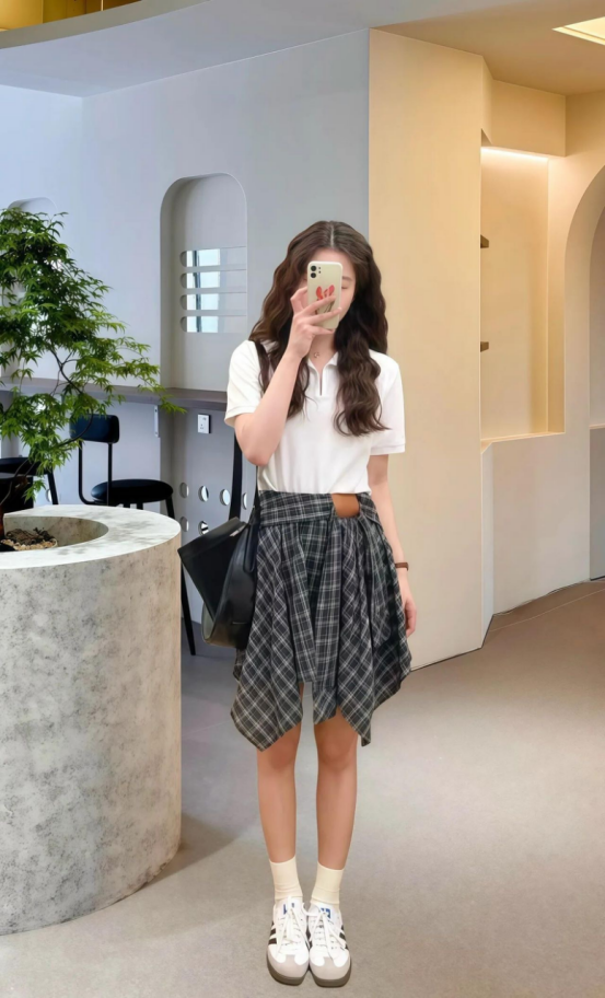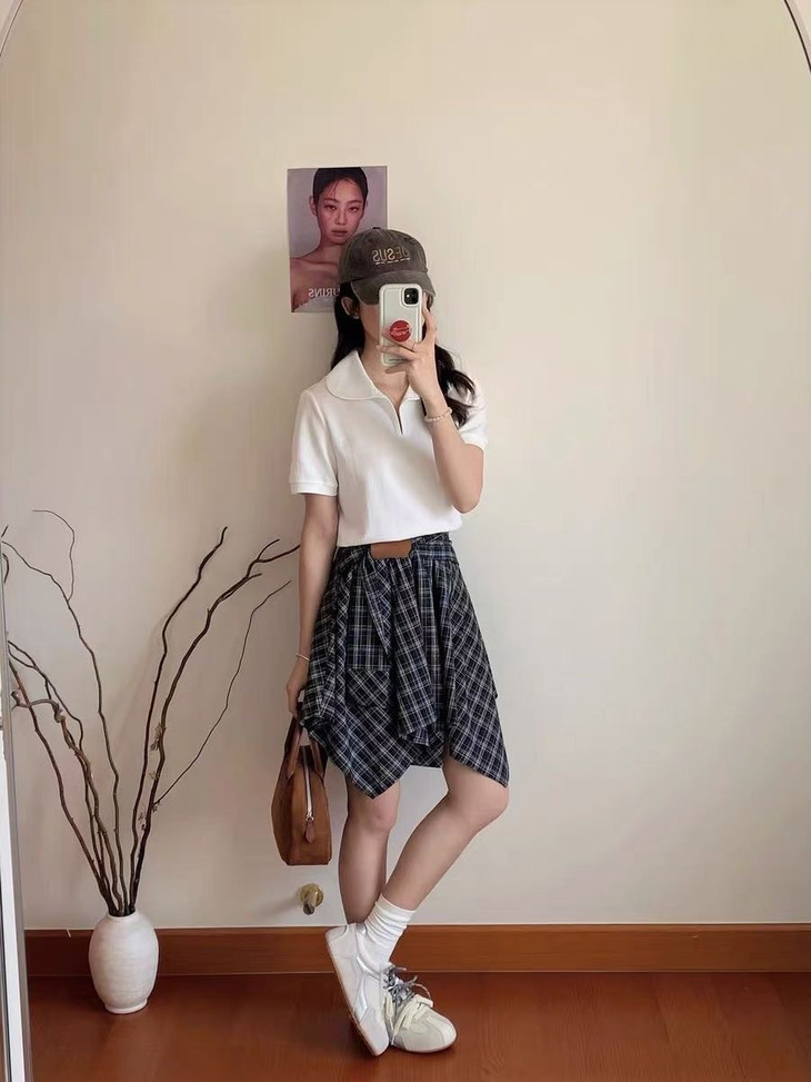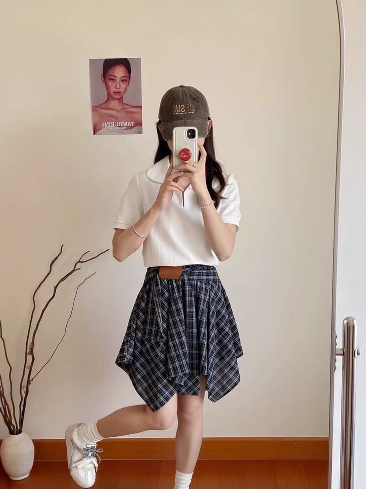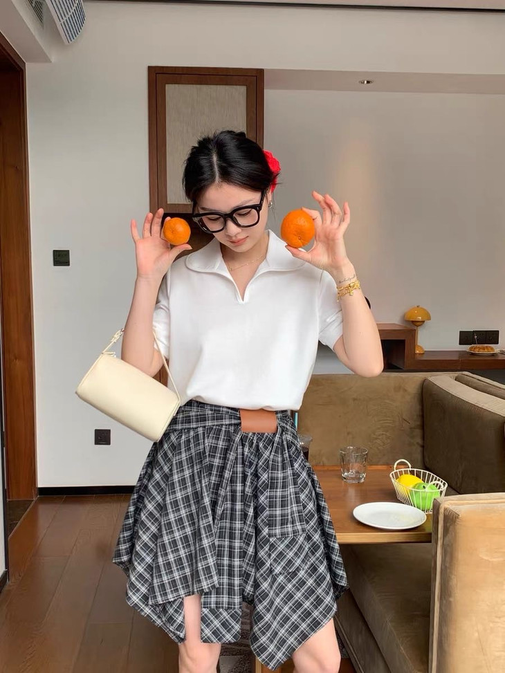 🌸春夏限定💰【苏格兰格子不规则半身裙&娃娃领正肩T恤】甜酷风造型,简约韩系氛围感穿搭!☀️翻领设计展现颈部线条,日常百搭又通勤