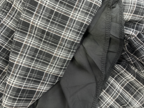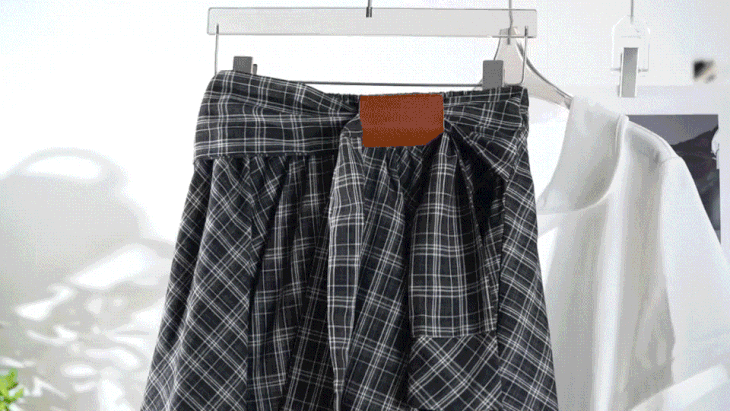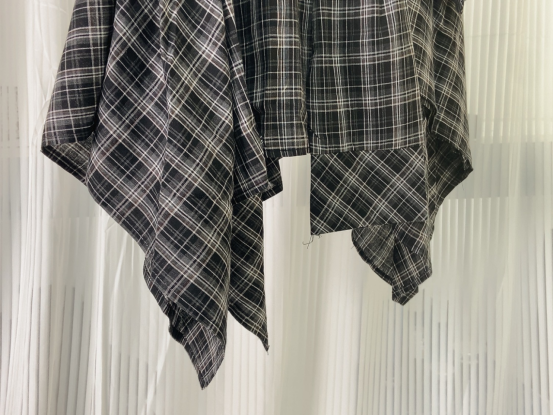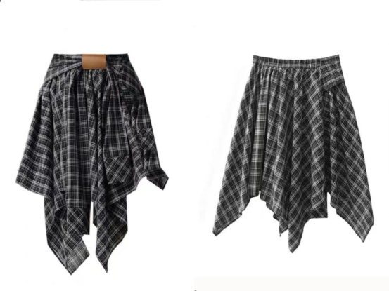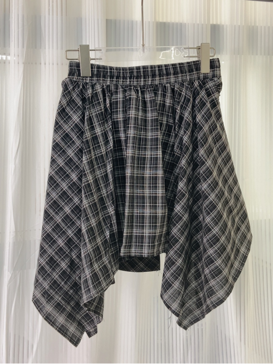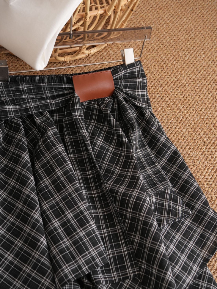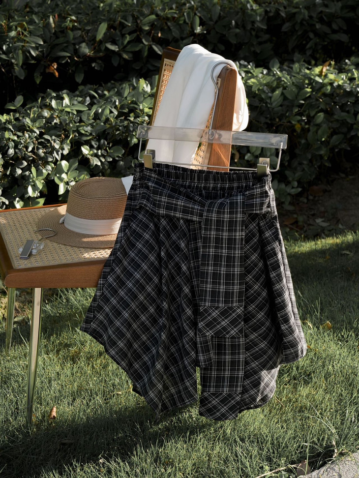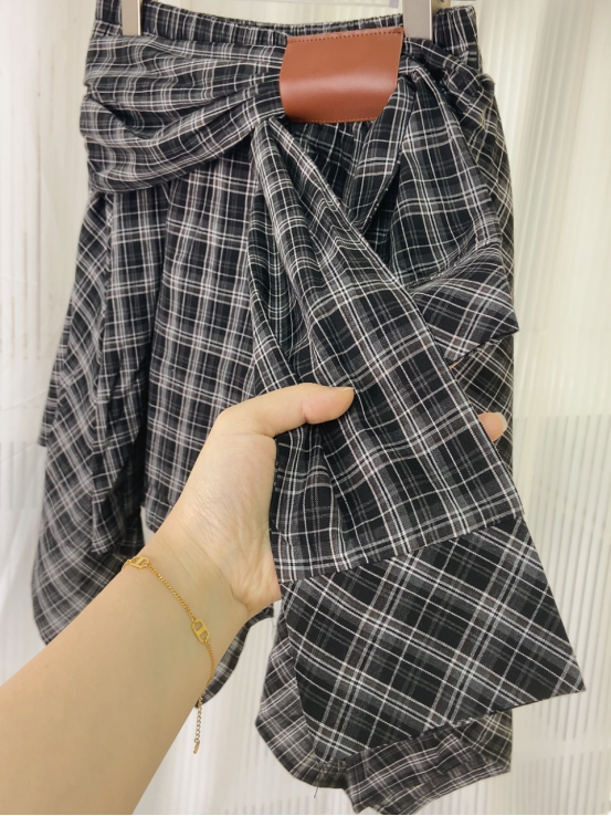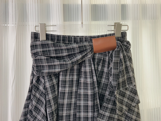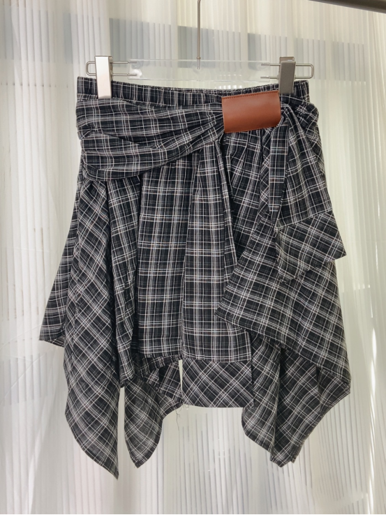 复古撞色格纹 腰间定制皮畔 不规则的A字短裙 宽边衬衫长袖拼接 在腰间打结设计 下摆错落有致 动感的视觉效果