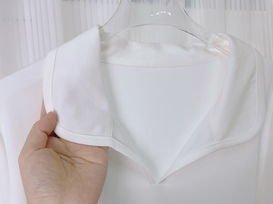 V领的设计,巧妙的露出锁骨 但是又暴露的刚刚好,不会太过 同时又能很好的修饰脸型和颈部线条 领口同面料包边,压线固定不易变形,干净平整 拿捏“纸片人”的既视感,整体干净利落