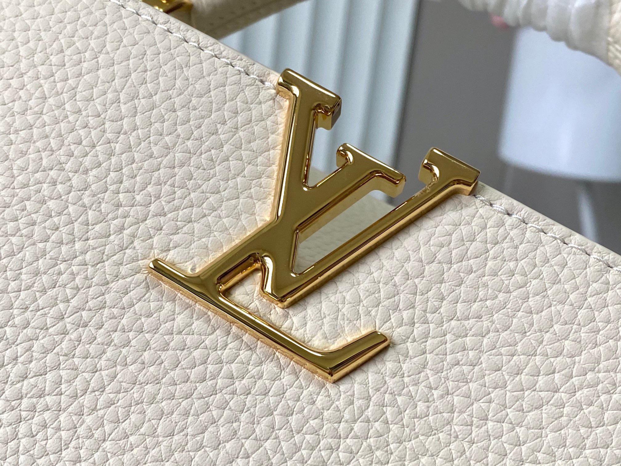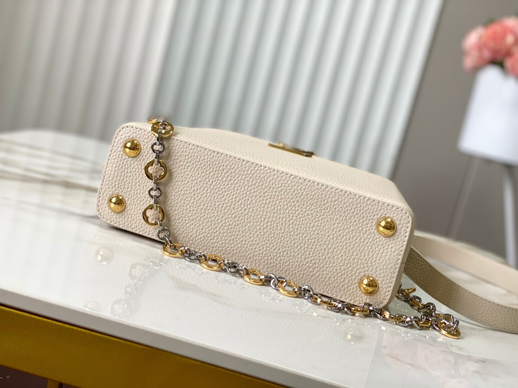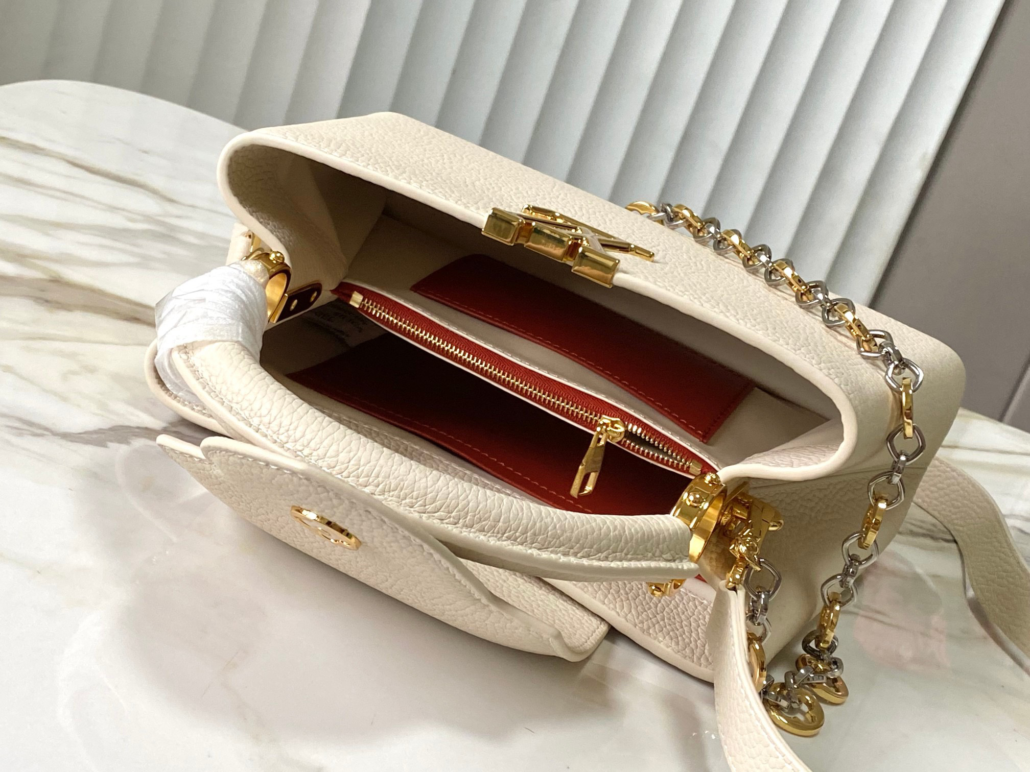 秋冬特惠💰1750 渠道级LV 新品 te级LV 动态芯片 M12938/M48865奶白圆花环扣款 本款Capucines 手袋取材柔韧Taurillon 牛皮革 以珠宝风格双镀链条和 Monogram花卉元素点明Chain On You系列身份 翻盖可置于内外两侧 充裕构型和多重内袋方便收纳日常所需 圆润LV字母再添匠心细节 Size: 27 * 18 * 9 cm