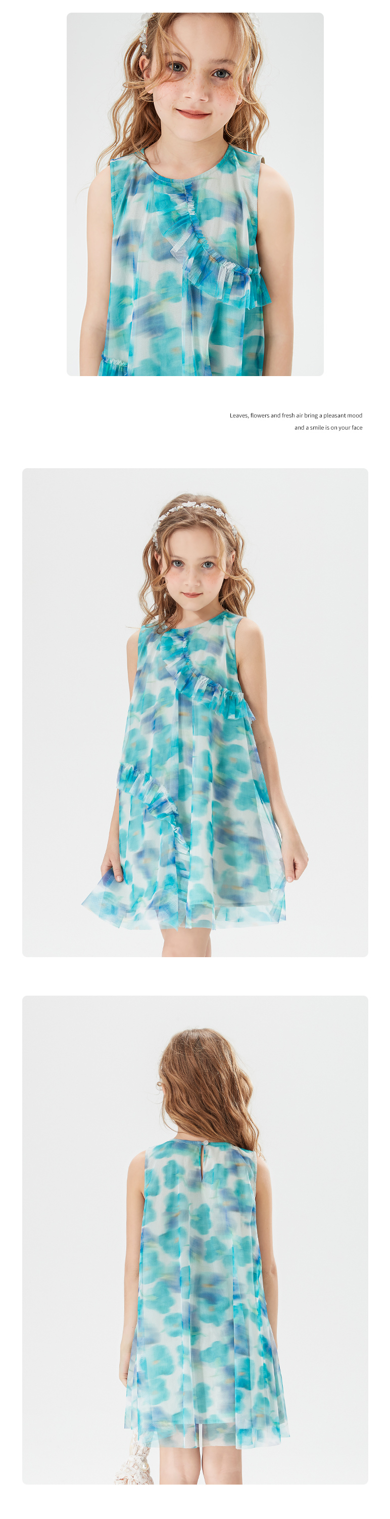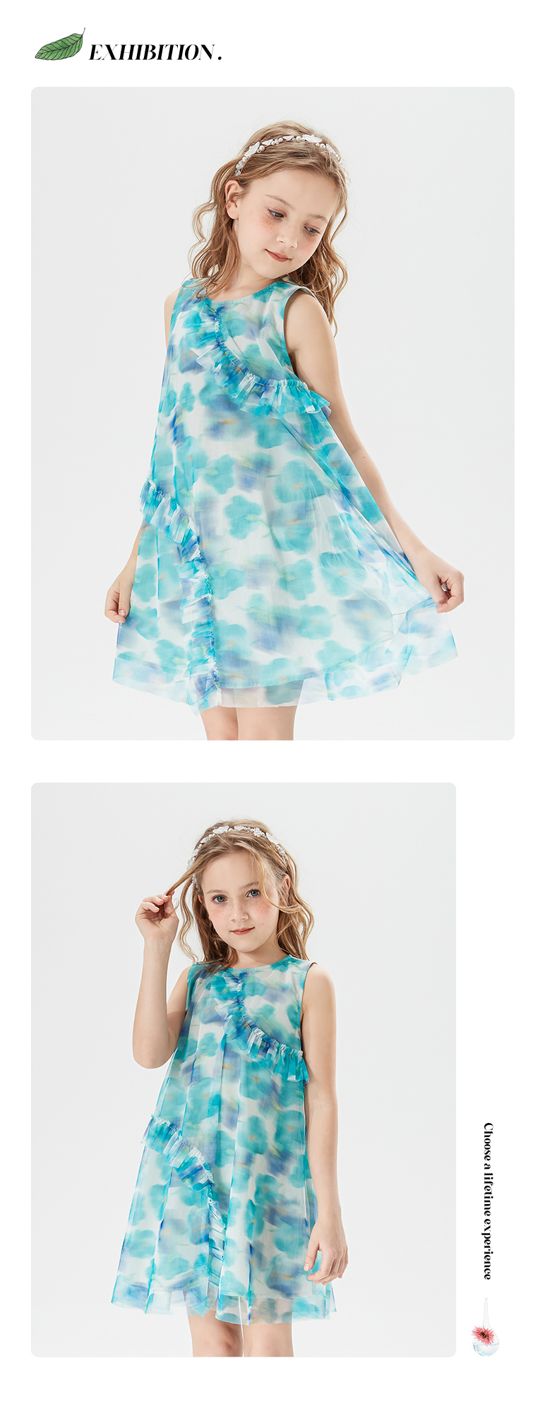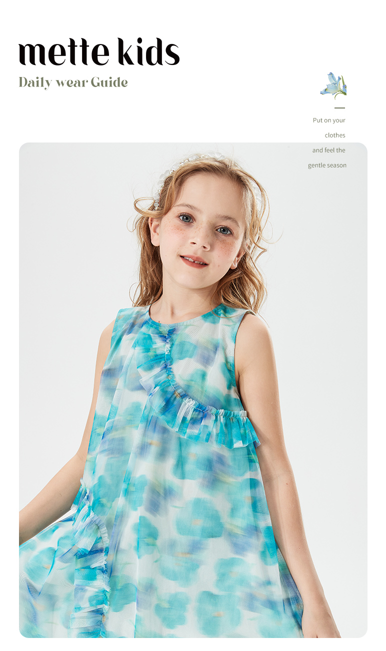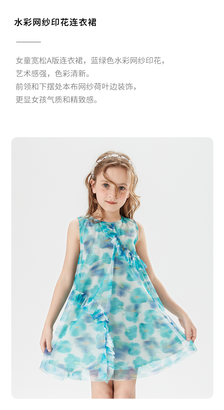 mettekids女童连衣裙夏中大童水彩花网纱洋气时髦公主裙儿童裙子