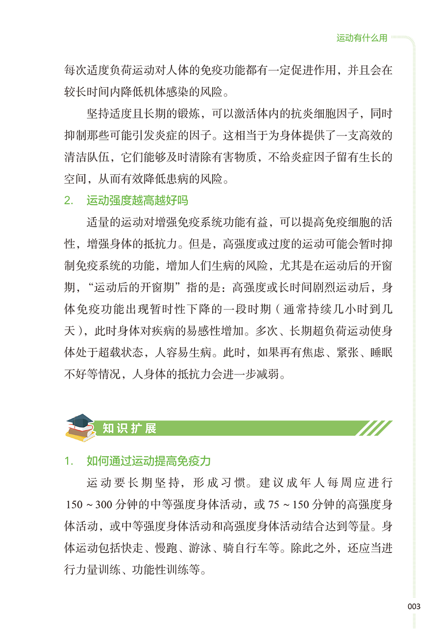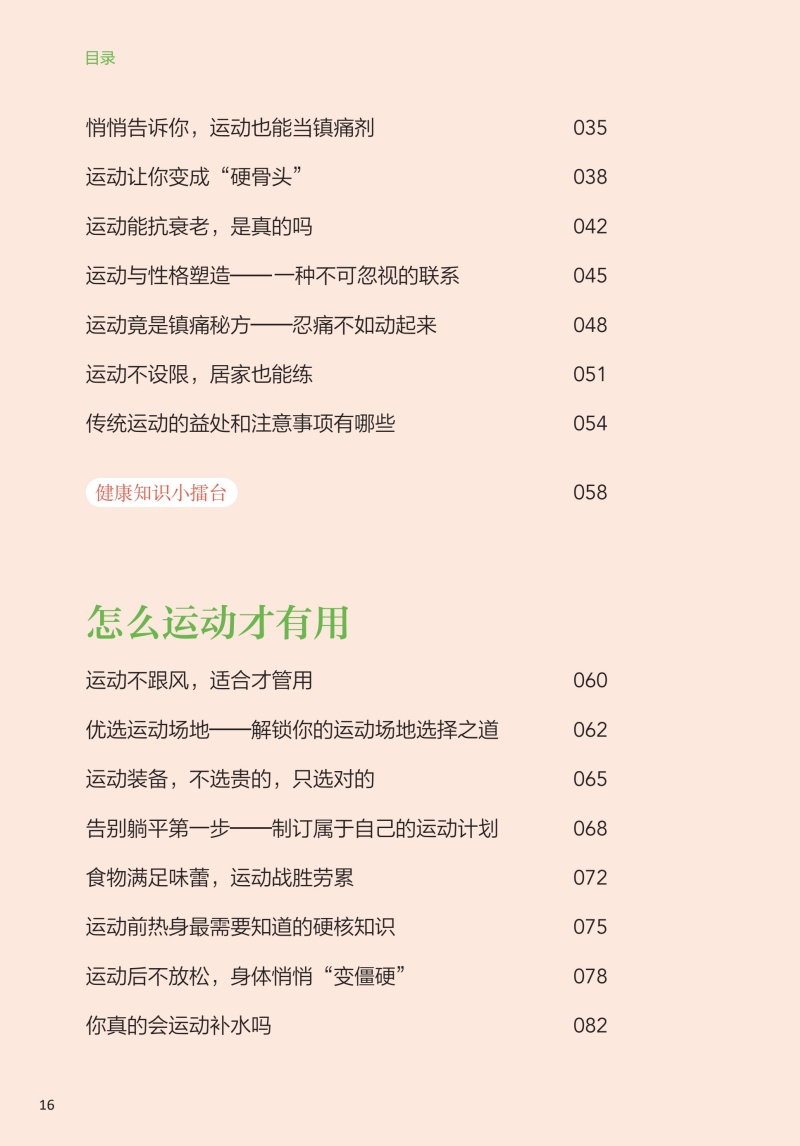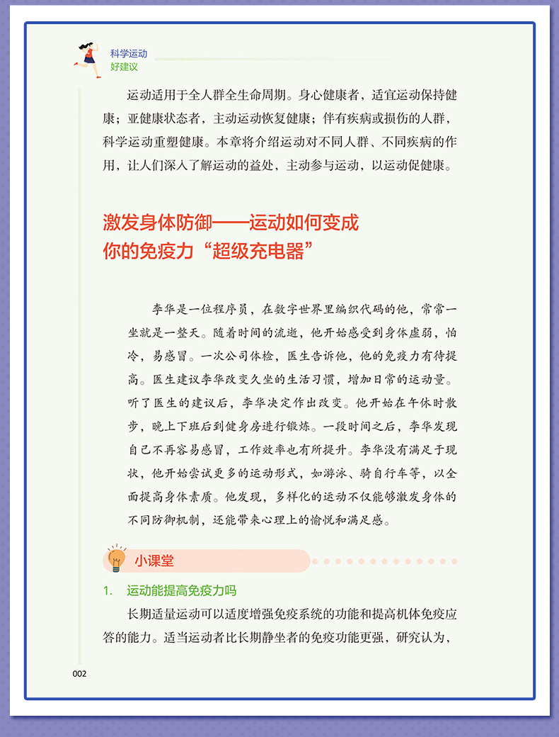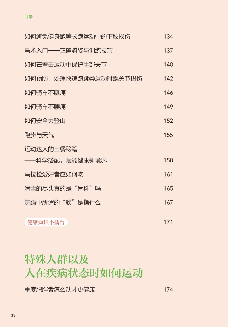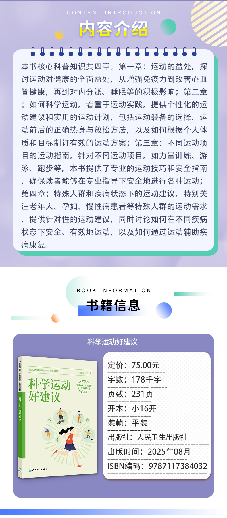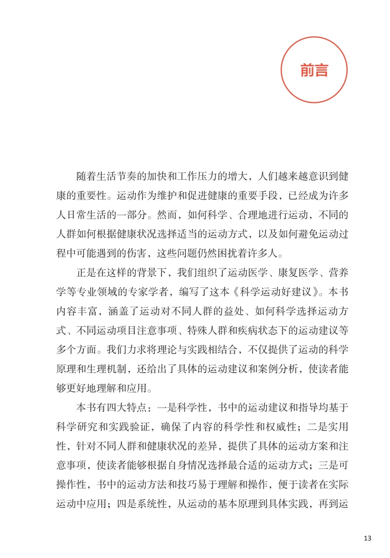 本书核心科普知识共四章。**章:运动的益处,探讨运动对健康的全面益处,从增强免疫力到改善心血管健康,再到对内分泌、睡眠等的积极影响;**章:如何科学运动,着重于运动实践,提供个性化的运动建议和实用的运动计划,包括运动装备的选择、运动前后的正确热身与放松方法,以及如何根据个人体质和目标制订有效的运动方案;第三章:不同运动项目的运动指南,针对不同运动项目,如力量训练、游泳、跑步等,本书提供了专业的运动技巧和安全指南,确保读者能够在专业指导下安全地进行各种运动;第四章:特殊人群和疾病状态下的运动建议,特别关注老年人、孕妇、慢性病患者等特殊人群的运动需求,提供针对性的运动建议,同时讨论如何在不同疾病状态下安全、有效地运动,以及如何通过运动辅助疾病康复。