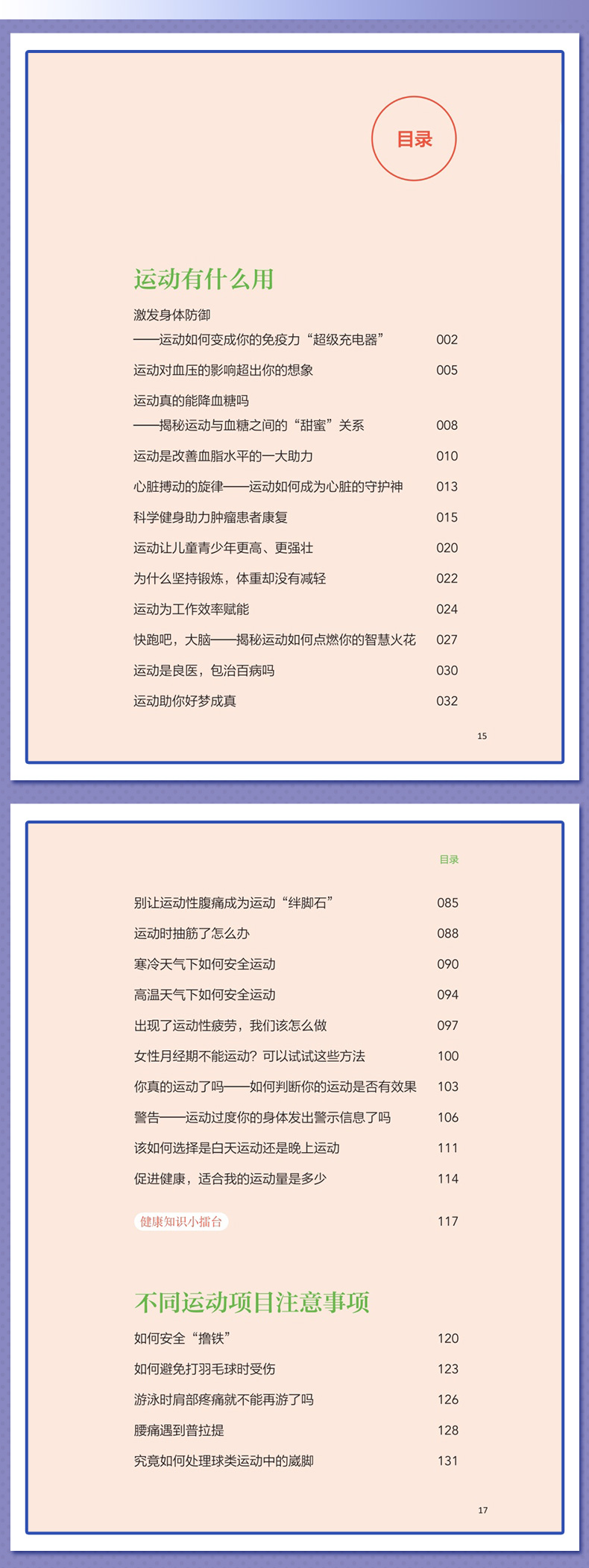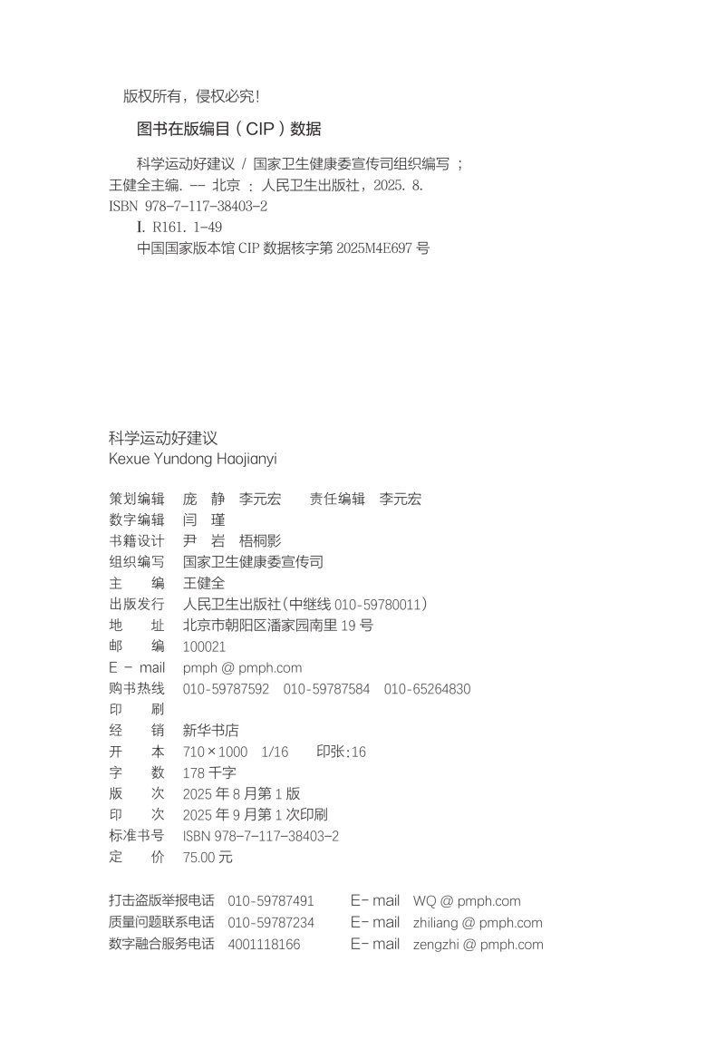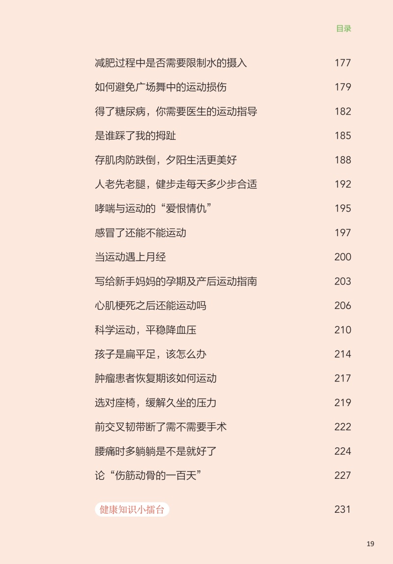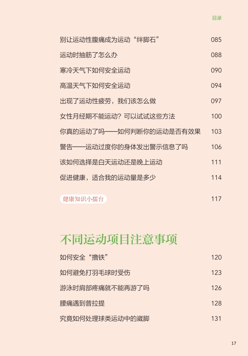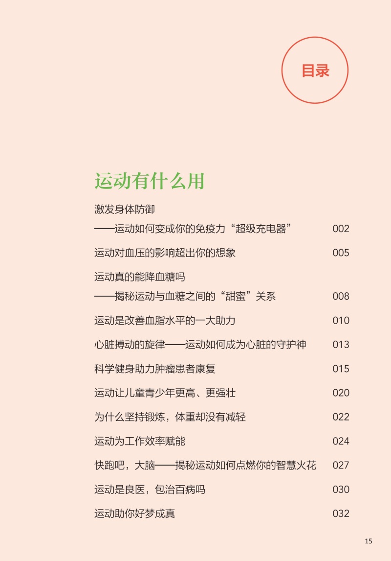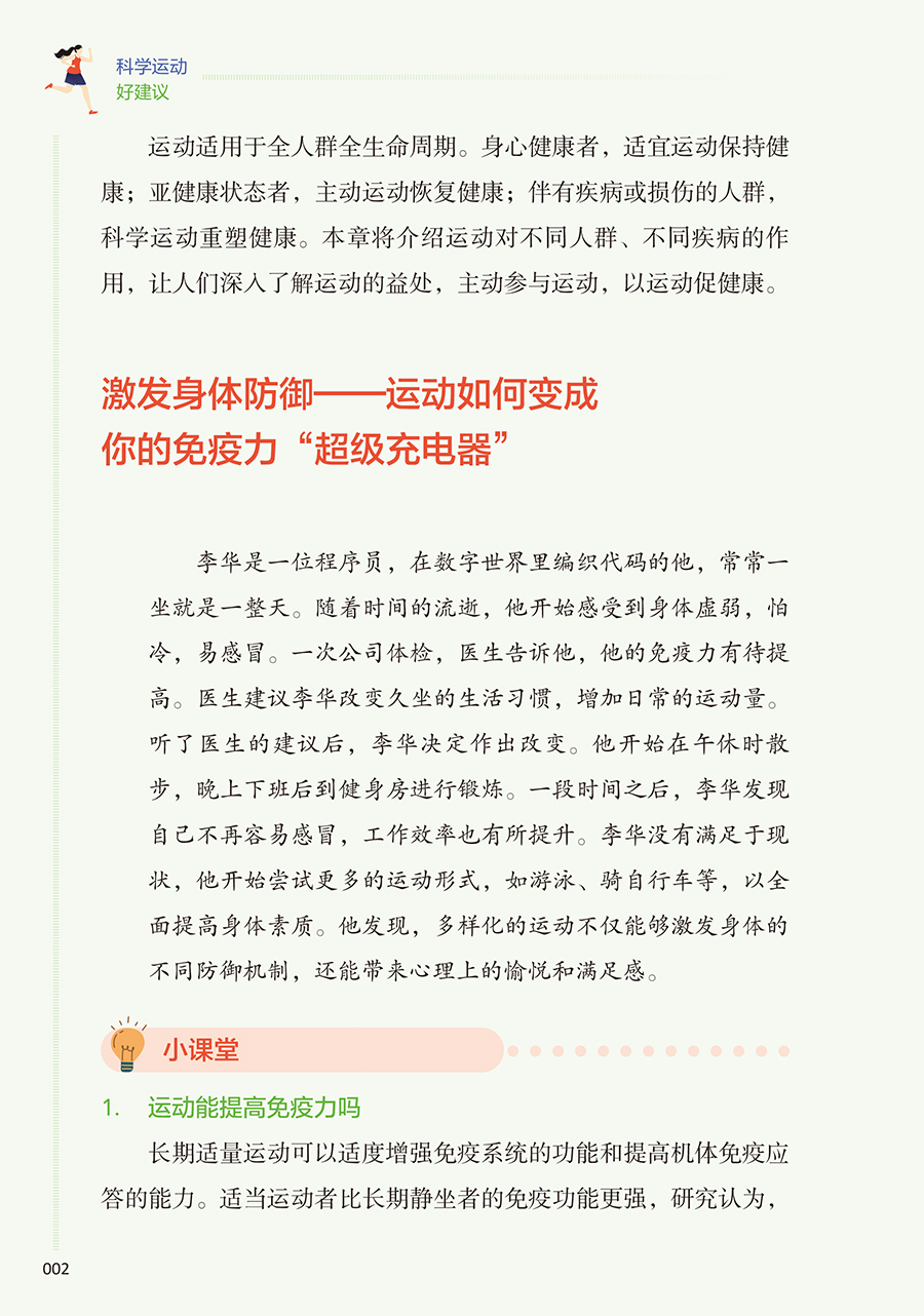 本书核心科普知识共四章。**章:运动的益处,探讨运动对健康的全面益处,从增强免疫力到改善心血管健康,再到对内分泌、睡眠等的积极影响;**章:如何科学运动,着重于运动实践,提供个性化的运动建议和实用的运动计划,包括运动装备的选择、运动前后的正确热身与放松方法,以及如何根据个人体质和目标制订有效的运动方案;第三章:不同运动项目的运动指南,针对不同运动项目,如力量训练、游泳、跑步等,本书提供了专业的运动技巧和安全指南,确保读者能够在专业指导下安全地进行各种运动;第四章:特殊人群和疾病状态下的运动建议,特别关注老年人、孕妇、慢性病患者等特殊人群的运动需求,提供针对性的运动建议,同时讨论如何在不同疾病状态下安全、有效地运动,以及如何通过运动辅助疾病康复。