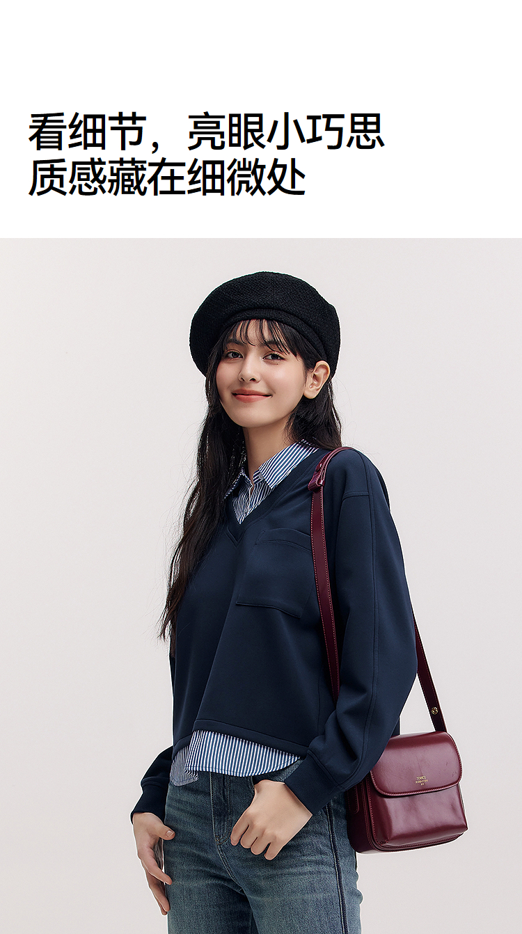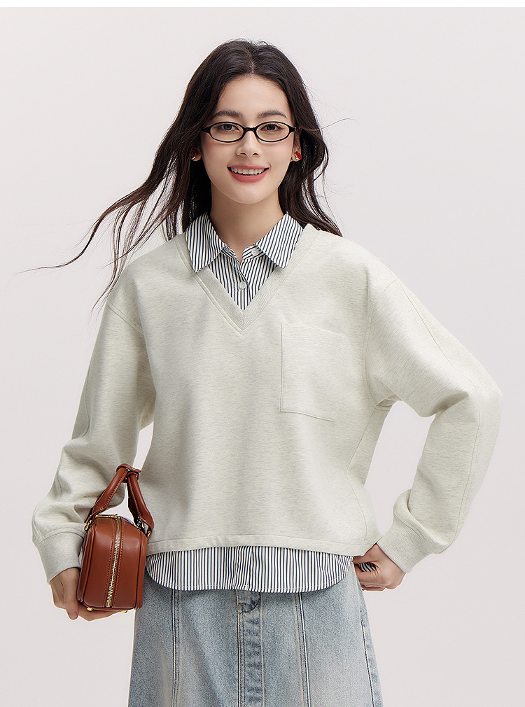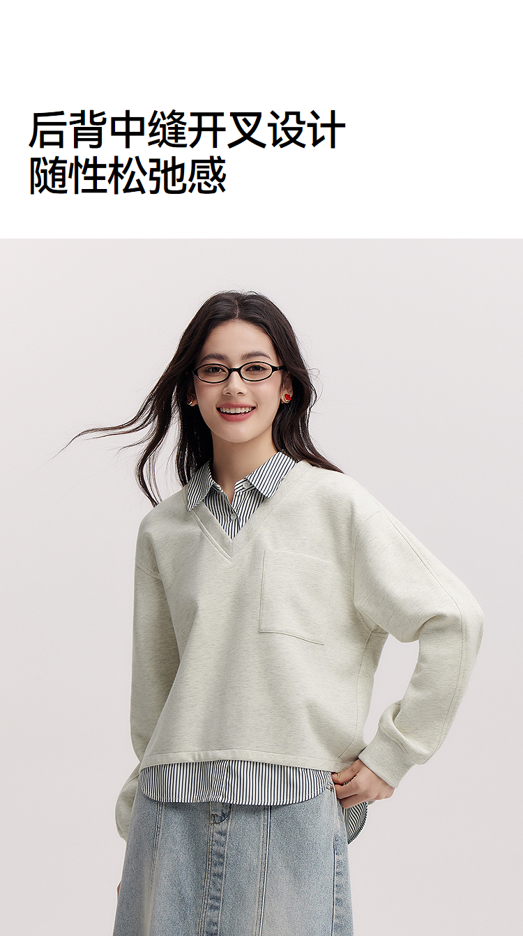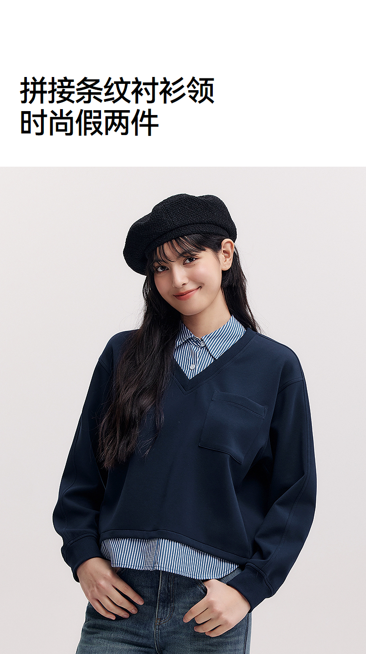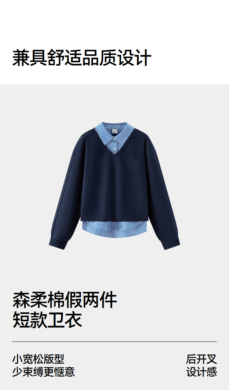 森柔|森马卫衣女春季短款假两件条纹宽松翻领开叉设计感气质衣服