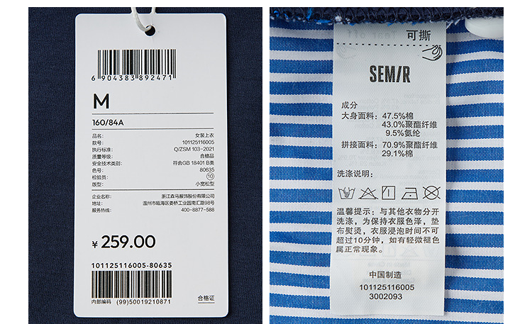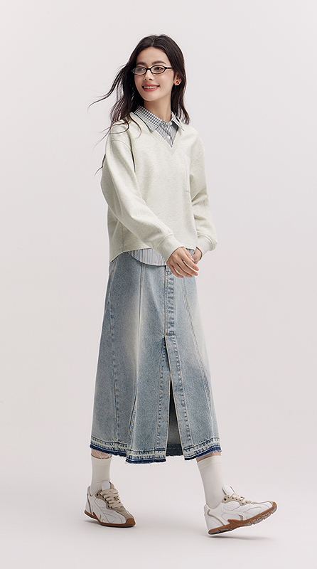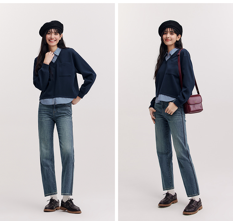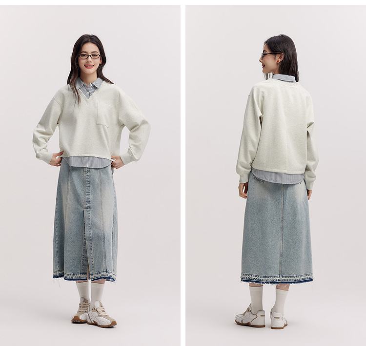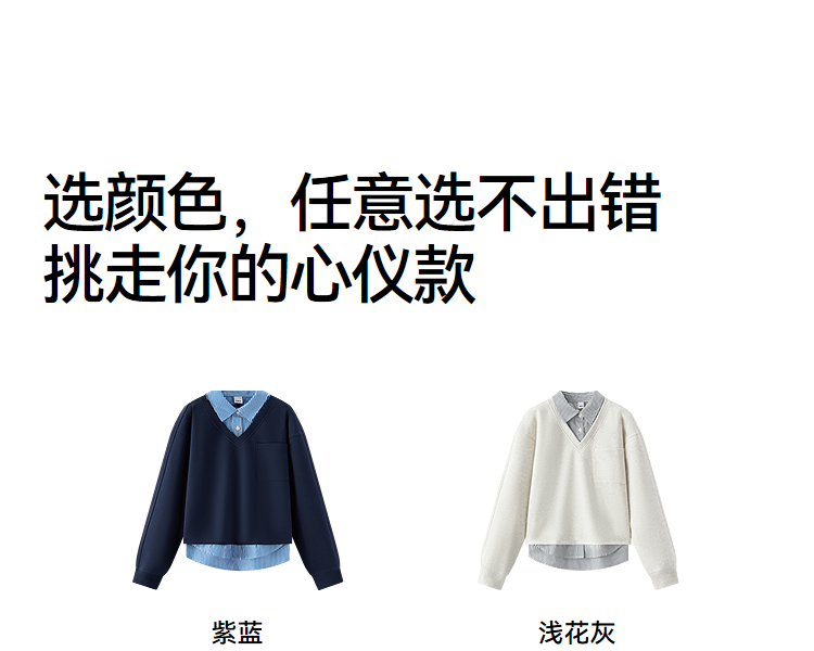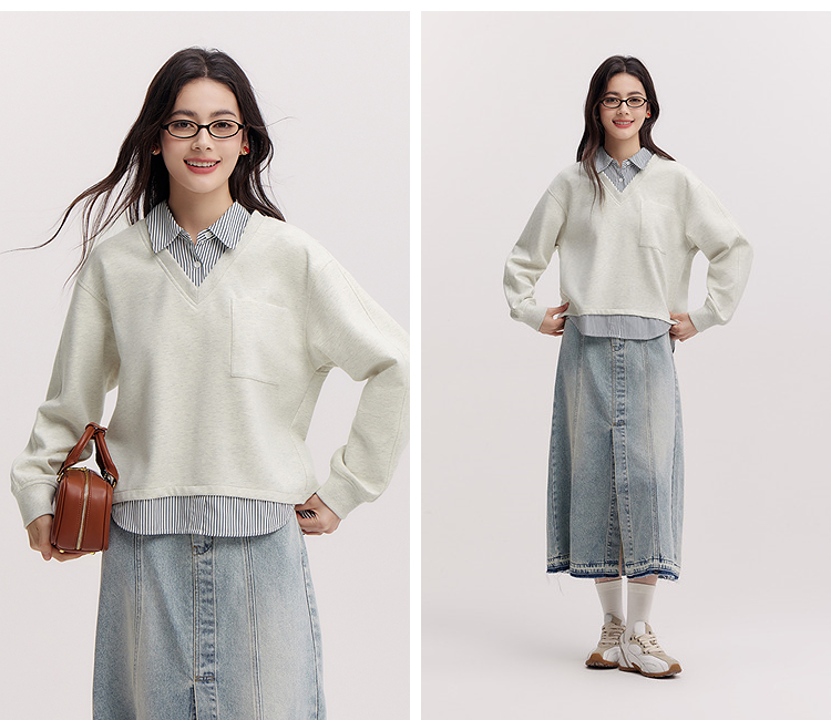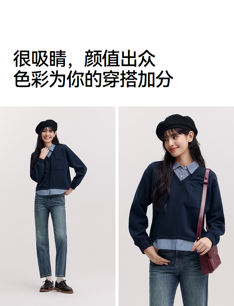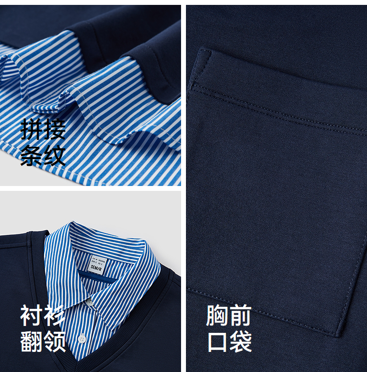 森柔|森马卫衣女春季短款假两件条纹宽松翻领开叉设计感气质衣服
