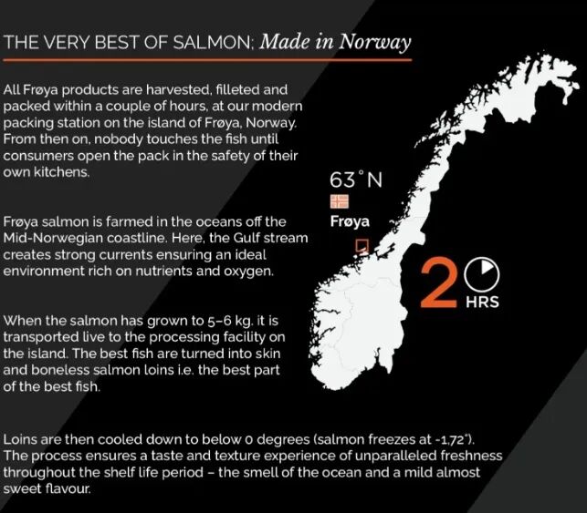 这不,为了大家的安全着想,我们新先聚品为大家找到了挪威当地高级超市都在卖的挪威原产鲜切可生食三文鱼(毕竟是生食食品,市场又非常混乱,我们必须严格把关),全球第二大三文鱼工厂生产、挪威当天切当天发、72小时从挪威到国内,全程琐鲜,达到欧盟生食标准(所有批次通过李斯特菌检测,孕妇儿童放心食用)的挪威三文鱼~只选择三文鱼最好的中段鱼腩,一条鱼只取10%最精华部分,保证大家吃到的都是安全又高品质的三文鱼肉~它就是来自挪威的三文鱼品牌Frøya,它家的三文鱼来自挪威的Frøya岛,这个地图上不显眼的小岛贡献了全挪威三文鱼产量的30%。国内的大家可能不太了解它,但要知道,在欧洲一个品牌能以当地的名字命名,那往往代表着它产出产品通常具有极高的质量。