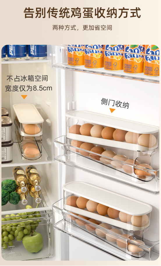 双层大容量 一个大约可以收纳12个-14个鸡蛋🥚 其次,这款收纳盒不占冰箱空间🉑 宽度仅约8.5cm,放在冰箱侧门也OK 斜坡设计自动补位 拿取也是炒鸡方便